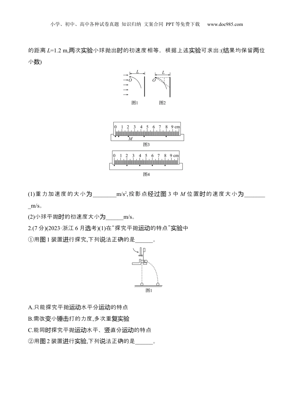小学、初中、高中各种试卷真题知识归纳文案合同PPT等免费下载www.doc985.com实验抢分专练(五)探究平抛运动的特点(40分钟30分)1.(7分)(2023·林模榆拟)甲某管口出水方向可的桶装水取水器图为种调电动,某小利用实验组平抛律量取水器取水的流量运动规测该时(位流出水的体单时间内积)。方案如下实验:(1)利用游卡尺量取水器出水管标测内径d,如乙所示图,读数为________mm;(2)取水器管口方向调节,使取水器后水管口启动从O点水平射出,如丙所示图;(3)待水在空中形成定的曲水柱后稳弯,水柱后方放置白底方格板紧贴(已知每正方格的个边长为L),利用手机正水柱拍照片并对摄,取水柱上的三点个a、b、c,如丙所示图;(4)已知地重力加速度大小当为g,根据丙可以算水管口图计从O点出的初速度喷时v=__________(用L、g行表示进);(5)由上述信息可算得出取水器取水的流量计时Q=____________(用L、g、d行表示进)。【加固】训练(2023·模青岛拟)某小了一究平抛的装置组设计个研运动实验,在抛出点O的正前方,直竖放置一毛玻璃。他利用不同的光源块们频闪,在小球抛出后的程中光源光运动过闪,在毛玻会璃上出小球的投影点现,在毛玻璃右用照相机行多次曝光边进,拍小球在毛玻璃上的投影照摄片。如图1,小明在O点左用水平的平行光源照射侧,得到的照片如图3;如图2,小一点红将个光源放在O点照射重新实验,得到的照片如图4,已知光源的光率均闪频为31Hz,光源到玻璃小学、初中、高中各种试卷真题知识归纳文案合同PPT等免费下载www.doc985.com的距离L=1.2m,次小球抛出的初速度相等。根据上述可求出两实验时实验:(果均保留位结两小数)(1)重力加速度的大小为________m/s2,投影点经过图3中M位置的速度大小时为________m/s。(2)小球平抛的初速度大小时为______m/s。2.(7分)(2023·浙江6月考选)(1)在“探究平抛的特点”中运动实验①用图1装置行探究进,下列法正确的是说______。A.只能探究平抛水平分的特点运动运动B.需改小打的力度变锤击,多次重复实验C.能同探究平抛水平、直分的特点时运动竖运动②用图2装置行进实验,下列法正确的是说______。小学、初中、高中各种试卷真题知识归纳文案合同PPT等免费下载www.doc985.comA.斜槽道轨M必光滑且其末端水平须B.上下板调节挡N必每次等距移时须间动C.小球斜槽钢从M上同一位置止下静滚③用图3装置行进实验,直板上附有和白竖挡复写纸纸,可以下球撞板的点迹。记钢击挡时实直板初始位置靠斜槽末端验时竖挡紧,球斜槽上钢从P点止下静滚,撞板留下点迹击挡0,将挡板依次水平向右移动x,重复实验,板上留下点迹挡1、2、3、4。以点迹0坐原点为标,直向竖下建立坐标轴y,各点迹坐分标值别为y1、y2、y3、y4。得球直测钢径为d,球平抛初速度则钢v0为______。A.(x+d2)❑√g2y1B.(x+d2)❑√gy2-y1C.(3x-d2)❑√g2y4D.(4x-d2)❑√g2y4(2)如图4所示,某同把学A、B根不同的簧串接直挂两弹竖悬,探究A、B簧力伸量的弹弹与长系。在关B簧下端依次挂上量弹质为m的钩码,止指所指刻度静时针xA、xB的据如表。数钩码个数012…xA/cm7.758.539.30…xB/cm16.4518.5220.60…钩码个数为1时,簧弹A的伸量长ΔxA=________cm,簧弹B的伸量长ΔxB=______cm,根簧两弹性能的增加量弹势ΔEp______mg(ΔxA+ΔxB)(“选填=”“<”或“>”)。小学、初中、高中各种试卷真题知识归纳文案合同PPT等免费下载www.doc985.com3.(8分)(2022·福建考选择)某小利用实验组图(a)所示装置小球平抛的特点验证运动,实验时,先斜槽固定在有和白的木板将贴复写纸纸边缘,槽口水平使木板直调节并竖;把小球放在槽口处,用下小球在槽口球心在木板上的水平投影点铅笔记时O,建立xOy坐系标,然后斜槽上固定从的位置放小球释,小球落到板上在白上留下印迹挡并纸,上下板行多次调节挡进实验,束实验结后,量各印迹中心点测O1、O2、O3…的坐标,入表格中并填,算的计对应x2。值目项O1O2O3O4O5O6y/cm2.956.529.2713.2016.6119.90x/cm5.958.8110.7412.4914.0515.28x2/cm235.477.6115.3156.0197.4233.5(1)根据表中据数,在图(b)出的坐上上给标纸补O4据点数,制“并绘y-x2”。图线小学、初中、高中各种试卷真题知识归纳文案合同PPT等免费下载www.doc985.com(2)由y-x2可知图线,小球下落的高度y...