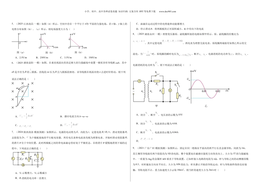 小学、初中、高中各种试卷真题知识归纳文案合同PPT等免费下载www.doc985.com绝密★启用前2025届高考物理一轮复习阶段检测卷二电磁学学综合考试范围:力学综合;考试时间:75分钟;满分:100分注意事项:1.答题前填写好自己的姓名、班级、考号等信息2.请将答案正确填写在答题卡上一、选择题(其中1—7题为单项选择题,8—10题为多项选择题)1.(2024·天津和平·三模)“中国天眼”位于贵州的大山深处,它通过接收来自宇宙深处的电磁波,探索宇宙。关于电磁波下列说法正确的是()A.机场安检是利用射线穿透本领强的特点来探测行李箱中的物品B.机械波在介质中的波速与频率无关,电磁波在介质中的波速与频率有关C.麦克斯韦电磁理论告诉我们,变化的电场一定产生变化的磁场D.所有物体都发射红外线,因此可利用红外线设计防伪措施2.(2025·浙江·一模)如图所示,为高中物理实验室常用的磁电式电流表的内部结构,基本组成部分是磁体和放在磁体两极之间的线圈,其物理原理就是通电线圈因受安培力而转动。电流表的两磁极装有极靴,极靴中间还有一个用软铁制成的圆柱。关于磁电式电流表,下列说法正确的是()A.铁质圆柱内部磁感应强度为零B.线圈的磁通量始终为零C.线圈转动时,螺旋弹簧变形,反抗线圈转动D.电流不为零,线圈停止转动后不再受到安培力3.(2024·湖南衡阳·模拟预测)热膨胀是很多材料的性质,对材料的热膨胀现象的研究一直是科技领域研究工作中的热点问题。但有些材料因热膨胀导致的尺寸变化很小,难以测量。某同学设计制作了电容热膨胀检测仪,原理如图所示。电容器上极板固定,下极板可随材料竖直方向的尺度变化而上下移动。现在测量某材料的热膨胀,将待测材料平放在加热器上进行加热使其温度升高,闭合开关,下列说法中正确的是()A.极板所带电荷量降低B.检测到灵敏电流计的电流方向为从到,说明被测材料出现了反常膨胀(温度升高,高度变小)C.滑动变阻器滑片向上滑动少许可以提高检测仪的工作电压D.检测结束,断开开关,灵敏电流计上有从到的短暂电流4.(2024·广西柳州·模拟预测)如图是用电流传感器(相当于电流表,其电阻可以忽略不计)研究自感现象的实验电路,图中两个电阻的阻值均为R,L是一个自感系数足够大的自感线圈,其直流电阻值也为R。某同学画出的在时刻开关S切换前后,通过传感器的电流随时间变化的图像。关于这些图像,下列说法中正确的是()A.甲图是开关S由断开变为闭合,通过传感器1的电流随时间变化的情况B.乙图是开关S由断开变为闭合,通过传感器1的电流随时间变化的情况C.丙图是开关S由闭合变为断开,通过传感器2的电流随时间变化的情况D.丁图是开关S由闭合变为断开,通过传感器2的电流随时间变化的情况小学、初中、高中各种试卷真题知识归纳文案合同PPT等免费下载www.doc985.com5.(2025·江西南昌·一模)如图(a)所示,空间中存在一个平行于xOy平面的匀强电场。若x轴、y轴上的电势分布如图(b)、(c)所示,则电场强度大小为()A.2.5V/mB.250V/mC.3.5V/mD.350V/m6.(2025·湖南益阳·一模)如图,在垂直纸面向里的足够大的匀强磁场中放置一硬质异形导线框oab,其中ab是半径为R的圆弧,直线段oa长为R且与圆弧段相切。该导线框在纸面内绕o点逆时针转动,则下列说法正确的是()A.B.感应电流方向b→a→oC.D.7.(2024·陕西商洛·模拟预测)如图所示,电源的电动势为E、内阻为r,定值电阻R1=R3=r,滑动变阻器R2总阻值为2r,为下极板接地的平行板电容器,所有电压表和电流表均视为理想电表。开始时滑动变阻器R2的滑片P位于中间位置,此时两极板之间的带电油滴Q恰好处于平衡状态。在将滑片P缓慢地滑到下端的过程中,下列说法正确的是()A.V1示数增大,V2示数减小B.R2消耗的电功率一直增大C.油滴在运动过程中的电势能和动能都增大D.停止滑动P,将两极板的正对面积减小,R3中有向下的电流8.(2025·湖南永州·一模)理想变压器原、副线圈所接的电路如图甲所示,原、副线圈的匝数比为,其中定值电阻,两电表为理想交流电表,原线圈两端接有如图乙所示的交流电。当时,原线圈的瞬时电压为。断开,电源消...