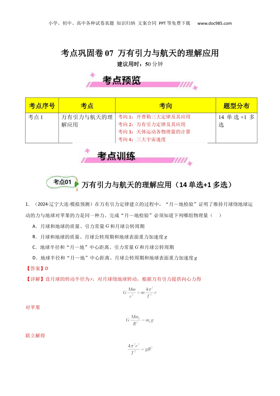 小学、初中、高中各种试卷真题知识归纳文案合同PPT等免费下载www.doc985.com考点巩固卷07万有引力与航天的理解应用建议用时:50分钟考点序号考点考向题型分布考点1万有引力与航天的理解应用考向1:开普勒三大定律及其应用考向2:万有引力定律及其应用考向3:天体运动各物理量的计算考向4:三大宇宙速度14单选+1多选万有引力与航天的理解应用(14单选+1多选)1.(2024·辽宁大连·模拟预测)在万有引力定律建立的过程中,“月—地检验”证明了维持月球绕地球运动的力与地球对苹果的力是同一种力。完成“月—地检验”必须知道下列哪组物理量()A.月球和地球的质量、引力常量G和月球公转周期B.月球和地球的质量、月球公转周期和地球表面重力加速度gC.地球半径和“月—地”中心距离、引力常量G和月球公转周期D.地球半径和“月—地”中心距离、月球公转周期和地球表面重力加速度g【答案】D【详解】设月球的转动半径为r,对月球绕地球转动,根据万有引力提供向心力得对苹果联立解得小学、初中、高中各种试卷真题知识归纳文案合同PPT等免费下载www.doc985.com若要检查两力为同一种力,由上式可知,需要知道地球半径R,和“月-地”中心距离r,月球公转周期T,和地球表面重力加速度g。故D正确,ABC错误。故选D。2.(2024·贵州贵阳·三模)亚地球行星GJ367b是一颗超轻、超快的系外行星,该行星的半径为地球半径的72%,质量为地球质量的55%。若取,则该行星的表面重力加速度约为()A.B.C.D.【答案】B【详解】在星球表面有则该行星的表面重力加速度约为故选B。3.(2024·江苏·模拟预测)帝企鹅是南极常见的一种动物,如图所示的是一只处在南极极点的帝企鹅。如果把地球看成一个均匀的球体,关于此帝企鹅与重力有关的问题,下列说法中正确的是()A.帝企鹅受到的重力的方向一定指向地心B.帝企鹅受到的重力的方向一定偏离地心小学、初中、高中各种试卷真题知识归纳文案合同PPT等免费下载www.doc985.comC.帝企鹅对地面的压力就是其受到的重力D.帝企鹅受到的重力小于地球对它的吸引力【答案】A【详解】AB.重力的方向竖直向下,由于把地球看成一个均匀的球体,则帝企鹅受到的重力的方向一定指向地心,故A正确,B错误;C.帝企鹅对地面的压力的受力物体是地球,帝企鹅的重力的受力物体是企鹅,压力与重力作用在不同物体上,因此,不能够认为帝企鹅对地面的压力就是其受到的重力,故C错误;D.由于帝企鹅处在南极极点,帝企鹅相对于地心处于静止状态,并没有随地球自转,则帝企鹅受到的重力等于地球对它的吸引力,故D错误。故选A。4.(2024·贵州·一模)如图所示,点L1和点L2称为地月连线上的拉格朗日点。在拉格朗日点处的物体在地球与月球的共同作用下,可与月球同步绕地球转动。中国探月工程中的“鹊桥号”中继卫星是世界上首颗运行于地月拉格朗日点L2的通信卫星,已知地球质量是月球质量的81倍,地月球心距离约为L2点与月球球心距离的6倍,则地球对“鹊桥号”中继卫星的引力与月球对“鹊桥号”中继卫星的引力大小之比约为()A.B.C.D.【答案】B【详解】由万有引力定律及题设条件可知所求两个引力的大小之比约为故选B。5.(2024·山东济南·三模)2024年3月20日,“鹊桥二号”中继星由长征八号遥三运载火箭在中国文昌航天发射场成功发射升空。如图所示,“鹊桥二号”临近月球时,先在周期为24小时的环月大椭圆冻结轨小学、初中、高中各种试卷真题知识归纳文案合同PPT等免费下载www.doc985.com道Ⅰ上运行一段时间,而后在近月点变轨,进入周期为12小时的环月大椭圆冻结轨道Ⅱ。已知轨道Ⅰ的近月点距离月球表面的高度为,远月点距离月球表面的高度为,月球半径为,,忽略地球引力的影响,则轨道Ⅱ的远月点距离月球表面的高度为()A.B.C.D.【答案】A【详解】在两个轨道上运动时,根据开普勒第三定律有解得故选A。6.(2024·全国·模拟预测)关于开普勒行星运动定律,下列说法中正确的是()A.开普勒通过自己的长期观测,记录了大量数据,通过对数据的研究总结出了行星运动定律小学、初中、高中各种试卷真题知识归纳文案合同PPT等免费下载www.doc985.comB.根据开普勒...