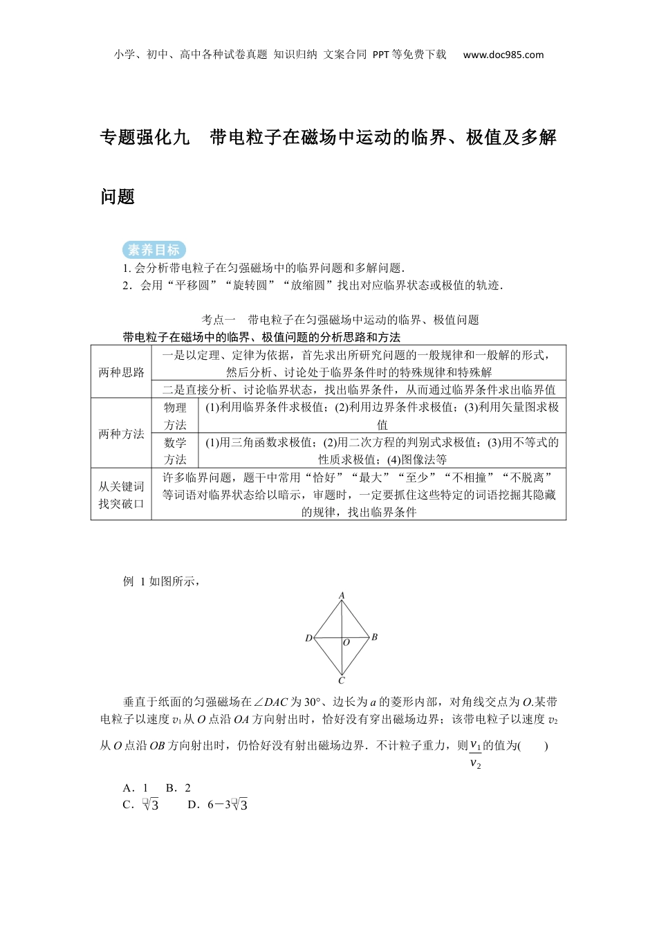 小学、初中、高中各种试卷真题知识归纳文案合同PPT等免费下载www.doc985.com专题强化九带电粒子在磁场中运动的临界、极值及多解问题1.会分析带电粒子在匀强磁场中的临界问题和多解问题.2.会用“平移圆”“旋转圆”“放缩圆”找出对应临界状态或极值的轨迹.考点一带电粒子在匀强磁场中运动的临界、极值问题带电粒子在磁场中的临界、极值问题的分析思路和方法两种思路一是以定理、定律为依据,首先求出所研究问题的一般规律和一般解的形式,然后分析、讨论处于临界条件时的特殊规律和特殊解二是直接分析、讨论临界状态,找出临界条件,从而通过临界条件求出临界值两种方法物理方法(1)利用临界条件求极值;(2)利用边界条件求极值;(3)利用矢量图求极值数学方法(1)用三角函数求极值;(2)用二次方程的判别式求极值;(3)用不等式的性质求极值;(4)图像法等从关键词找突破口许多临界问题,题干中常用“恰好”“最大”“至少”“不相撞”“不脱离”等词语对临界状态给以暗示,审题时,一定要抓住这些特定的词语挖掘其隐藏的规律,找出临界条件例1如图所示,垂直于纸面的匀强磁场在∠DAC为30°、边长为a的菱形内部,对角线交点为O.某带电粒子以速度v1从O点沿OA方向射出时,恰好没有穿出磁场边界;该带电粒子以速度v2从O点沿OB方向射出时,仍恰好没有射出磁场边界.不计粒子重力,则v1v2的值为()A.1B.2C.❑√3D.6-3❑√3小学、初中、高中各种试卷真题知识归纳文案合同PPT等免费下载www.doc985.com例2[2024·四川省成都市石室中高三三学诊]一匀强磁场的磁感应强度大小为B,方向垂直于纸面向外,其边界如图中虚线所示,ab=cd=2L,bc=de=L,一束H24e粒子在纸面内从a点垂直于ab射入磁场,这些粒子具有各种速率.不计粒子之间的相互作用.已知粒子的质量为m、电荷量为q.则粒子在磁场中运动时间最长的粒子,其运动速率为()A.3qBL4mB.5qBl4mC.5qBL8mD.5qBL6m例3(多选)[2024·西西安市模陕拟]2023年1月7日,中科院聚变大科学团队利用有“人造太阳”之称的全超导托卡马克大科学装置(EAST),发现并证明了一种新的高能量约束模式,对国际热核聚变实验堆和未来聚变堆运行具有重要意义.其基本原理是由磁场约束带电粒子运动,使之束缚在某个区域内.如图所示,环状磁场的内半径为R1,外半径为R2,被束缚的带电粒子的比荷为k,中空区域内带电粒子具有各个方向的速度,速度大小为v.中空区域中的带电粒子都不会穿出磁场的外边缘而被约束在半径为R2的区域内,不计粒子重力,则环状区域内磁场的磁感应强度大小可能是()A.vk(R2−R1)B.2R2vk(R22−R12)C.3vk(R2−R1)D.2R2vk(R2−R1)2考点二带电粒子在磁场中运动的多解问题带电粒子在洛伦兹力作用下做匀速圆周运动,由于带电粒子电性不确定、磁场方向不确定、临界状态不确定、运动的往复性造成带电粒子在有界匀强磁场中运动的多解问题.带电粒子在磁场中运动的多解问题解题思路:小学、初中、高中各种试卷真题知识归纳文案合同PPT等免费下载www.doc985.com(1)分析题目特点,确定题目多解的形成原因.(2)画出粒子的可能轨迹,找出圆心、半径的可能情况(全面考虑多种可能性).(3)若为周期性重复的多解问题,寻找通项式,若是出现几种解的可能性,注意每种解出现的条件.例4(多选)[2022·湖北卷]在如图所示的平面内,分界线SP将宽度为L的矩形区域分成两部分,一部分充满方向垂直于纸面向外的匀强磁场,另一部分充满方向垂直于纸面向里的匀强磁场磁感应强度大小均为B,SP与磁场左右边界垂直.离子源从S处射入速度大小不同的正离子,离子入射方向与磁场方向垂直且与SP成30°角.已知离子比荷为k,不计重力.若离子从P点射出,设出射方向与入射方向的夹角为θ,则离子的入射速度和对应θ角的可能组合为()A.13kBL,0°B.12kBL,0°C.kBL,60°D.2kBL,60°例5如图所示的等腰梯形区域存在垂直纸面向里的匀强磁场(图中未画出),磁感应强度大小为B,等腰梯形中∠P=45°,PQ=2MN=4L,一带电粒子束由M点沿垂直PM方向射入匀强磁场,带电粒子刚好不从PQ边界射出磁场,已知粒子的比荷为k,粒子的重力忽略不计.则下列说法正确的是()A.粒子的轨道半径可能...