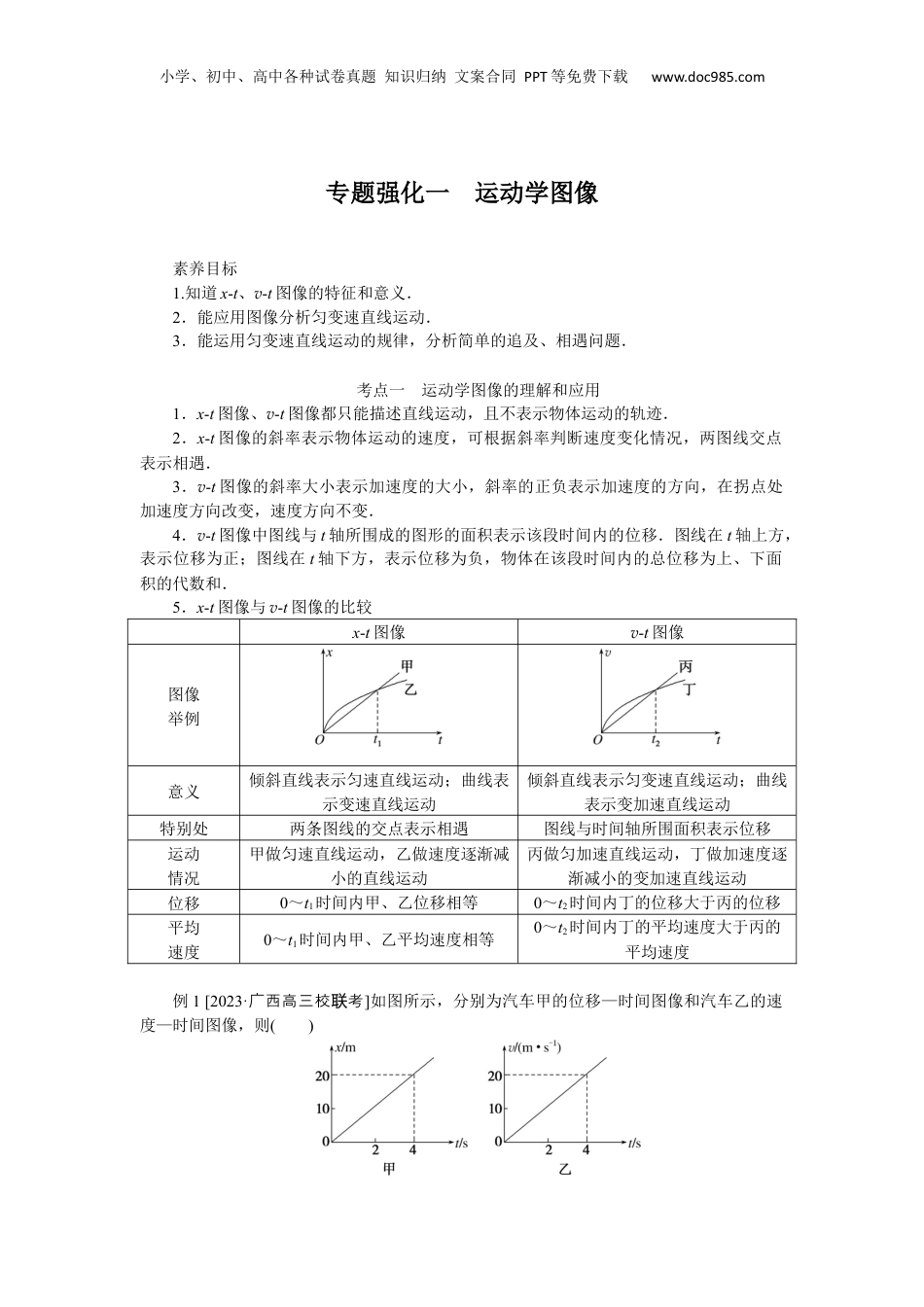 小学、初中、高中各种试卷真题知识归纳文案合同PPT等免费下载www.doc985.com专题强化一运动学图像素养目标1.知道x-t、v-t图像的特征和意义.2.能应用图像分析匀变速直线运动.3.能运用匀变速直线运动的规律,分析简单的追及、相遇问题.考点一运动学图像的理解和应用1.x-t图像、v-t图像都只能描述直线运动,且不表示物体运动的轨迹.2.x-t图像的斜率表示物体运动的速度,可根据斜率判断速度变化情况,两图线交点表示相遇.3.v-t图像的斜率大小表示加速度的大小,斜率的正负表示加速度的方向,在拐点处加速度方向改变,速度方向不变.4.v-t图像中图线与t轴所围成的图形的面积表示该段时间内的位移.图线在t轴上方,表示位移为正;图线在t轴下方,表示位移为负,物体在该段时间内的总位移为上、下面积的代数和.5.x-t图像与v-t图像的比较x-t图像v-t图像图像举例意义倾斜直线表示匀速直线运动;曲线表示变速直线运动倾斜直线表示匀变速直线运动;曲线表示变加速直线运动特别处两条图线的交点表示相遇图线与时间轴所围面积表示位移运动情况甲做匀速直线运动,乙做速度逐渐减小的直线运动丙做匀加速直线运动,丁做加速度逐渐减小的变加速直线运动位移0~t1时间内甲、乙位移相等0~t2时间内丁的位移大于丙的位移平均速度0~t1时间内甲、乙平均速度相等0~t2时间内丁的平均速度大于丙的平均速度例1[2023·广西高三校考联]如图所示,分别为汽车甲的位移—时间图像和汽车乙的速度—时间图像,则()小学、初中、高中各种试卷真题知识归纳文案合同PPT等免费下载www.doc985.comA.甲的加速度大小为5m/s2B.乙的加速度大小为5m/s2C.甲在4s内的位移大小为40mD.乙在4s内的位移大小为20m[解心得题]例2(多选)图甲所示是一款能够与人协作、共同完成冰壶比赛的机器人.当机器人与冰壶之间的距离保持在8m之内时,机器人可以实时追踪冰壶的运动信息.在某次投掷练习中机器人夹取冰壶,由静止开始做匀加速直线运动,之后释放冰壶,二者均做匀减速直线运动,冰壶准确命中目标,二者在整个运动过程中的v-t图像如图乙所示.关于此次投掷,下列说法中正确的是()A.冰壶做匀减速直线运动时的加速度大小为0.125m/s2B.9s末,冰壶的速度大小为5.75m/sC.7s末,冰壶、机器人二者间距为7mD.机器人能够一直准确获取冰壶的运动信息[解教你决问题]审题读图[解心得题]思维提升读图——获取解题信息第一层确认纵、横坐标轴对应的物理量及其单位;注意纵、小学、初中、高中各种试卷真题知识归纳文案合同PPT等免费下载www.doc985.com关注坐标轴横坐标是否从零刻度开始第二层理解截距、斜率、面积图线在坐标轴上的截距表示运动的初始情况斜率通常能够体现某个物理量(如v-t图像的斜率反映了加速度)的大小、方向及变化情况最常见的是v-t图像中图像与时间轴所围面积表示位移,但要注意时间轴下方的面积为负,说明这段位移与正方向相反第三层分析交点、转折点、渐近线交点往往是解决问题的切入点,注意交点表示物理量相等,不一定代表物体相遇转折点表示物理量发生突变,满足不同的函数关系式,如v-t图像中速度由增变减,表明加速度突然反向利用渐近线可以求出该物理量的极值或确定它的变化趋势例3(多选)甲、乙两人骑车沿同一平直公路运动,t=0时经过路边的同一路标,下列位移—时间(x-t)图像和速度—时间(v-t)图像对应的运动中,甲、乙两人在t0时刻之前能再次相遇的是()[解心得题]例4某驾校学员在教练的指导下沿直线路段练习驾驶技术,汽车的位置x与时间t的关系如图所示,则汽车行驶速度v与时间t的关系图像可能正确的是()小学、初中、高中各种试卷真题知识归纳文案合同PPT等免费下载www.doc985.com[解心得题]思维提升(1)解像的一般流程:决图转换类问题(2)要注意用解析法和排除法,者合提高像型的解准确率和速度应两结选择题图类题题.考点二x-t、v-t图像中的曲线问题1.x-t图像中的曲线问题(1)一般曲线①曲线不表示物体做曲线运动,而是表示物体做变速直线运动;②一段割线的斜率等于平均速度,某点切线斜率等于瞬时速度;③注意路程和位移的区别.0~t1,路程等于位移大小(x1);0~t2,路程(2x1-x2)大于位移大小(x...