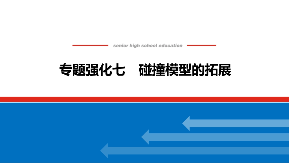 专题强化七碰撞模型的拓展1.会分析、计算“滑块—弹簧”模型有关问题.2.理解“滑块—斜(曲)面”模型与碰撞的相似性,会解决相关问题.3.会用动量观点和能量观点分析计算“子弹打木块”.考点一考点二考点三考点一考点一“滑块—弹簧”模型1.模型图示2.模型特点(1)动量守恒:两个物体与弹簧相互作用的过程中,若系统所受外力的矢量和为零,则系统动量守恒.(2)机械能守恒:系统所受的外力做功为零,除弹簧弹力以外的内力不做功,系统机械能守恒.(3)弹簧处于最长(最短)状态时两物体速度相等,弹性势能最大,系统动能通常最小(相当于完全非弹性碰撞,两物体减少的动能转化为弹簧的弹性势能).例1[2024·山日照市模东拟]A、B小球止在光滑水平面上,两静用水平簧相接,轻弹连A、B球的量分两质别为m和M(m<M).若使A球得瞬速度获时v(如甲图),簧到最短的度弹压缩时长为L1;若使B球得瞬速度获时v(如乙图),簧到最短的度弹压缩时长为L2,则L1与L2的大小系关为()A.L1>L2B.L1<L2C.L1=L2D.不能确定答案:C答案:ACD考点二考点二“滑块—斜(曲)面”模型1.模型图示答案:ACD答案:AD考点三考点三“滑块—木板”模型模型图示模型特点例5如图所示,在光滑的水平桌面上静止放置一个质量为980g的长方形匀质木块,现有一颗质量为20g的子弹以大小为300m/s的水平速度沿木块的中心轴线射向木块,最终留在木块中,和木块一起以共同的速度运动.已知木块沿子弹运动方向的长度为10cm,子弹打进木块的深度为6cm.设木块对子弹的阻力保持不变.(1)求子弹和木块的共同速度以及它们在此过程中所产生的内能.(2)若子弹是以大小为400m/s的水平速度从同一方向水平射向该木块,则在射中木块后能否射穿该木块?(1)求木板刚接触弹簧时速度v1的大小及木板运动前右端距弹簧左端的距离x1;(2)求木板与弹簧接触以后,物块与木板之间即将相对滑动时弹簧的压缩量x2及此时木板速度v2的大小;(3)已知木板向右运动的速度从v2减小到0所用时间为t0.求木板从速度为v2时到之后与物块加速度首次相同的过程中,系统因摩擦转化的内能ΔU(用t0表示).[解教你决问题]解审题图过程1:m1、m2成的系量守恒,由量守恒定律、牛第组统动动顿二定律和公式解;运动学题过程2:m1、m2成的系在簧力作用下速,由牛第二组统弹弹减顿定律和系能定理解;统动题过程3:m1、m2分以不同的加速度速,然后反向以不同的加别减速度加速,直到加速度相同,由量定理和系能量守恒定律解.动统题核心素养提升答题要规范,得分有技巧1.在书写答案时,应采用简洁的文字说明与方程式相结合的方式.2.在解题过程中,必须使用题目中给出的物理量,若题目中未给出某些物理量,则需根据题意设定,并明确其物理含义,且采用通用的符号表示.3.在列方程式时,应使用原始公式,不应使用导出公式而导致失分.4.在列方程式时,应分步进行,不要列综合式或连等式,因阅卷时是要按式给分.5.在解答过程中,应准确写出表达式和结果,而不必写出代入数据和运算过程.6.若遇到实在不会做的题目,可以将题中可能用到的公式全部列出,评分时可能据所列出的公式是否正确,“踩点”给分.典例在竖直平面内,质量为m1=0.1kg的小球A用长为l=0.5m的不可伸长的细线悬挂于O点,光滑水平地面到O点的距离为h=0.5m,在O点正下方放置一质量为m2=0.1kg的小球B.C为一固定的半径为R=0.1m的光滑半圆弧槽.把小球A拉到如图所示位置,细线恰好伸直,且细线与竖直方向的夹角α=37°.由静止释放小球A,当细线再次伸直时,小球沿细线方向的速度瞬间变为0.两小球的碰撞为弹性碰撞,且两球都可视为质点,忽略空气阻力,取g=10m/s2,sin37°=0.6,cos37°=0.8.(1)求小球A由静止释放后,细线再次伸直前瞬间,小球A的速度大小;(2)判断小球B能否到达半圆弧槽最高点D,如果不能,请说明理由;如果能,求出小球B对半圆弧槽D点的压力大小.[解教你决问题]