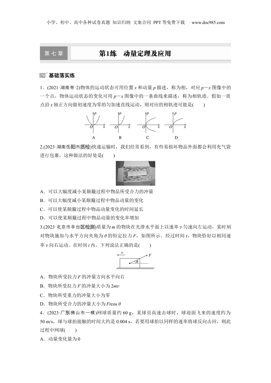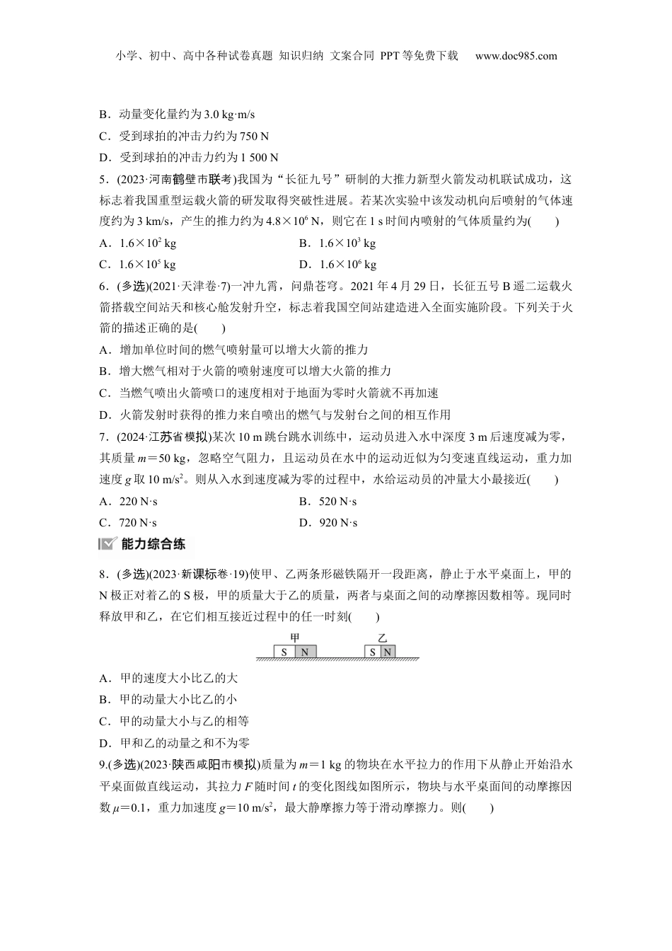 小学、初中、高中各种试卷真题知识归纳文案合同PPT等免费下载www.doc985.com1.(2021·湖南卷·2)物体的运动状态可用位置x和动量p描述,称为相,对应p-x图像中的一个点。物体运动状态的变化可用p-x图像中的一条曲线来描述,称为相轨迹。假如一质点沿x轴正方向做初速度为零的匀加速直线运动,则对应的相轨迹可能是()2.(2023·湖南岳市阳质检)快递运输时,我们经常看到,有些易损坏物品外面都会利用充气袋进行包裹,这种做法的好处是()A.可以大幅度减小某颠簸过程中物品所受合力的冲量B.可以大幅度减小某颠簸过程中物品动量的变化C.可以使某颠簸过程中物品动量变化的时间延长D.可以使某颠簸过程中物品动量的变化率增加3.(2023·北京市丰台区检测)质量为m的物块在光滑水平面上以速率v匀速向左运动,某时刻对物块施加与水平方向夹角为θ的恒定拉力F,如图所示。经过时间t,物块恰好以相同速率v向右运动。在时间t内,下列说法正确的是()A.物块所受拉力F的冲量方向水平向右B.物块所受拉力F的冲量大小为2mvC.物块所受重力的冲量大小为零D.物块所受合力的冲量大小为Ftcosθ4.(2023·广佛山市一模东)网球质量约60g,某球员高速击球时,球迎面飞来的速度约为50m/s,球与球拍接触的时间大约是0.004s,若要用球拍以同样的速率将球反向击回,则此过程中网球()A.动量变化量为0小学、初中、高中各种试卷真题知识归纳文案合同PPT等免费下载www.doc985.comB.动量变化量约为3.0kg·m/sC.受到球拍的冲击力约为750ND.受到球拍的冲击力约为1500N5.(2023·河南壁市考鹤联)我国为“长征九号”研制的大推力新型火箭发动机联试成功,这标志着我国重型运载火箭的研发取得突破性进展。若某次实验中该发动机向后喷射的气体速度约为3km/s,产生的推力约为4.8×106N,则它在1s时间内喷射的气体质量约为()A.1.6×102kgB.1.6×103kgC.1.6×105kgD.1.6×106kg6.(多选)(2021·天津卷·7)一冲九霄,问鼎苍穹。2021年4月29日,长征五号B遥二运载火箭搭载空间站天和核心舱发射升空,标志着我国空间站建造进入全面实施阶段。下列关于火箭的描述正确的是()A.增加单位时间的燃气喷射量可以增大火箭的推力B.增大燃气相对于火箭的喷射速度可以增大火箭的推力C.当燃气喷出火箭喷口的速度相对于地面为零时火箭就不再加速D.火箭发射时获得的推力来自喷出的燃气与发射台之间的相互作用7.(2024·江省模苏拟)某次10m跳台跳水训练中,运动员进入水中深度3m后速度减为零,其质量m=50kg,忽略空气阻力,且运动员在水中的运动近似为匀变速直线运动,重力加速度g取10m/s2。则从入水到速度减为零的过程中,水给运动员的冲量大小最接近()A.220N·sB.520N·sC.720N·sD.920N·s8.(多选)(2023·新卷课标·19)使甲、乙两条形磁铁隔开一段距离,静止于水平桌面上,甲的N极正对着乙的S极,甲的质量大于乙的质量,两者与桌面之间的动摩擦因数相等。现同时释放甲和乙,在它们相互接近过程中的任一时刻()A.甲的速度大小比乙的大B.甲的动量大小比乙的小C.甲的动量大小与乙的相等D.甲和乙的动量之和不为零9.(多选)(2023·西咸市模陕阳拟)质量为m=1kg的物块在水平拉力的作用下从静止开始沿水平桌面做直线运动,其拉力F随时间t的变化图线如图所示,物块与水平桌面间的动摩擦因数μ=0.1,重力加速度g=10m/s2,最大静摩擦力等于滑动摩擦力。则()小学、初中、高中各种试卷真题知识归纳文案合同PPT等免费下载www.doc985.comA.在t=2s时,物块的动量大小为1kg·m/sB.在t=4s时,物块的速度为0C.在0~2s内和2~5s内,物块动量的变化量大小之比为3∶2D.在0~5s内,物块的最大速度为1.5m/s10.(2022·湖北卷·7)一质点做曲线运动,在前一段时间内速度大小由v增大到2v,在随后的一段时间内速度大小由2v增大到5v。前后两段时间内,合外力对质点做功分别为W1和W2,合外力的冲量大小分别为I1和I2。下列关系式一定成立的是()A.W2=3W1,I2≤3I1B.W2=3W1,I2≥I1C.W2=7W1,I2≤3I1D.W2=7W1,I2≥I111.2021年6月17日,我国神舟十二号载人飞船发射成功,3名航天员进驻“天宫号”空间站的“天和号”核心舱,标志着我国...