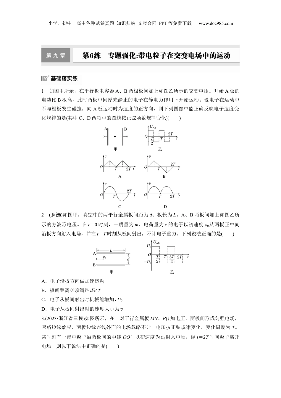 小学、初中、高中各种试卷真题知识归纳文案合同PPT等免费下载www.doc985.com1.如图甲所示,在平行板电容器A、B两极板间加上如图乙所示的交变电压。开始A板的电势比B板高,此时两板中间原来静止的电子在静电力作用下开始运动。设电子在运动中不与极板发生碰撞,向A板运动时为速度的正方向,则下列图像中能正确反映电子速度变化规律的是(其中C、D两项中的图线按正弦函数规律变化)()2.(多选)如图甲,真空中的两平行金属板间距为d、板长为L。A、B两板间加上如图乙所示的方波形电压。在t=0时刻,一质量为m、电荷量为e的电子以初速度v0从两板正中间沿板方向射入电场,并在t=T时刻从板间射出,不计电子重力。下列说法正确的是()A.电子沿板方向做加速运动B.板间距离必须满足d≥TC.电子从板间射出时机械能增加eU0D.电子从板间射出时的速度大小为v03.(2023·浙江省三模)如图所示,在一对平行金属板MN、PQ加电压,两板间形成匀强电场,忽略边缘效应,两板边缘连线外面的电场忽略不计,电压按正弦规律变化,变化周期为T。某时刻有一带电粒子沿两板间的中线OO′以初速度为v0射入电场,经t=2T时间粒子离开电场。则以下说法中正确的是()小学、初中、高中各种试卷真题知识归纳文案合同PPT等免费下载www.doc985.comA.粒子一定从O′点离开电场B.粒子离开电场时的速度一定大于v0C.粒子离开电场时的速度可能小于v0D.粒子在0~T内的位移一定等于在T~2T内的位移4.(2023·云南省考联)如图甲,一带电粒子沿平行板电容器中线MN以速度v平行于极板进入(记为t=0时刻),同时在两板上加一按图乙变化的电压。已知粒子比荷为k,带电粒子只受静电力的作用且不与极板发生碰撞,经过一段时间,粒子以平行极板方向的速度射出。则下列说法中正确的是()A.粒子射出时间可能为t=4sB.粒子射出的速度大小为2vC.极板长度满足L=3vn(n=1,2,3,…)D.极板间最小距离为5.(多选)(2024·江省模苏拟)如图甲所示,直线加速器由一个金属圆板(序号为0)和多个横截面积相同的金属圆筒组成,序号为奇数的圆筒和电源的一极相连,圆板和序号为偶数的圆筒和该电源的另一极相连,交变电源两极间电势差的变化规律如图乙所示。若电压的绝对值为U,电子电荷量大小为e,电子通过圆筒间隙的时间可以忽略不计。在t=0时刻,圆板中央的一个电子在圆板和圆筒之间的电场中由静止开始加速,沿中心轴线冲进圆筒1,电子在每个圆筒中运动的时间均小于T,且电子均在电压变向时恰从各圆筒中射出,不考虑相对论效应,则()A.在t=奇筒相偶筒的差时数圆对数圆电势为负值B.由于静电屏蔽作用,圆筒内不存在电场小学、初中、高中各种试卷真题知识归纳文案合同PPT等免费下载www.doc985.comC.电子运动到第n个圆筒时动能为(n-1)eUD.第n个和第n+1个圆筒的长度之比为∶6.(2023·黑江哈尔哈九中三模龙滨)实验小组用如图甲所示装置研究带电粒子在两个平行金属板间的运动,已知板长为L,两板间距d未知,将放射源P靠近平行金属板,放射出的带电粒子沿平行金属板A、B的中轴线MN射入板间,平行金属板A、B间加有如图乙所示的交变电压,已知电压U0,周期T未知,当电压稳定时,板间是匀强电场。质量为m、电荷量为q的粒子以v0的速率在T时刻从M点进入板间,T时刻离开金属板,运动过程中恰好不与金属板碰撞(粒子重力忽略不计)。求:平行板A、B的间距d是多少?7.(2023·江南京市期中苏)如图甲所示,电子枪连续不断均匀地发出电子(设电子的初速度为零),经加速电压为U1的加速电场加速后由小孔穿出,沿两个距离为d的水平金属板A、B间的中线射入偏转电场,A、B两板间加如图乙所示的周期性变化的电压UAB,电压变化周期为T,正半周UAB为U0,负半周UAB为-3U0。已知电子质量为m、电荷量为-e,A、B极板长为,所有子都能离偏,不子的重力及子的相互作用力。求:电开转电场计电电间小学、初中、高中各种试卷真题知识归纳文案合同PPT等免费下载www.doc985.com(1)电子经过偏转电场的时间t;(2)从t=0时刻射入偏转电场的电子在进、出偏转电场过程中电势能的变化量ΔEp;(3)在足够长的时间内从中线下方离开偏转电场的电子数占电子总数的比例η。第6练专题强化:带电粒...
