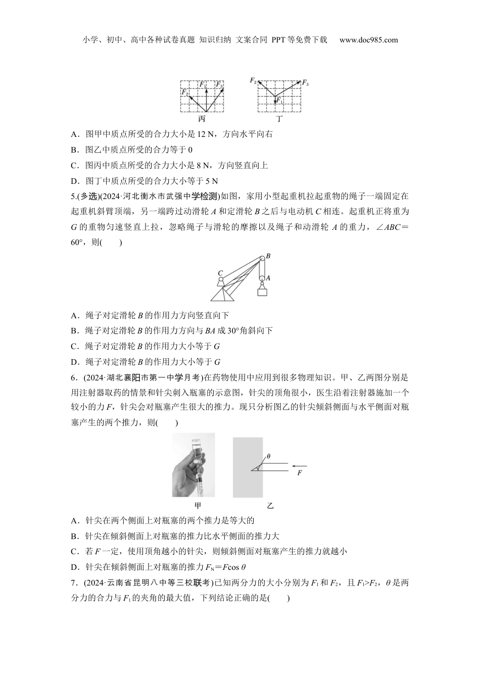 小学、初中、高中各种试卷真题知识归纳文案合同PPT等免费下载www.doc985.com1.三个共点力大小分别是F1、F2、F3,关于它们合力F的大小,下列说法正确的是()A.F大小的取值范围一定是0≤F≤F1+F2+F3B.F至少比F1、F2、F3中的某一个力大C.若F1∶F2∶F3=3∶6∶8,只要适当调整它们之间的夹角,一定能使合力为零D.若F1∶F2∶F3=3∶6∶2,只要适当调整它们之间的夹角,一定能使合力为零2.(2021·重卷庆·1)如图所示,人游泳时若某时刻手掌对水的作用力大小为F,该力与水平方向的夹角为30°,则该力在水平方向的分力大小为()A.2FB.FC.FD.F3.用两根等长轻绳将木板挂在竖直木桩上等高的两点,制成一简易秋千。某次维修时将两轻绳各剪去一小段,但仍保持两绳等长且悬点不变。木板静止时,F1表示木板所受合力的大小,F2表示单根轻绳对木板拉力的大小,则维修后()A.F1不变,F2变大B.F1不变,F2变小C.F1变大,F2变大D.F1变小,F2变小4.(多选)(2023·四川市亭中一模绵阳盐学)图甲、乙、丙、丁所示的四种情况是某一质点在同一平面内同时受到的三个共点力,若坐标纸中每格边长表示1N的大小的力,则下列关于质点所受的合力的说法中正确的是()小学、初中、高中各种试卷真题知识归纳文案合同PPT等免费下载www.doc985.comA.图甲中质点所受的合力大小是12N,方向水平向右B.图乙中质点所受的合力等于0C.图丙中质点所受的合力大小是8N,方向竖直向上D.图丁中质点所受的合力大小等于5N5.(多选)(2024·河北衡水市武强中学检测)如图,家用小型起重机拉起重物的绳子一端固定在起重机斜臂顶端,另一端跨过动滑轮A和定滑轮B之后与电动机C相连。起重机正将重为G的重物匀速竖直上拉,忽略绳子与滑轮的摩擦以及绳子和动滑轮A的重力,∠ABC=60°,则()A.绳子对定滑轮B的作用力方向竖直向下B.绳子对定滑轮B的作用力方向与BA成30°角斜向下C.绳子对定滑轮B的作用力大小等于GD.绳子对定滑轮B的作用力大小等于G6.(2024·湖北襄市第一中月考阳学)在药物使用中应用到很多物理知识。甲、乙两图分别是用注射器取药的情景和针尖刺入瓶塞的示意图,针尖的顶角很小,医生沿着注射器施加一个较小的力F,针尖会对瓶塞产生很大的推力。现只分析图乙的针尖倾斜侧面与水平侧面对瓶塞产生的两个推力,则()A.针尖在两个侧面上对瓶塞的两个推力是等大的B.针尖在倾斜侧面上对瓶塞的推力比水平侧面的推力大C.若F一定,使用顶角越小的针尖,则倾斜侧面对瓶塞产生的推力就越小D.针尖在倾斜侧面上对瓶塞的推力FN=Fcosθ7.(2024·云南省昆明八中等三校考联)已知两分力的大小分别为F1和F2,且F1>F2,θ是两分力的合力与F1的夹角的最大值,下列结论正确的是()小学、初中、高中各种试卷真题知识归纳文案合同PPT等免费下载www.doc985.comA.sinθ=B.sinθ=C.tanθ=D.tanθ=8.(多选)(2024·广东广州市质检)耙在中国已有1500年以上的历史,北魏贾思勰著《齐民要术》称之为“铁齿楱”,将使用此农具的作业称作耙。如图甲所示,牛通过两根耙索拉耙沿水平方向匀速耙地。两根耙索等长且对称,延长线的交点为O1,夹角∠AO1B=60°,拉力大小均为F,平面AO1B与水平面的夹角为30°(O2为AB的中点),如图乙所示。忽略耙索质量,下列说法正确的是()A.两根耙索的合力大小为FB.两根耙索的合力大小为FC.地对耙的水平阻力大小为D.地对耙的水平阻力大小为9.磁力防盗扣的内部结构及原理如图所示,在锥形金属筒内放置四颗小铁珠(其余两颗未画出),工作时弹簧通过铁环将小铁珠挤压于金属筒的底部,同时,小铁珠陷于钉柱上的凹槽里,锁死防盗扣。当用强磁场吸引防盗扣的顶部时,铁环和小铁珠向上移动,防盗扣松开,已知锥形金属筒底部的圆锥顶角刚好是90°,弹簧通过铁环施加给每个小铁珠竖直向下的力F,小铁珠锁死防盗扣,每个小铁珠对钉柱产生的侧向压力大小为(不计摩擦以及小铁珠的重力)()A.FB.FC.FD.F10.如图所示,轻绳MN的两端固定在水平天花板上,物体A系在轻绳MN的某处,悬挂有物体B的光滑轻滑轮跨在轻绳MN上。系统静止时的几何关系如图,则A与B的质量之比为()小学、初中、高中各种试卷真题知识归纳文案合同PPT等免费...