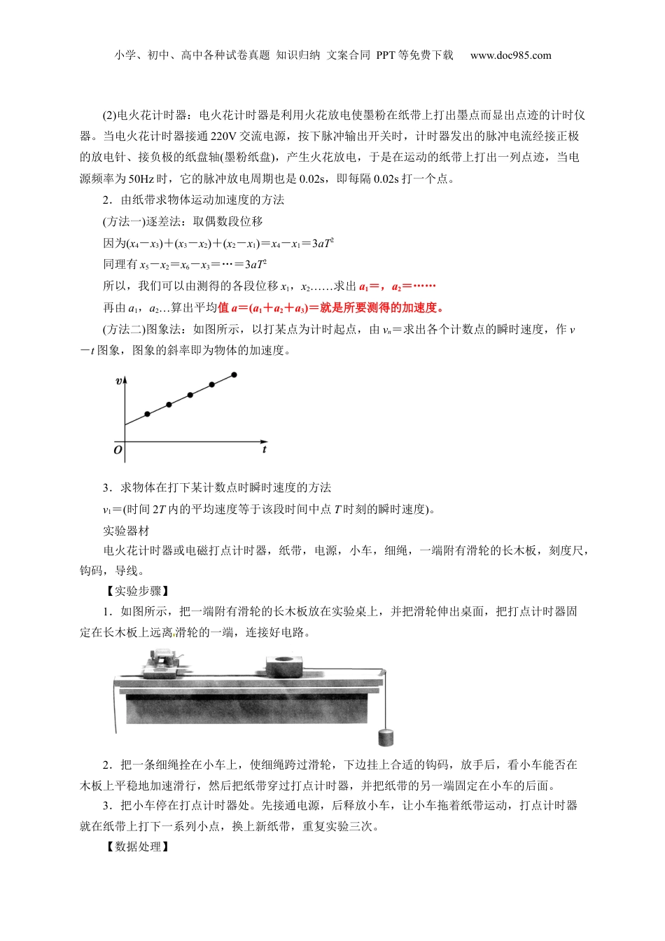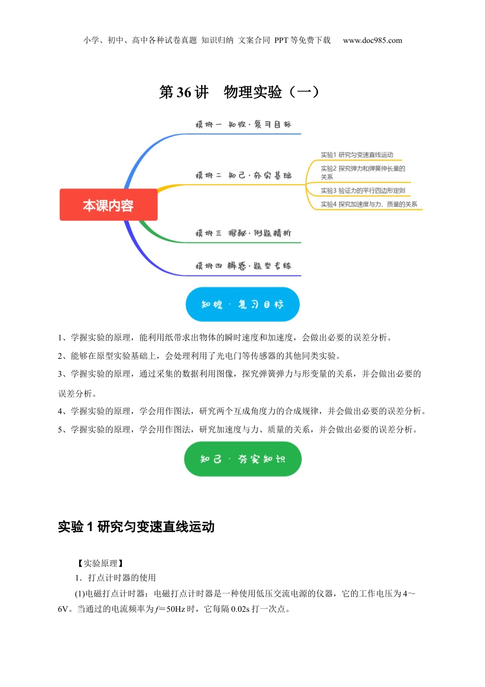 小学、初中、高中各种试卷真题知识归纳文案合同PPT等免费下载www.doc985.com第36讲物理实验(一)1、学握实验的原理,能利用纸带求出物体的瞬时速度和加速度,会做出必要的误差分析。2、能够在原型实验基础上,会处理利用了光电门等传感器的其他同类实验。3、学握实验的原理,通过采集的数据利用图像,探究弹簧弹力与形变量的关系,并会做出必要的误差分析。4、学握实验的原理,学会用作图法,研究两个互成角度力的合成规律,并会做出必要的误差分析。5、学握实验的原理,学会用作图法,研究加速度与力、质量的关系,并会做出必要的误差分析。实验1研究匀变速直线运动【实验原理】1.打点计时器的使用(1)电磁打点计时器:电磁打点计时器是一种使用低压交流电源的仪器,它的工作电压为4~6V。当通过的电流频率为f=50Hz时,它每隔0.02s打一次点。小学、初中、高中各种试卷真题知识归纳文案合同PPT等免费下载www.doc985.com(2)电火花计时器:电火花计时器是利用火花放电使墨粉在纸带上打出墨点而显出点迹的计时仪器。当电火花计时器接通220V交流电源,按下脉冲输出开关时,计时器发出的脉冲电流经接正极的放电针、接负极的纸盘轴(墨粉纸盘),产生火花放电,于是在运动的纸带上打出一列点迹,当电源频率为50Hz时,它的脉冲放电周期也是0.02s,即每隔0.02s打一个点。2.由纸带求物体运动加速度的方法(方法一)逐差法:取偶数段位移因为(x4-x3)+(x3-x2)+(x2-x1)=x4-x1=3aT2同理有x5-x2=x6-x3=…=3aT2所以,我们可以由测得的各段位移x1,x2……求出a1=,a2=……再由a1,a2…算出平均值a=(a1+a2+a3)=就是所要测得的加速度。(方法二)图象法:如图所示,以打某点为计时起点,由vn=求出各个计数点的瞬时速度,作v-t图象,图象的斜率即为物体的加速度。3.求物体在打下某计数点时瞬时速度的方法v1=(时间2T内的平均速度等于该段时间中点T时刻的瞬时速度)。实验器材电火花计时器或电磁打点计时器,纸带,电源,小车,细绳,一端附有滑轮的长木板,刻度尺,钩码,导线。【实验步骤】1.如图所示,把一端附有滑轮的长木板放在实验桌上,并把滑轮伸出桌面,把打点计时器固定在长木板上远离滑轮的一端,连接好电路。2.把一条细绳拴在小车上,使细绳跨过滑轮,下边挂上合适的钩码,放手后,看小车能否在木板上平稳地加速滑行,然后把纸带穿过打点计时器,并把纸带的另一端固定在小车的后面。3.把小车停在打点计时器处。先接通电源,后释放小车,让小车拖着纸带运动,打点计时器就在纸带上打下一系列小点,换上新纸带,重复实验三次。【数据处理】小学、初中、高中各种试卷真题知识归纳文案合同PPT等免费下载www.doc985.com1.从三条纸带中选择一条比较理想的,舍掉开头一些比较密集的点,在后边便于测量的地方找一个开始点来确定计数点。为了计算方便和减小误差,通常用连续打五个点的时间作为时间单位,即T=0.1s。2.正确使用毫米刻度尺测量每相邻的两计数点间的距离,并填入表内,用逐差法求出加速度,最后求其平均值(请读者自己设计表格)。3.也可求出各计数点对应的瞬时速度,作出v-t图象,求直线的斜率,即物体运动的加速度。[例题1](2024•深圳一模)某同学利用打点计时器分析自身步行时的速度特征,把接在50Hz的交流电源上的打点计时器固定在与人腰部等高的桌面上,纸带穿过打点计时器限位孔,一端固定在人腰部。人沿直线步行时带动纸带运动,打点计时器记录人步行时的运动信息。(1)选取点迹清晰的纸带,每5个点取一个计数点,其中连续5个计数点A、B、C、D、E、F如图1所示。纸带中BC段的平均速度为vBC=m/s。(保留两位有效数字)(2)沿着计数点位置把纸带裁开并编号,按编号顺序把剪出的纸带下端对齐并排粘贴在坐标纸上,剪出的纸带长度代表打出这段纸带时间内的平均速度。把每段纸带上边中点连接成线,如图2所示,若用图中曲线描述人运动的速度一时间关系。如果用纵坐标表示速度大小,横坐标表示时间,则纸带的横宽d对应横坐标中的时间长度为s。请根据如图估算该同学的步幅为m。(保留两位有效数字)【解答】解:(1)相邻两个计数点间的时间间隔T=0.1s,纸带...