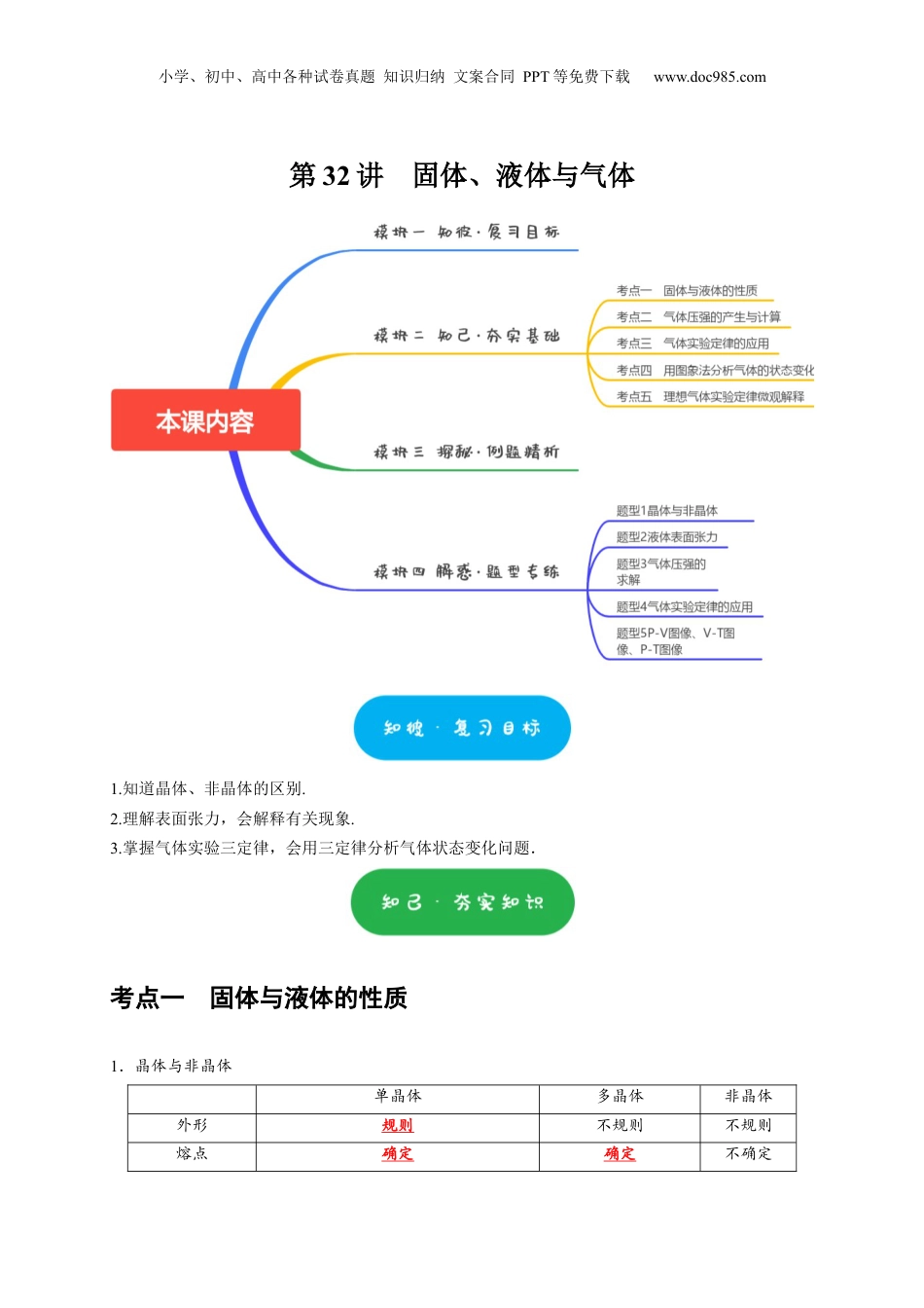 小学、初中、高中各种试卷真题知识归纳文案合同PPT等免费下载www.doc985.com第32讲固体、液体与气体1.知道晶体、非晶体的区别.2.理解表面张力,会解释有关现象.3.掌握气体实验三定律,会用三定律分析气体状态变化问题.考点一固体与液体的性质1.晶体与非晶体单晶体多晶体非晶体外形规则不规则不规则熔点确定确定不确定小学、初中、高中各种试卷真题知识归纳文案合同PPT等免费下载www.doc985.com物理性质各向异性各向同性各向同性典型物质石英、云母、食盐、硫酸铜玻璃、蜂蜡、松香形成与转化有的物质在不同条件下能够形成不同的形态.同一物质可能以晶体和非晶体两种不同的形态出现,有些非晶体在一定条件下可以转化为晶体.2.液体的表面张力(1)作用:液体的表面张力使液面具有收缩的趋势.(2)方向:表面张力跟液面相切,跟这部分液面的分界线垂直.3.液晶的物理性质(1)具有液体的流动性.(2)具有晶体的光学各向异性.(3)从某个方向看其分子排列比较整齐,但从另一方向看,分子的排列是杂乱无章的.[例题1](2024•台州二模)2024年1月底,台州迎来了近十年来最大的一场降雪,大地银装素裹。下列说法正确的是()A.毛绒绒的雪花是晶体B.雪花在空中飘舞做的是布朗运动C.雪花在风中飘落过程中机械能一直减小D.雪天路滑,汽车在转弯时易侧滑是因为受到离心力的作用[例题2](2024•汕头一模)半导体掺杂对于半导体工业有着举足轻重的作用,其中一种技术是将掺杂源物质与硅晶体在高温(800到1250摄氏度)状态下接触,掺杂源物质的分子由于热运动渗透进硅晶体的表面,温度越高掺杂效果越显著,下列说法正确的是()A.这种渗透过程是自发可逆的B.硅晶体具有光学上的各向同性C.这种渗透过程是分子的扩散现象D.温度越高掺杂效果越好是因为温度升高时,所有分子的热运动速率都增加小学、初中、高中各种试卷真题知识归纳文案合同PPT等免费下载www.doc985.com[例题3](2024•泰州模拟)关于下列各图所对应现象的描述,正确的是()A.图甲中水黾可以停在水面,是因为受到水的浮力作用B.图乙中玻璃容器中的小水银滴呈球形,是因为表面张力的缘故C.图丙中插入水中的塑料笔芯内水面下降,说明水浸润塑料笔芯D.图丁中拖拉机锄松土壤,是为了利用毛细现象将土壤里的水分引上来考点二气体压强的产生与计算1.产生的原因由于大量分子无规则运动而碰撞器壁,形成对器壁各处均匀、持续的压力,作用在器壁单位面积上的压力叫做气体的压强.2.决定因素(1)宏观上:决定于气体的温度和体积.(2)微观上:决定于分子的平均动能和分子的密集程度.3.平衡状态下气体压强的求法(1)液片法:选取假想的液体薄片(自身重力不计)为研究对象,分析液片两侧受力情况,建立平衡方程,消去面积,得到液片两侧压强相等方程,求得气体的压强.(2)力平衡法:选取与气体接触的液柱(或活塞)为研究对象进行受力分析,得到液柱(或活塞)的受力平衡方程,求得气体的压强.(3)等压面法:在连通器中,同一种液体(中间不间断)同一深度处压强相等.液体内深h处的总压强p=p0+ρgh,p0为液面上方的压强.4.加速运动系统中封闭气体压强的求法选取与气体接触的液柱(或活塞)为研究对象,进行受力分析,利用牛顿第二定律列方程求解.[例题4](2024•重庆模拟)如图,玻璃管中封闭一定质量的理想气体倒扣在水银槽中,当温度为小学、初中、高中各种试卷真题知识归纳文案合同PPT等免费下载www.doc985.comT0时,管内的水银面比槽内水银面高hcm,管中气体的长度也为hcm。当把玻璃管缓慢下压至管底部与槽内水银面持平,同时改变气体的温度保持管内气体体积不变,已知大气压强为p0(单位:cmHg),则管内气体()A.最终压强为p0•hB.对外界做功C.温度的变化量为2ℎT0p0−ℎD.对外界放出热量[例题5](2024春•岳麓区校级月考)如图所示,一粗细均匀的细管开口向上竖直放置,管内有一段高度为4.0cm的水银柱,水银柱下密封了一定质量的理想气体,水银柱上表面到管口的距离为2.0cm。若将细管倒置,水银柱下表面恰好位于管口处,且无水银滴落,管内气体温度与环境温度相同。已知大气压强为76cmHg,环境温度为297K。(1)细管倒置后,...