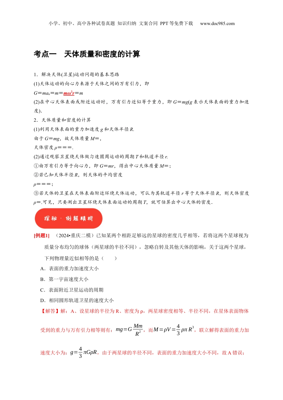 小学、初中、高中各种试卷真题知识归纳文案合同PPT等免费下载www.doc985.com第11讲万有引力定律1.掌握万有引力定律的内容、公式及应用.2.理解环绕速度的含义并会求解.3.了解第二和第三宇宙速度.小学、初中、高中各种试卷真题知识归纳文案合同PPT等免费下载www.doc985.com考点一天体质量和密度的计算1.解决天体(卫星)运动问题的基本思路(1)天体运动的向心力来源于天体之间的万有引力,即G=man=m=mω2r=m(2)在中心天体表面或附近运动时,万有引力近似等于重力,即G=mg(g表示天体表面的重力加速度).2.天体质量和密度的计算(1)利用天体表面的重力加速度g和天体半径R.由于G=mg,故天体质量M=,天体密度ρ===.(2)通过观察卫星绕天体做匀速圆周运动的周期T和轨道半径r.①由万有引力等于向心力,即G=mr,得出中心天体质量M=;②若已知天体半径R,则天体的平均密度ρ===;③若天体的卫星在天体表面附近环绕天体运动,可认为其轨道半径r等于天体半径R,则天体密度ρ=.可见,只要测出卫星环绕天体表面运动的周期T,就可估算出中心天体的密度.[例题1](2024•重庆二模)已知某两个相距足够远的星球的密度几乎相等,若将这两个星球视为质量分布均匀的球体(两星球的半径不同),忽略自转及其他天体的影响,关于这两个星球,下列物理量近似相等的是()A.表面的重力加速度大小B.第一宇宙速度大小C.表面附近卫星运动的周期D.相同圆形轨道卫星的速度大小【解答】解:A、设星球的半径为R、密度为ρ,两星球密度相等、半径不同,在星体表面物体受到的重力与万有引力相等则有:mg=GMmR2,而M=ρV=43ρπR3,联立解得表面的重力加速度大小为:g=43πGρR,由于两星球的半径不同,表面的重力加速度大小不同,故A错误;小学、初中、高中各种试卷真题知识归纳文案合同PPT等免费下载www.doc985.comB、由GMmR2=43πGρRm=mv12R得,第一宇宙速度大小为:v1=❑√43πGρR2,由于两星球的半径不同,第一宇宙速度大小不同,故B错误;C、由GMmR2=43πGρRm=m4π2T2R得,表面附近卫星运动的周期T=❑√3πGρ,所以表面附近卫星运动的周期相同,故C正确;D、由GMmr2=mv2r得v=❑√GMr,由于M=43πR3,联立相同圆形轨道卫星的速度大小为:v=❑√4πρGR33r,由于两星球的半径不同,相同圆形轨道卫星的速度大小不同,故D错误。故选:C。[例题2](2024•宁河区校级二模)嫦娥五号探测器完成月球表面采样后,进入环月等待阶段,在该阶段进行若干次变轨,每次变轨后在半径更大的轨道上绕月球做匀速圆周运动,其加速度a与轨道半径r的关系图像如图所示,其中b为纵坐标的最大值,图线的斜率为k,引力常量为G,下列说法正确的是()A.月球的质量为GkB.月球的半径为❑√kbC.月球的第一宇宙速度为❑√kbD.嫦娥五号环绕月球运行的最小周期为❑√4π2kb2【解答】解:AB、嫦娥五号探测器绕月球做匀速圆周运动,根据万有引力提供向心力,有:小学、初中、高中各种试卷真题知识归纳文案合同PPT等免费下载www.doc985.comGMmr2=ma,解得加速度为:a=GMr2,则a−1r2图象的斜率为:k=GM,则月球的质量为:M=kG;设月球的半径为R,因为当r=R时a最大值为b,则有:b=GMR2=kR2,解得月球的半径为:R=❑√kb,故A错误,B正确;C、对于近月卫星,根据万有引力提供向心力,有:GMmR2=mv12R,解得月球的第一宇宙速度为v1=4√kb,故C错误;D、当嫦娥五号环绕月球表面附近运行时周期最小,为T=2πRv1=2π❑√kb4√kb=2π4√kb3,故D错误。故选:B。[例题3](2024•长沙模拟)2023年11月23日《中国日报》消息,11月23日18时00分04秒,我国在西昌卫星发射中心使用长征二号丁运载火箭及远征三号上面级成功将互联网技术试验卫星发射升空,卫星顺利进入预定轨道,发射任务取得圆满成功。如果互联网技术试验卫星的轨道半径为r,周期为T,地球的半径为R,引力常量为G,则()A.地球的质量为4π2r3GT2B.地球的质量为4π2R3GT2C.地球的密度为3πGT2D.地球的密度为3πR3GT2r3小学、初中、高中各种试卷真题知识归纳文案合同PPT等免费下载www.doc985.com【解答】解:AB、根据万有引力提供向心力可得:GMmr2=m4π2rT2代入数据...