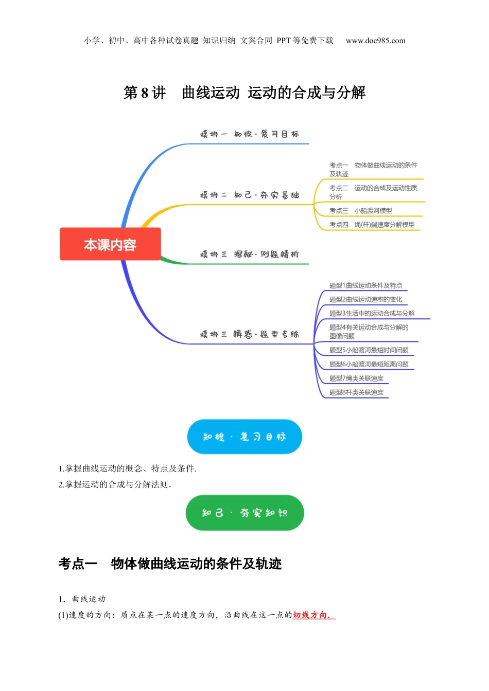 小学、初中、高中各种试卷真题知识归纳文案合同PPT等免费下载www.doc985.com第8讲曲线运动运动的合成与分解1.掌握曲线运动的概念、特点及条件.2.掌握运动的合成与分解法则.考点一物体做曲线运动的条件及轨迹1.曲线运动(1)速度的方向:质点在某一点的速度方向,沿曲线在这一点的切线方向.小学、初中、高中各种试卷真题知识归纳文案合同PPT等免费下载www.doc985.com(2)运动的性质:做曲线运动的物体,速度的方向时刻在改变,所以曲线运动一定是变速运动.(3)曲线运动的条件:物体所受合外力的方向跟它的速度方向不在同一条直线上或它的加速度方向与速度方向不在同一条直线上.2.合外力方向与轨迹的关系物体做曲线运动的轨迹一定夹在合外力方向与速度方向之间,速度方向与轨迹相切,合外力方向指向轨迹的“凹”侧.3.速率变化情况判断(1)当合外力方向与速度方向的夹角为锐角时,物体的速率增大;(2)当合外力方向与速度方向的夹角为钝角时,物体的速率减小;(3)当合外力方向与速度方向垂直时,物体的速率不变.[例题1](2024•重庆模拟)如图所示,“嫦娥号”探月卫星在由地球飞向月球时,沿曲线从M点向N点飞行的过程中,速度逐渐减小,在此过程中探月卫星所受合力方向可能是下列图中的()A.B.C.D.【解答】解:“嫦娥号”探月卫星从M点运动到N,做曲线运动,速度逐渐减小,故合力指向指向凹侧,且合力与速度的方向的夹角要大于90°,故ABC错误,D正确。故选:D。[例题2](2024•金台区模拟)我国研制的“威龙”J20﹣是高性能五代歼击机,它在空中能做连续的开普勒抛物线飞行,飞机飞行的轨迹从左向右运动,图中各点的速度与飞机所受合力的方向可能正确的()小学、初中、高中各种试卷真题知识归纳文案合同PPT等免费下载www.doc985.comA.a点B.b点C.c点D.d点【解答】解:由于曲线运动的速度方向沿轨迹上该点的切线方向,合外力应指向曲线的内侧,故ACD错误,B正确故选:B。[例题3](2023•黄埔区三模)如图所示,乒乓球从斜面上滚下后在水平桌面上沿直线运动。在与乒乓球运动路线垂直的方向上横放一个纸筒(纸筒开口略大于乒乓球直径)。人趴在桌子边沿并鼓起嘴巴正对纸筒口,当乒乓球经过筒口时,对着乒乓球向筒口吹气,则乒乓球被吹后()A.保持原运动方向继续前进B.一定能沿吹气方向进入纸筒C.偏离原运动方向滚向纸筒左侧D.偏离原运动方向滚向纸筒右侧【解答】解:一开始乒乓球向右运动,当乒乓球受到沿纸筒方向的吹气的力后,乒乓球参与了两个方向的分运动,会偏离原运动方向滚向纸筒右侧;由于惯性,乒乓球不可能吹气方向进入纸筒。故ABC错误,D正确。故选:D。考点二运动的合成及运动性质分析1.遵循的法则:位移、速度、加速度都是矢量,故它们的合成与分解都遵循平行四边形定则.2.合运动与分运动的关系(1)等时性:合运动和分运动经历的时间相等,即同时开始、同时进行、同时停止.(2)独立性:一个物体同时参与几个分运动,各分运动独立进行,不受其他运动的影响.(3)等效性:各分运动的规律叠加起来与合运动的规律有完全相同的效果.3.合运动的性质判断小学、初中、高中各种试卷真题知识归纳文案合同PPT等免费下载www.doc985.com4.两个直线运动的合运动性质的判断标准:看合初速度方向与合加速度方向是否共线.两个互成角度的分运动合运动的性质两个匀速直线运动匀速直线运动一个匀速直线运动、一个匀变速直线运动匀变速曲线运动两个初速度为零的匀加速直线运动匀加速直线运动两个初速度不为零的匀变速直线运动如果v合与a合共线,为匀变速直线运动[例题4](2024•惠州一模)我国的风洞技术处于世界领先地位。如图所示,在某次风洞实验中,一质量为m的轻质小球,在恒定的风力作用下先后以相同的速度大小v经过a、b两点,速度方向与a、b连线的夹角α、β均为45°。已知a、b连线长为d,小球的重力忽略不计。则小球从a点运动到b点过程中,下列说法正确的是()A.风力方向与a、b连线平行B.所用时间为❑√2dvC.小球做匀速圆周运动D.风力大小为2mv2d【解答】解:A、由题意可知小球做匀变速曲线运动,根据加速度的定义可知加速度方向移动和速度变化量的方向相同,根...
