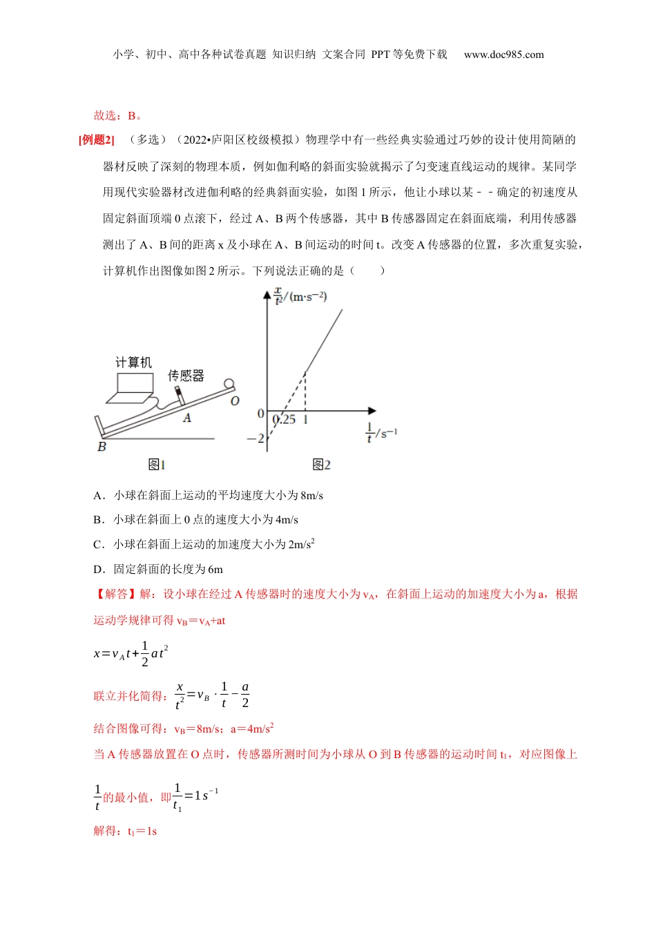 小学、初中、高中各种试卷真题知识归纳文案合同PPT等免费下载www.doc985.com第2讲匀变速直线运动规律的应用1、掌握并会利用匀变速直线运动规律处理物理问题。2、掌握并会利用匀变速直线运动的推论处理物理问题考点一匀变速直线运动公式的应用1.基本规律(1)速度公式:v=v0+at.(2)位移公式:x=v0t+at2.小学、初中、高中各种试卷真题知识归纳文案合同PPT等免费下载www.doc985.com(3)位移速度关系式:v2-v=2ax.这三个基本公式,是解决匀变速直线运动的基石.均为矢量式,应用时应规定正方向.2.两个重要推论(1)物体在一段时间内的平均速度等于这段时间中间时刻的瞬时速度,还等于初、末时刻速度矢量和的一半,即:=v=.(2)任意两个连续相等的时间间隔T内的位移之差为一恒量,即:Δx=x2-x1=x3-x2=…=xn-xn-1=aT2.3.v0=0的四个重要推论(1)1T末、2T末、3T末、……瞬时速度的比为:v1∶v2∶v3∶…∶vn=1∶2∶3∶…∶n(2)1T内、2T内、3T内……位移的比为:x1∶x2∶x3∶…∶xn=12∶22∶32∶…∶n2(3)第一个T内、第二个T内、第三个T内……位移的比为:xⅠ∶xⅡ∶xⅢ∶…∶xn=1∶3∶5∶…∶(2n-1)(4)从静止开始通过连续相等的位移所用时间的比为:t1∶t2∶t3∶…∶tn=1∶(-1)∶(-)∶…∶(-)[例题1](2024•佛山一模)为提高航母的效能,福建舰安装了电磁弹射器,舰载机在弹射器的助推下能获得30m/s2~50m/s2的加速度。若某舰载机从静止开始弹射,匀加速运动150m达到100m/s的起飞速度,则该过程的时间为()A.3.3sB.3.0sC.2.5sD.1.5s【解答】解:由题意可知,舰载机从静止开始弹射,匀加速运动150m达到100m/s的起飞速度,则根据xt=v2代入数据解得t=3.0s,故B正确。小学、初中、高中各种试卷真题知识归纳文案合同PPT等免费下载www.doc985.com故选:B。[例题2](多选)(2022•庐阳区校级模拟)物理学中有一些经典实验通过巧妙的设计使用简陋的器材反映了深刻的物理本质,例如伽利略的斜面实验就揭示了匀变速直线运动的规律。某同学用现代实验器材改进伽利略的经典斜面实验,如图1所示,他让小球以某﹣﹣确定的初速度从固定斜面顶端0点滚下,经过A、B两个传感器,其中B传感器固定在斜面底端,利用传感器测出了A、B间的距离x及小球在A、B间运动的时间t。改变A传感器的位置,多次重复实验,计算机作出图像如图2所示。下列说法正确的是()A.小球在斜面上运动的平均速度大小为8m/sB.小球在斜面上0点的速度大小为4m/sC.小球在斜面上运动的加速度大小为2m/s2D.固定斜面的长度为6m【解答】解:设小球在经过A传感器时的速度大小为vA,在斜面上运动的加速度大小为a,根据运动学规律可得vB=vA+atx=vAt+12at2联立并化简得:xt2=vB⋅1t−a2结合图像可得:vB=8m/s;a=4m/s2当A传感器放置在O点时,传感器所测时间为小球从O到B传感器的运动时间t1,对应图像上1t的最小值,即1t1=1s−1解得:t1=1s小学、初中、高中各种试卷真题知识归纳文案合同PPT等免费下载www.doc985.com所以小球在斜面上O点的速度大小为v0=vBat﹣1=8m/s4×1m/s﹣=4m/s小球在斜面上运动的平均速度大小为v=v0+vB2=4+82m/s=6m/s固定斜面长度为l=vt1=6×1m=6m,故AC错误,BD正确;故选:BD。[例题3](2024•新郑市校级三模)一质点在连续的6s内做匀加速直线运动,在第一个2s内位移为12m,最后一个2s内位移为36m,下面说法正确的是()A.质点的加速度大小是6m/s2B.质点的加速度大小是3m/s2C.质点第2s末的速度大小是12m/sD.质点在第1s内的位移大小是6m【解答】解:AB、设第一个2s内的位移为x1,第三个2s内,即最后1个2s内的位移为x3,根据x3−x1=2aT2,可得加速度a=3m/s2,故A错误,B正确;C、由匀变速直线运动连续相等时间内通过的位移差为定值,即x3x﹣2=x2x﹣1,解得x2=24m,第2s末的瞬时速度等于前4s内的平均速度,则第2s末速度为v=x2+x12T,解得v=9m/s,故C错误;D、第1s末的瞬时速度等于第一个2s内的平均速度,则v1=x1T=366m/s=6m/s,在第1s内反向看为匀减速运动,则有x1=v1t−12at2,解得x1=4.5m,故D错误。故选:B。考点二常用的“六种”物理思想方法1.一般公式法小学、初中、高中...