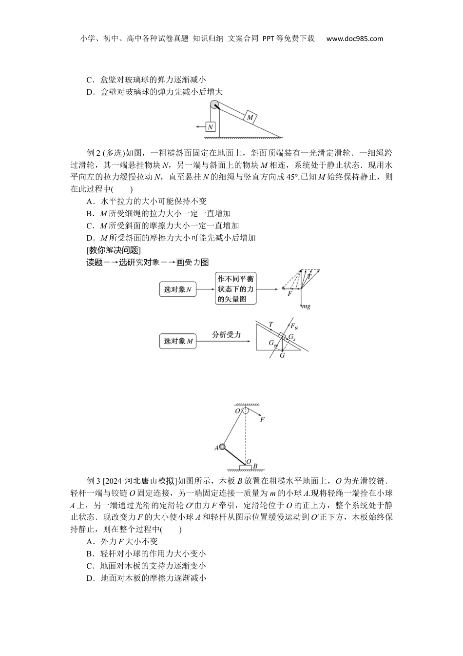 小学、初中、高中各种试卷真题知识归纳文案合同PPT等免费下载www.doc985.com专题强化三动态平衡及平衡中的临界、极值问题素养目标1.学会用图解法、解析法等解决动态平衡问题.2.学会分析平衡中的临界与极值问题.考点一动态平衡问题1.动态平衡:是指平衡问题中的一部分力是变力,是动态力,力的大小和方向要发生变化,所以叫动态平衡.2.分析动态平衡问题方法的选取技巧(1)解析法①列平衡方程,列出未知量与已知量的关系表达式;②根据已知量的变化情况来确定未知量的变化情况.(2)图解法(3)相似三角形法①根据已知条件画出对应的力的三角形和空间几何相似三角形,确定对应边,利用三角形相似法列出比例式;②确定未知量的变化情况.【温馨提示】平衡中的“三看”与“三想”(1)看到“慢缓”,想到“物体于平衡处动态状态”.(2)看到“、轻绳轻环”,想到“、的量可忽略不绳环质计”.(3)看到“光滑”,想到“摩擦力零为”.例1(多选)[2024·四川成都高三检测]某中学举行趣味运动会时,挑战用一支钢尺取出深盒子(固定不动)中的玻璃球,该游戏深受大家喜爱,参与者热情高涨.游戏中需要的器材和取球的原理分别如图甲和图乙所示.若忽略玻璃球与盒壁、钢尺间的摩擦力,在不损坏盒子的前提下,钢尺沿着盒子上边缘某处旋转拨动(钢尺在盒内的长度逐渐变短),使玻璃球沿着盒壁缓慢上移时,下列说法正确的是()A.钢尺对玻璃球的弹力逐渐减小B.钢尺对玻璃球的弹力先增大后减小小学、初中、高中各种试卷真题知识归纳文案合同PPT等免费下载www.doc985.comC.盒壁对玻璃球的弹力逐渐减小D.盒壁对玻璃球的弹力先减小后增大例2(多选)如图,一粗糙斜面固定在地面上,斜面顶端装有一光滑定滑轮.一细绳跨过滑轮,其一端悬挂物块N,另一端与斜面上的物块M相连,系统处于静止状态.现用水平向左的拉力缓慢拉动N,直至悬挂N的细绳与竖直方向成45°.已知M始终保持静止,则在此过程中()A.水平拉力的大小可能保持不变B.M所受细绳的拉力大小一定一直增加C.M所受斜面的摩擦力大小一定一直增加D.M所受斜面的摩擦力大小可能先减小后增加[解教你决问题]读题―→究象选研对―→受力画图例3[2024·河北唐山模拟]如图所示,木板B放置在粗糙水平地面上,O为光滑铰链.轻杆一端与铰链O固定连接,另一端固定连接一质量为m的小球A.现将轻绳一端拴在小球A上,另一端通过光滑的定滑轮O′由力F牵引,定滑轮位于O的正上方,整个系统处于静止状态.现改变力F的大小使小球A和轻杆从图示位置缓慢运动到O′正下方,木板始终保持静止,则在整个过程中()A.外力F大小不变B.轻杆对小球的作用力大小变小C.地面对木板的支持力逐渐变小D.地面对木板的摩擦力逐渐减小小学、初中、高中各种试卷真题知识归纳文案合同PPT等免费下载www.doc985.com例4(多选)如图所示,绕过滑轮的轻绳一端固定在竖直墙上,站在地面上的人用手拉着绳的另一端,滑轮下吊着一个小球,处于静止状态,保持B点高度不变,在人缓慢向左移动一小段距离的过程中()A.绳上张力变大B.人对地面的压力变大C.地面对人的摩擦力变大D.滑轮受到绳的作用力变大思维提升三力作用下的动态平衡考点二平衡中的临界、极值问题1.临界问题当某物理量变化时,会引起其他几个物理量的变化,从而使物体所处的平衡状态“恰好出现”或“恰好不出现”,在问题的描述中常用“刚好”“恰能”“恰好”等.临界问题常见的种类:(1)由静止到运动,摩擦力达到最大静摩擦力.(2)绳子恰好绷紧,拉力F=0.(3)刚好离开接触面,支持力FN=0.2.极值问题平衡中的极值问题,一般指在力的变化过程中的最大值和最小值问题.3.解决极值和临界问题的三种方法极限法正确进行受力分析和变化过程分析,找到平衡的临界点和极值点;临界条件必须在变化中寻找,不能在一个状态上研究临界问题,要把某个物理量推向极大或极小数学分析法通过对问题分析,根据平衡条件列出物理量之间的函数关系(画出函数图像),用数学方法求极值(如求二次函数极值、公式极值、三角函数极值)图解分析法根据平衡条件,作出力的矢量图,通过对物理过程的分析,利用平行四边形小学、初中、高中各种试卷真题知识归纳文案合...