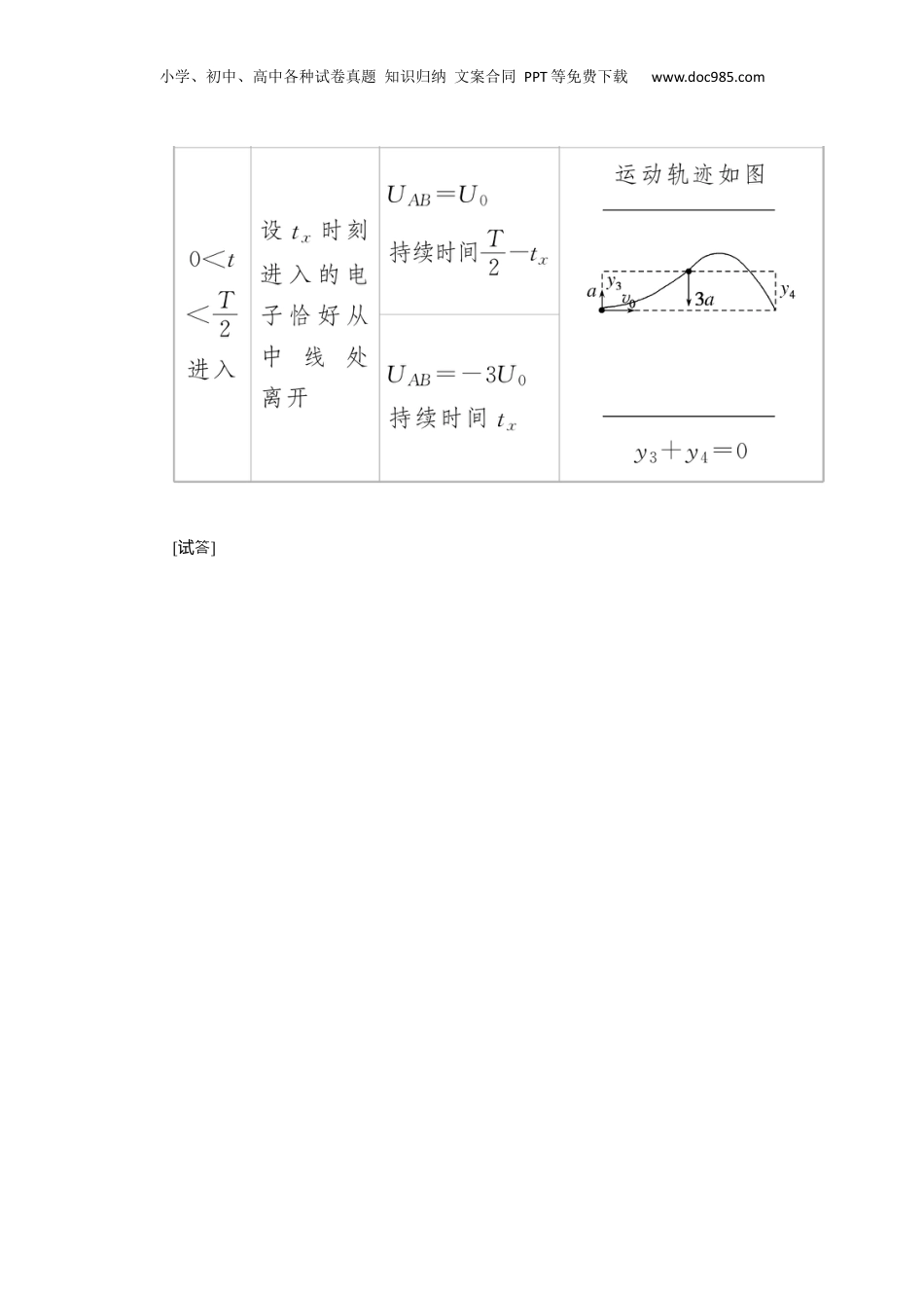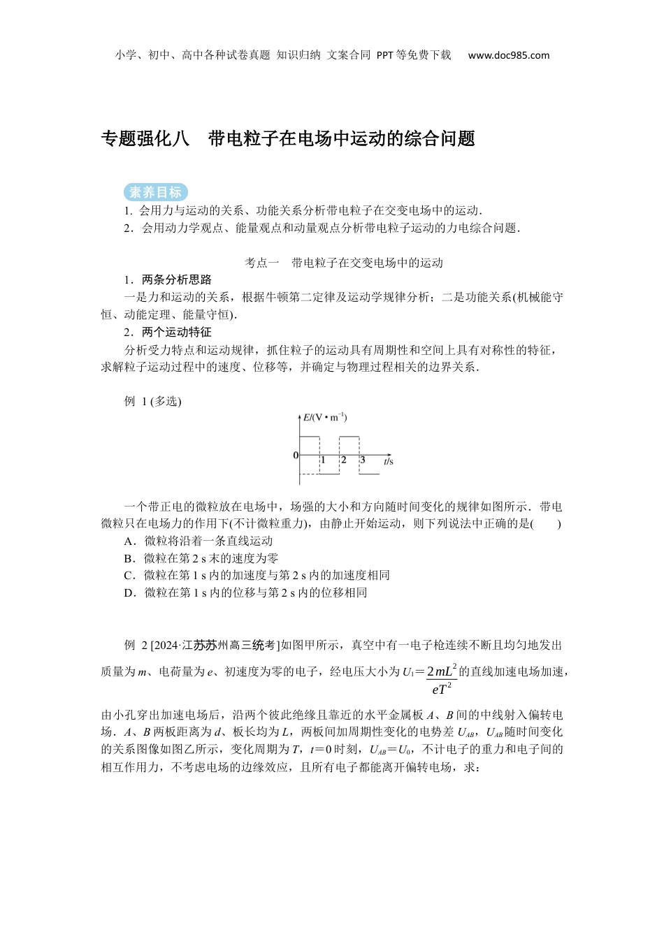 小学、初中、高中各种试卷真题知识归纳文案合同PPT等免费下载www.doc985.com专题强化八带电粒子在电场中运动的综合问题1.会用力与运动的关系、功能关系分析带电粒子在交变电场中的运动.2.会用动力学观点、能量观点和动量观点分析带电粒子运动的力电综合问题.考点一带电粒子在交变电场中的运动1.两条分析思路一是力和运动的关系,根据牛顿第二定律及运动学规律分析;二是功能关系(机械能守恒、动能定理、能量守恒).2.两个运动特征分析受力特点和运动规律,抓住粒子的运动具有周期性和空间上具有对称性的特征,求解粒子运动过程中的速度、位移等,并确定与物理过程相关的边界关系.例1(多选)一个带正电的微粒放在电场中,场强的大小和方向随时间变化的规律如图所示.带电微粒只在电场力的作用下(不计微粒重力),由静止开始运动,则下列说法中正确的是()A.微粒将沿着一条直线运动B.微粒在第2s末的速度为零C.微粒在第1s内的加速度与第2s内的加速度相同D.微粒在第1s内的位移与第2s内的位移相同例2[2024·江州高三考苏苏统]如图甲所示,真空中有一电子枪连续不断且均匀地发出质量为m、电荷量为e、初速度为零的电子,经电压大小为U1=2mL2eT2的直线加速电场加速,由小孔穿出加速电场后,沿两个彼此绝缘且靠近的水平金属板A、B间的中线射入偏转电场.A、B两板距离为d、板长均为L,两板间加周期性变化的电势差UAB,UAB随时间变化的关系图像如图乙所示,变化周期为T,t=0时刻,UAB=U0,不计电子的重力和电子间的相互作用力,不考虑电场的边缘效应,且所有电子都能离开偏转电场,求:小学、初中、高中各种试卷真题知识归纳文案合同PPT等免费下载www.doc985.com(1)电子从加速电场U1飞出后的水平速度v0的大小;(2)t=3T4时,射入偏转电场的电子离开偏转电场时距两板间中线的距离y;(3)在0<t<T2的时间段内,若电子能够从中线上方离开偏转电场,求电子进入偏转电场的时间段.[解教你决问题]程过审题1.加速阶段:eU1=12mv02⇒v0=2eU1m=2LT2.偏转阶段:子在水平向速,电匀运动时间t=Lv0=T2小学、初中、高中各种试卷真题知识归纳文案合同PPT等免费下载www.doc985.com[答试]小学、初中、高中各种试卷真题知识归纳文案合同PPT等免费下载www.doc985.com考点二电场中功能关系的综合问题1.若只有静电力做功,电势能与动能之和保持不变.2.若只有静电力和重力做功,电势能、重力势能、动能之和保持不变.3.除重力之外,其他各力对物体做的功等于物体机械能的变化量.4.所有外力对物体所做的总功等于物体动能的变化量.例3[2024·山模东拟预测]如图所示,在竖直向下的匀强电场中,两个质量相同、带电量分别为-q和+q的小球a、b固定于绝缘轻杆的两端,轻杆可绕中点O处的固定轴在竖直面内无摩擦转动.已知O点电势为0,不考虑带电小球间的相互作用力,杆从静止开始由水平位置顺时针转动180°的过程中()A.小球a、b总动能一直增加B.小球a、b系统机械能始终不变C.小球a、b系统电势能始终不变D.小球a、b任一时刻的电势能相等例4(多选)如图甲所示,绝缘、光滑水平面上方,有水平向右的匀强电场,电场强度大小为E.在水平面右端固定一轻弹簧,一带电物块(可视为质点)质量为m,电量为+q,将带电物块由静止释放,以物块出发点为坐标原点,水平向右为x轴正方向,建立坐标系,物块动能Ek与它通过的距离x之间的关系如图乙,其中坐标x1处为弹簧原长位置,O~x1段为直线,坐标x2处动能最大,坐标x4处动能为零.下列说法正确的是()A.弹簧的劲度系数为k=qEx2−x1B.从坐标x1处到坐标x4处,物块所受力的合力先增加后减小C.从坐标x1处到坐标x3处弹簧弹性势能增加了qE(x3-x1)D.从坐标x1处到坐标x2处,弹簧弹性势能增加量的大小等于电势能减少量的大小考点三电场中的力、电综合问题解决电场中的力、电综合问题,常用的力学观点:小学、初中、高中各种试卷真题知识归纳文案合同PPT等免费下载www.doc985.com(1)动力学的观点①由于匀强电场中带电粒子(体)所受电场力和重力都是恒力,可用正交分解法.②综合运用牛顿运动定律和运动学公式,注意受力分析和运动分析,特别注意重力是否需要考虑的问题.(...