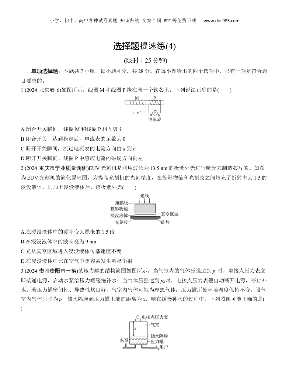 小学、初中、高中各种试卷真题知识归纳文案合同PPT等免费下载www.doc985.com提速选择题练(4)(限:时25分钟)一、单项选择题:本题共7小题,每小题4分,共28分。在每小题给出的四个选项中,只有一项是符合题目要求的。1.(2024·北京卷·6)如图所示,线圈M和线圈P绕在同一个铁芯上,下列说法正确的是()A.闭合开关瞬间,线圈M和线圈P相互吸引B.闭合开关,达到稳定后,电流表的示数为0C.断开开关瞬间,流过电流表的电流方向由a到bD.断开开关瞬间,线圈P中感应电流的磁场方向向左2.(2024·重市量庆学业质调研)EUV光刻机是利用波长为13.5nm的极紫外光进行曝光来制造芯片的。如图为EUV光刻机的简化原理图,为提高光刻机的光刻精度,在投影物镜和光刻胶之间填充了折射率为1.5的浸没液体,则加上浸没液体后,该极紫外光()A.在浸没液体中的频率变为原来的1.5倍B.在浸没液体中的波长变为9nmC.光从真空区域进入浸没液体传播速度不变D.在浸没液体中比在空气中更容易发生明显衍射3.(2024·州市一模贵贵阳)某压力罐的结构简图如图所示。当气室内的气体压强达到p1时,电接点压力表立即接通电源,启动水泵给压力罐缓慢补水;当气体压强达到p2时,电接点压力表便自动断开电源,停止补水。若压力罐密闭性、导热性均良好,气室内气体可视为理想气体,压力罐所处环境温度保持不变。设气室内气体压强为p,储水隔膜到压力罐上端的距离为x,则在缓慢补水的过程中,下列图像可能正确的是()小学、初中、高中各种试卷真题知识归纳文案合同PPT等免费下载www.doc985.com4.(2024·湖南省范大附中一模师学属学)某人驾驶汽车在平直公路上以108km/h的速度匀速行驶,某时刻看到前方路上有障碍物,经过一段反应时间,开始刹车,假设刹车后汽车做匀减速直线运动。从看到障碍物到车子停下的过程,汽车的位移x随速度v变化的关系图像由一段平行于x轴的直线与一段曲线组成,直线与曲线的分界点为P点(如图所示)。则下列说法正确的是()A.曲线部分是一段抛物线B.司机的反应时间为0.417sC.刹车的加速度大小为5m/s2D.刹车的时间是6s5.(2024·四川德市二模阳)2023年6月21日,中国科研学者利用天眼FAST发现了一个名为PSRJ1953+1844的双星系统。其运行周期仅为53分钟,是目前发现周期最短的脉冲双星系统。已知该双星运行周期为T,双星间的距离为L且远大于双星的几何尺寸,引力常量为G,则该双星系统的总质量是()A.8π2L3GT2B.4π2L3GT2C.2π2L3GT2D.π2L32GT26.(2024·新卷课标·18)如图,两根不可伸长的等长绝缘细绳的上端均系在天花板的O点上,下端分别系有均带正电荷的小球P、Q;小球处在某一方向水平向右的匀强电场中,平衡时两细绳与竖直方向的夹角大小相等。则()A.两绳中的张力大小一定相等B.P的质量一定大于Q的质量C.P的电荷量一定小于Q的电荷量小学、初中、高中各种试卷真题知识归纳文案合同PPT等免费下载www.doc985.comD.P的电荷量一定大于Q的电荷量7.(2024·四川州市三泸诊)如图所示的电路中,理想变压器原、副线圈匝数比为n1∶n2=3∶1,定值电阻R1、R2和R3的阻值分别为3Ω、1Ω和4Ω,为理想交流电流表,U为正弦交流电源,输出电压的有效值恒定。当开关S断开时,电流表的示数为I。则当S闭合时,电流表的示数为()A.43IB.2IC.4ID.5I二、多:项选择题本题共3小题,每小题6分,共18分。在每小题给出的四个选项中,有多项符合题目要求。全部选对的得6分,选对但不全的得3分,有选错的得0分。8.(2024·T8盟水平性考联学业选择试)氢原子跃迁与巴耳末系的对比图像如图所示,已知光速为c,普朗克常量为h,下列说法正确的是()A.巴耳末系就是氢原子从n=3,4,5…能级跃迁到基态时辐射出的光谱B.气体的发光原理是气体放电管中原子受到光子的撞击跃迁到激发态,再向低能级跃迁,放出光子C.氢原子从n=3能级跃迁到n=2能级时辐射出的光是可见光,但不属于巴耳末系D.若处于某个激发态的几个氢原子,只发出λ1、λ2、λ3三种波长的光,当λ1>λ2>λ3,则有(λ1+λ2)λ3=λ1λ29.(2024·安徽省皖北作考协区联)如图所示,在xOy平面的第一、二象限内有垂直坐标平面向里的匀强磁场,磁感应强度大小为B,在第三、四象限-d≤y≤0范围内有沿x轴正方...