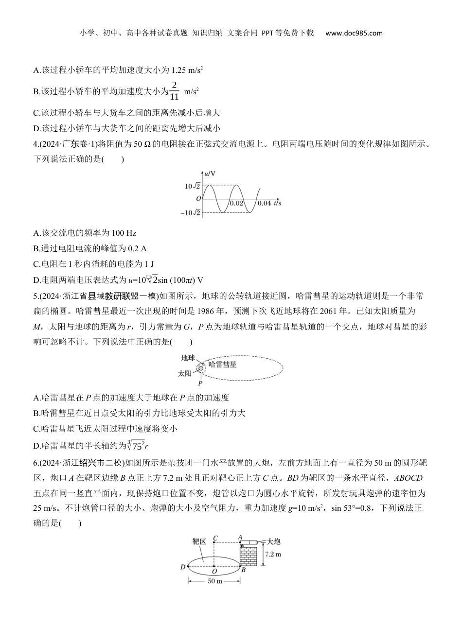 小学、初中、高中各种试卷真题知识归纳文案合同PPT等免费下载www.doc985.com提速选择题练(3)(限:时25分钟)一、单项选择题:本题共7小题,每小题4分,共28分。在每小题给出的四个选项中,只有一项是符合题目要求的。1.(2024·州市适性考贵贵阳应试)如图所示,一矩形晾衣架挂在固定水平横杆上。绳与衣架边框的接点A和D与B和C到邻近短边的距离相等,O为绳与挂钩的结点。测得AB=CD=32cm、AD=BC=24cm、轻质软绳OA=OB=OC=OD=25cm,衣架和夹子的总质量为0.3kg。重力加速度g取10m/s2,则每根绳的拉力大小为()A.0.75NB.1.25NC.1.4ND.1.6N2.(2024·北京市城一模东区)如图甲所示,水滴滴在平静的水面上,会形成水波向四周传播(可视为简谐波)。可利用两个能够等间隔滴水的装置S1、S2来研究波的叠加现象,图乙所示为以S1、S2为波源的两水波在某时刻叠加的简化示意图,已知S1、S2的振幅均为A,该时刻它们形成的波峰和波谷分别由实线和虚线表示。则下列说法正确的是()A.a处质点做简谐运动,振幅为0B.b处质点此刻的位移大小为2AC.若想观察到稳定的干涉现象,可将S2滴水间隔调小D.只要将S1的滴水间隔调至和S2的相等,c处质点就做振幅为2A的简谐运动3.(2024·河北保定市一模)如图甲所示,一辆小轿车从服务区匝道驶入平直高速行车道时速率为20m/s,想要加速驶入内车道,由于行车道前方匀速运动的大货车速度较小,影响超车。小轿车加速8s后放弃超车,立即减速,再经过3s,与大货车同速跟随,再伺机超车。该过程小轿车的速度与时间的关系如图乙所示,下列说法中正确的是()小学、初中、高中各种试卷真题知识归纳文案合同PPT等免费下载www.doc985.comA.该过程小轿车的平均加速度大小为1.25m/s2B.该过程小轿车的平均加速度大小为211m/s2C.该过程小轿车与大货车之间的距离先减小后增大D.该过程小轿车与大货车之间的距离先增大后减小4.(2024·广卷东·1)将阻值为50Ω的电阻接在正弦式交流电源上。电阻两端电压随时间的变化规律如图所示。下列说法正确的是()A.该交流电的频率为100HzB.通过电阻电流的峰值为0.2AC.电阻在1秒内消耗的电能为1JD.电阻两端电压表达式为u=10❑√2sin(100πt)V5.(2024·浙江省域盟一模县教研联)如图所示,地球的公转轨道接近圆,哈雷彗星的运动轨道则是一个非常扁的椭圆。哈雷彗星最近一次出现的时间是1986年,预测下次飞近地球将在2061年。已知太阳质量为M,太阳与地球的距离为r,引力常量为G,P点为地球轨道与哈雷彗星轨道的一个交点,地球对彗星的影响可忽略不计。下列说法中正确的是()A.哈雷彗星在P点的加速度大于地球在P点的加速度B.哈雷彗星在近日点受太阳的引力比地球受太阳的引力大C.哈雷彗星飞近太阳过程中速度将变小D.哈雷彗星的半长轴约为3√752r6.(2024·浙江市二模绍兴)如图所示是杂技团一门水平放置的大炮,左前方地面上有一直径为50m的圆形靶区,炮口A在靶区边缘B点正上方7.2m处且正对靶心正上方C点。BD为靶区的一条水平直径,ABOCD五点在同一竖直平面内,现保持炮口位置不变,炮管以炮口为圆心水平旋转,所发射玩具炮弹的速率恒为25m/s。不计炮管口径的大小、炮弹的大小及空气阻力,重力加速度g=10m/s2,sin53°=0.8,下列说法正确的是()小学、初中、高中各种试卷真题知识归纳文案合同PPT等免费下载www.doc985.comA.正对靶心水平射出时炮弹会落到靶心处B.炮管与AC方向平行的位置开始水平转动角度等于30°时,炮弹将落在靶区外C.炮管与AC方向平行的位置开始水平转动角度小于53°时,炮弹一定会落在靶区内D.炮管水平转动角度越大,射出去的炮弹单位时间内速度的变化量越大7.(2024·湖南范大附中一模师学属学)如图所示,ABCD是正四面体,虚线圆为三角形ABD的内切圆,切点分别为M、N、P,O为圆心,正四面体的顶点A、B和D分别固定有电荷量为+Q、+Q和-Q的点电荷,下列说法正确的是()A.M、P两点的电场强度相同B.M、O、N、P四点的电势φN>φO>φP>φMC.将带正电的试探电荷由O点沿直线移动到C点,电势能先增大后减小D.将固定在D点的点电荷移动到C点,静电力做功为零二、多:项选择题本题共3小题,每小题6分,共18分。在每小题给出的四个选项中,有多项符合题目要求。全部选对...
