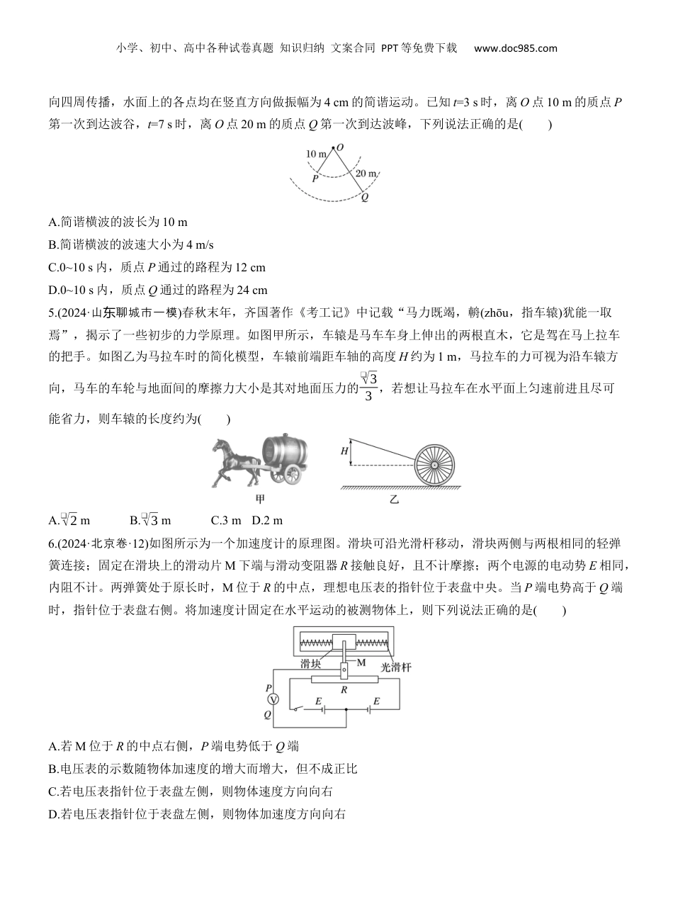 小学、初中、高中各种试卷真题知识归纳文案合同PPT等免费下载www.doc985.com提速选择题练(2)(限:时25分钟)一、单项选择题:本题共7小题,每小题4分,共28分。在每小题给出的四个选项中,只有一项是符合题目要求的。1.(2024·河北卷·1)锂是新能源汽车、储能和信息通信等新兴产业的关键材料。研究表明,锂元素主要来自宇宙线高能粒子与星际物质的原子核产生的散裂反应,其中一种核反应方程为612C+¿11¿H→37Li+211H+X,式中的X为()A.01nB.−10eC.10eD.24He2.(2024·湖北省三模)如图所示,粗细均匀的玻璃管(上端开口,下端封闭)竖直放置,管内用长为h=15cm的水银柱封闭一段长l=30cm的理想气体,现将玻璃管在竖直平面内缓慢转至水平放置(水银未溢出)。已知大气压强p0=75cmHg,玻璃管导热性能良好且环境温度保持不变。下列说法正确的是()A.玻璃管缓慢转至水平放置的过程中,气体放出热量B.玻璃管缓慢转至水平放置的过程中,外界对气体做功C.玻璃管竖直放置时,封闭气体的压强为60cmHgD.玻璃管水平放置时,封闭气体的长度为36cm3.(2024·浙江省金十校二模华)在2023年9月21日的“天宫课堂”上,航天员给同学们解答了与太空垃圾相关的问题。假设在空间站观察到如图所示的太空垃圾P、Q、M、N(P、Q、M、N均无动力运行,轨道所在空间存在稀薄气体),假设空间站和太空垃圾均绕地球做顺时针方向的运动,空间站的轨道高度不变。则最可能对空间站造成损害的是()A.PB.QC.MD.N4.(2024·河北保定市九校二模)花样游泳被誉为水中芭蕾。运动员在花样游泳表演赛中,用手拍皮球,水波向四周散开,可简化为如图所示的模型,t=0时,波源O开始振动(起振方向向下),激发的简谐横波沿水面小学、初中、高中各种试卷真题知识归纳文案合同PPT等免费下载www.doc985.com向四周传播,水面上的各点均在竖直方向做振幅为4cm的简谐运动。已知t=3s时,离O点10m的质点P第一次到达波谷,t=7s时,离O点20m的质点Q第一次到达波峰,下列说法正确的是()A.简谐横波的波长为10mB.简谐横波的波速大小为4m/sC.0~10s内,质点P通过的路程为12cmD.0~10s内,质点Q通过的路程为24cm5.(2024·山聊城市一模东)春秋末年,齐国著作《考工记》中记载“马力既竭,輈(zhōu,指车辕)犹能一取焉”,揭示了一些初步的力学原理。如图甲所示,车辕是马车车身上伸出的两根直木,它是驾在马上拉车的把手。如图乙为马拉车时的简化模型,车辕前端距车轴的高度H约为1m,马拉车的力可视为沿车辕方向,马车的车轮与地面间的摩擦力大小是其对地面压力的❑√33,若想让马拉车在水平面上匀速前进且尽可能省力,则车辕的长度约为()A.❑√2mB.❑√3mC.3mD.2m6.(2024·北京卷·12)如图所示为一个加速度计的原理图。滑块可沿光滑杆移动,滑块两侧与两根相同的轻弹簧连接;固定在滑块上的滑动片M下端与滑动变阻器R接触良好,且不计摩擦;两个电源的电动势E相同,内阻不计。两弹簧处于原长时,M位于R的中点,理想电压表的指针位于表盘中央。当P端电势高于Q端时,指针位于表盘右侧。将加速度计固定在水平运动的被测物体上,则下列说法正确的是()A.若M位于R的中点右侧,P端电势低于Q端B.电压表的示数随物体加速度的增大而增大,但不成正比C.若电压表指针位于表盘左侧,则物体速度方向向右D.若电压表指针位于表盘左侧,则物体加速度方向向右小学、初中、高中各种试卷真题知识归纳文案合同PPT等免费下载www.doc985.com7.(2024·广湛江市二模东)某种负离子空气净化器的原理如图所示,由空气和带一价负电的灰尘颗粒组成的混合气流进入由一对平行金属板构成的收集器。在收集器中,带电颗粒入射时的最大动能为4×106eV,金属板的长度为L,金属板的间距为d,且L=100d。在匀强电场作用下,带电颗粒打到金属板上被收集,不考虑重力影响和颗粒间的相互作用。要使得全部颗粒被收集,两极板间的电势差至少为()A.1600VB.800VC.400VD.200V二、多:项选择题本题共3小题,每小题6分,共18分。在每小题给出的四个选项中,有多项符合题目要求。全部选对的得6分,选对但不全的得3分,有选错的得0分。8.(2024·浙江台州市二模)下列说法正确的是()A.在不同的惯性参考系中,物理规律的形式...