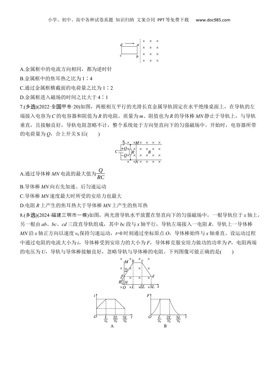 小学、初中、高中各种试卷真题知识归纳文案合同PPT等免费下载www.doc985.com点热14磁感律及用电应规应1~10每题题6分,共60分1.(2024·甘卷肃·6)工业上常利用感应电炉冶炼合金,装置如图所示。当线圈中通有交变电流时,下列说法正确的是()A.金属中产生恒定感应电流B.金属中产生交变感应电流C.若线圈匝数增加,则金属中感应电流减小D.若线圈匝数增加,则金属中感应电流不变2.(2024·重市模庆拟)在家庭电路中,接地故障断路器在用电器发生漏电时,能保护人的生命和财产安全。当用电器正常工作时,紧靠的两根绝缘电线电流大小相等、方向相反;当用电器漏电时,线圈中就会产生感应电流,断路器切断电路。若某次漏电瞬间,电线1和电线2中电流流向如图所示,且电线2中电流小于电线1中电流,则线圈内()A.磁通量增加,感应电流从N到MB.磁通量减少,感应电流从N到MC.磁通量增加,感应电流从M到ND.磁通量减少,感应电流从M到N3.(多选)(2024·山西大同市、晋中市一模)安装适当软件后,利用智能手机的磁传感器能测量由于磁感应强度发生变化而产生的感应电动势E感。已知某区域水平地面下1m深处埋有一根与大地表面平行的足够长的直线电缆,电缆中通有正弦交变电流。将智能手机的屏幕水平放置测量时,测得地面上a、c两处感应电动势为零,b处感应电动势不为零。经测量,a、b、c恰好位于边长为2m的等边三角形的三个顶点上,地磁场影响可忽略,则()A.直线电缆中的电流方向平行于ac方向小学、初中、高中各种试卷真题知识归纳文案合同PPT等免费下载www.doc985.comB.b处感应电动势瞬时值大小可以不变C.手机在b处竖直向上移动时,电动势可能增大D.当手机屏幕与水平地面成60°时,在b处测得感应电动势也为零4.(2024·福建福州市期中)如图甲所示,线圈套在长玻璃管上,线圈的两端与电流传感器(可看作理想电流表)相连。将强磁体从长玻璃管上端由静止释放,磁体下落过程中将穿过线圈,并不与玻璃管摩擦。实验观察到如图乙所示的感应电流随时间变化的图像,从上往下看线圈中顺时针为电流的正方向。下列判断正确的是()A.本次实验中朝下的磁极是N极B.t1~t2与t2~t3两段时间里图线与横轴围成的面积相等C.磁体下落过程减少的重力势能等于增加的动能D.磁体若从更高处释放,t2时刻穿过线圈的磁通量更大5.(2024·海南海口市一模)如图所示,两足够长的光滑平行金属导轨竖直固定放置,导轨间存在垂直纸面的匀强磁场:两根相同的金属棒ab、cd垂直放置在导轨上,在外力作用下处于静止状态。t=0时刻由静止释放棒ab,一段时间后再由静止释放棒cd。两棒始终与导轨接触良好,导轨电阻不计,两棒的速度vab、vcd和加速度aab、acd随时间t变化的关系图像可能正确的是()6.(多选)(2024·广西南宁市二模)如图所示,光滑绝缘水平桌面上,虚线边界的右侧有垂直纸面向里的匀强磁场,虚线左侧有一长为2L、宽为L的矩形金属框,其电阻为R,第一次让金属框的ab边平行虚线边界、给金属框一个水平向右的初速度v0让其恰好完全进入磁场区域;第二次让金属框的bc边平行虚线边界、给金属框一个水平向右的外力让其以速度v0匀速进入磁场区域。关于第一次和第二次金属框进入磁场的过程,下列说法正确的是()小学、初中、高中各种试卷真题知识归纳文案合同PPT等免费下载www.doc985.comA.金属框中的电流方向相同,都为逆时针B.金属框中的焦耳热之比为1∶4C.通过金属框横截面的电荷量之比为1∶2D.金属框进入磁场的时间之比大于4∶17.(多选)(2022·全甲卷国·20)如图,两根相互平行的光滑长直金属导轨固定在水平绝缘桌面上,在导轨的左端接入电容为C的电容器和阻值为R的电阻。质量为m、阻值也为R的导体棒MN静止于导轨上,与导轨垂直,且接触良好,导轨电阻忽略不计,整个系统处于方向竖直向下的匀强磁场中。开始时,电容器所带的电荷量为Q,合上开关S后()A.通过导体棒MN电流的最大值为QRCB.导体棒MN向右先加速、后匀速运动C.导体棒MN速度最大时所受的安培力也最大D.电阻R上产生的焦耳热大于导体棒MN上产生的焦耳热8.(多选)(2024·福建三明市一模)如图,两光滑导轨水平放置在竖直向下的匀强磁场中,一根导轨位于x轴上,另一根由ab、bc、cd三段直导轨组成,其...