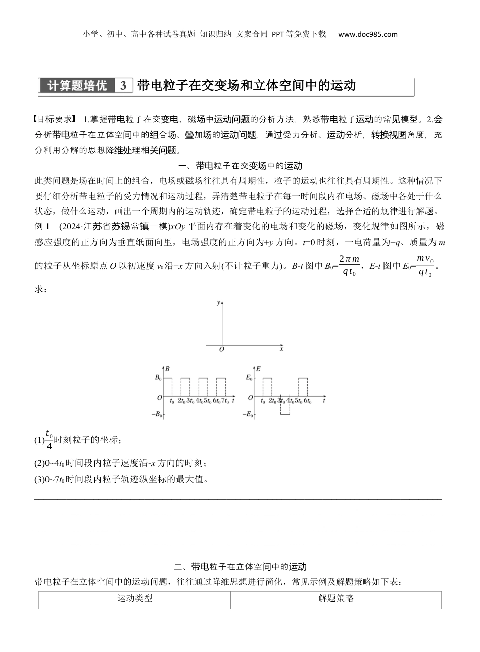小学、初中、高中各种试卷真题知识归纳文案合同PPT等免费下载www.doc985.com带电粒子在交变场和立体空间中的运动目要求标1.掌握粒子在交、磁中的分析方法,熟悉粒子的常模型。带电变电场运动问题带电运动见2.会分析粒子在立体空中的合、加的,通受力分析、分析,角度,充带电间组场叠场运动问题过运动转换视图分利用分解的思想降理相。维处关问题一、粒子在交中的带电变场运动此类问题是场在时间上的组合,电场或磁场往往具有周期性,粒子的运动也往往具有周期性。这种情况下要仔细分析带电粒子的受力情况和运动过程,弄清楚带电粒子在每一时间段内在电场、磁场中各处于什么状态,做什么运动,画出一个周期内的运动轨迹,确定带电粒子的运动过程,选择合适的规律进行解题。例1(2024·江省常一模苏苏锡镇)xOy平面内存在着变化的电场和变化的磁场,变化规律如图所示,磁感应强度的正方向为垂直纸面向里,电场强度的正方向为+y方向。t=0时刻,一电荷量为+q、质量为m的粒子从坐标原点O以初速度v0沿+x方向入射(不计粒子重力)。B-t图中B0=2πmqt0,E-t图中E0=mv0qt0。求:(1)t04时刻粒子的坐标;(2)0~4t0时间段内粒子速度沿-x方向的时刻;(3)0~7t0时间段内粒子轨迹纵坐标的最大值。____________________________________________________________________________________________________________________________________________________________________________________________________________________________________________________________________________________________________________________________________________________________________二、粒子在立体空中的带电间运动带电粒子在立体空间中的运动问题,往往通过降维思想进行简化,常见示例及解题策略如下表:运动类型解题策略小学、初中、高中各种试卷真题知识归纳文案合同PPT等免费下载www.doc985.com在三维坐标系中运动,每个轴方向都是常见运动模型将粒子的运动分解为三个方向的运动一维加一面,如旋进运动旋进运动将粒子的运动分解为一个轴方向的匀速直线运动或匀变速直线运动和垂直该轴所在面内的圆周运动运动所在平面切换,粒子进入下一区域偏转后曲线不在原来的平面内把粒子运动所在的面隔离出来,转换视图角度,把立体图转化为平面图,分析粒子在每个面的运动例2(2024·福建三明市一模)如图所示,在O-xyz三维坐标系中,y>0空间一侧有沿y轴负方向的匀强电场,y<0空间一侧有沿y轴负方向的匀强磁场。一带正电粒子以速度v0从x轴上的A点(-d,0,0)处在xOy平面内沿与x轴正方向成37°角射入电场中,已知粒子质量为m,电荷量为q,粒子恰好经过O点,磁感应强度大小为B=mv0qd,sin37°=0.6,cos37°=0.8,粒子的重力忽略不计,求:(1)匀强电场的电场强度E;(2)粒子射入电场开始计时,第n次经过y轴的时刻。____________________________________________________________________________________________________________________________________________________________________________________________________________________________________________________________________________________________________________________________________________________________________例3(2024·湖南卷·14)如图,有一内半径为2r、长为L的圆筒,左右端面圆心O'、O处各开有一小孔。以O为坐标原点,取O'O方向为x轴正方向建立xyz坐标系。在筒内x≤0区域有一匀强磁场,磁感应强度大小为B,方向沿x轴正方向;筒外x≥0区域有一匀强电场,场强大小为E,方向沿y轴正方向。一电子枪在O'处向圆筒内多个方向发射电子,电子初速度方向均在xOy平面内,且在x轴正方向的分速度大小均为v0。已知电子的质量为m、电量为e,设电子始终未与筒壁碰撞,不计电子之间的相互作用及电子的重力。(1)若所有电子均能经过O进入电场,求磁感应强度B的最小值;小学、初中、高中各种试卷真题知识归纳文案合同PPT等免费下载www.doc985.com(2)取(1)问中最小的磁感应强度B,若进入磁场中电子的速度方向与x轴正方向最大夹角为θ,求tanθ的绝对值...