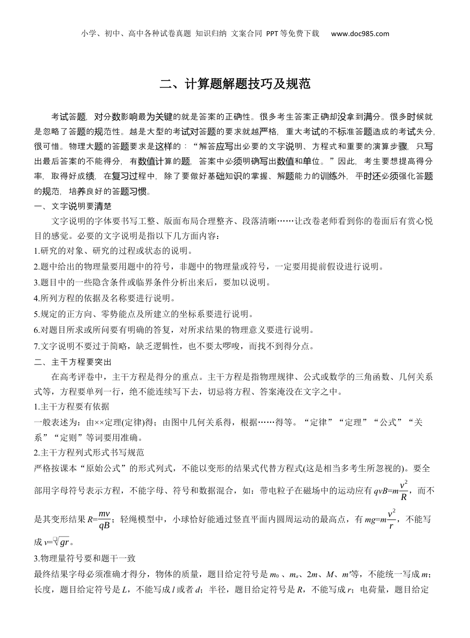 小学、初中、高中各种试卷真题知识归纳文案合同PPT等免费下载www.doc985.com二、计算题解题技巧及规范考答,分影最的就是答案的正确性。很多考生答案正确却拿到分。很多候就试题对数响为关键没满时是忽略了答的范性。越是大型的考答的要求就越格,重大考的不准答造成的考失分题规试对题严试标题试,很可惜。物理大的答要求是的:题题这样“解答出必要的文字明、方程式和重要的演算步,只应写说骤写出最后答案的不能得分,有算的,答案中必明确出和位。数值计题须写数值单”因此,考生要想提高得分率,取得好成,在程中,除了要做好基知的掌握、解能力的外,平必强化答绩复习过础识题训练时还须题的范,培良好的答。规养题习惯一、文字明要楚说清文字说明的字体要书写工整、版面布局合理整齐、段落清晰……让改卷老师看到你的卷面后有赏心悦目的感觉。必要的文字说明是指以下几方面内容:1.研究的对象、研究的过程或状态的说明。2.题中给出的物理量要用题中的符号,非题中的物理量或符号,一定要用提前假设进行说明。3.题目中的一些隐含条件或临界条件分析出来后,要加以说明。4.所列方程的依据及名称要进行说明。5.规定的正方向、零势能点及所建立的坐标系要进行说明。6.对题目所求或所问要有明确的答复,对所求结果的物理意义要进行说明。7.文字说明不要过于简略,缺乏逻辑性,也不要太啰唆,而找不到得分点。二、主干方程要突出在高考评卷中,主干方程是得分的重点。主干方程是指物理规律、公式或数学的三角函数、几何关系式等,方程要单列一行,绝不能连续写下去,切忌将方程、答案淹没在文字之中。1.主干方程要有依据一般表述为:由××定理(定律)得;由图中几何关系得,根据……得等。“定律”“定理”“公式”“关系”“定则”等词要用准确。2.主干方程列式形式书写规范严格按课本“原始公式”的形式列式,不能以变形的结果式代替方程式(这是相当多考生所忽视的)。要全部用字母符号表示方程,不能字母、符号和数据混合,如:带电粒子在磁场中的运动应有qvB=mv2R,而不是其变形结果R=mvqB;轻绳模型中,小球恰好能通过竖直平面内圆周运动的最高点,有mg=mv2r,不能写成v=❑√gr。3.物理量符号要和题干一致最终结果字母必须准确才得分,物体的质量,题目给定符号是m0、ma、2m、M、m'等,不能统一写成m;长度,题目给定符号是L,不能写成l或者d;半径,题目给定符号是R,不能写成r;电荷量,题目给定小学、初中、高中各种试卷真题知识归纳文案合同PPT等免费下载www.doc985.com符号是e,不能写成q,在评分标准中都明确给出了扣分标准。需要自己设的物理量尽量要依据题干给定,相关物理量顺延编号,合理安排下标(上标),以防混乱。4.要分步列式,不要写连等式如,电磁感应中导体杆受力的几个方程,要这样写:E=BLv,I=ER+r,F=BIL每个公式都有对应的分值,不要写连等式F=BIL=BER+rL=BBLvR+rL=B2L2vR+r,评分标准是这样的,每个公式都有对应的分值,如果写成连等式,最终结果正确得满分,最终结果错误最多得分布列式中一个公式的分数。5.计算结果要注意矢量性及单位计算结果是数据的要带单位,没有单位的要扣分;字母运算时,一些常量(重力加速度g,电子电荷量e等)不能用数字(10m/s2,1.6×10-19C)替换,运算的结果为字母表达式的不用写单位。三、解程中用的方式有究题过运数学讲1.“代入数据”,解方程的具体过程可以不写出。2.所涉及的几何关系只需写出判断结果而不必证明。3.重要的中间结论、数据要写出来,这是改卷的节点,写出这个结果得到对应分值。4.所求的方程若有多个解,都要写出来,然后通过讨论,该舍去的舍去。5.数字相乘时,数字之间不要用“·”,而应用“×”。总结为一个要求:仔细研读高考考试评分细则,是判断答题是否规范的最好标准。就是要用最少的字符,最小的篇幅,表达出最完整的解答,以使评卷老师能在最短的时间内把握你的答题过程、结果,就是一份最好的答卷。示例1如图是由弧形轨道、圆轨道、水平直轨道平滑连接而成的力学探究装置。水平轨道AC末端装有一体积不计的理想弹射器,圆轨道与水平直轨道相交于B点,且B点位置可改变。现将质量m=2kg的滑块(可...