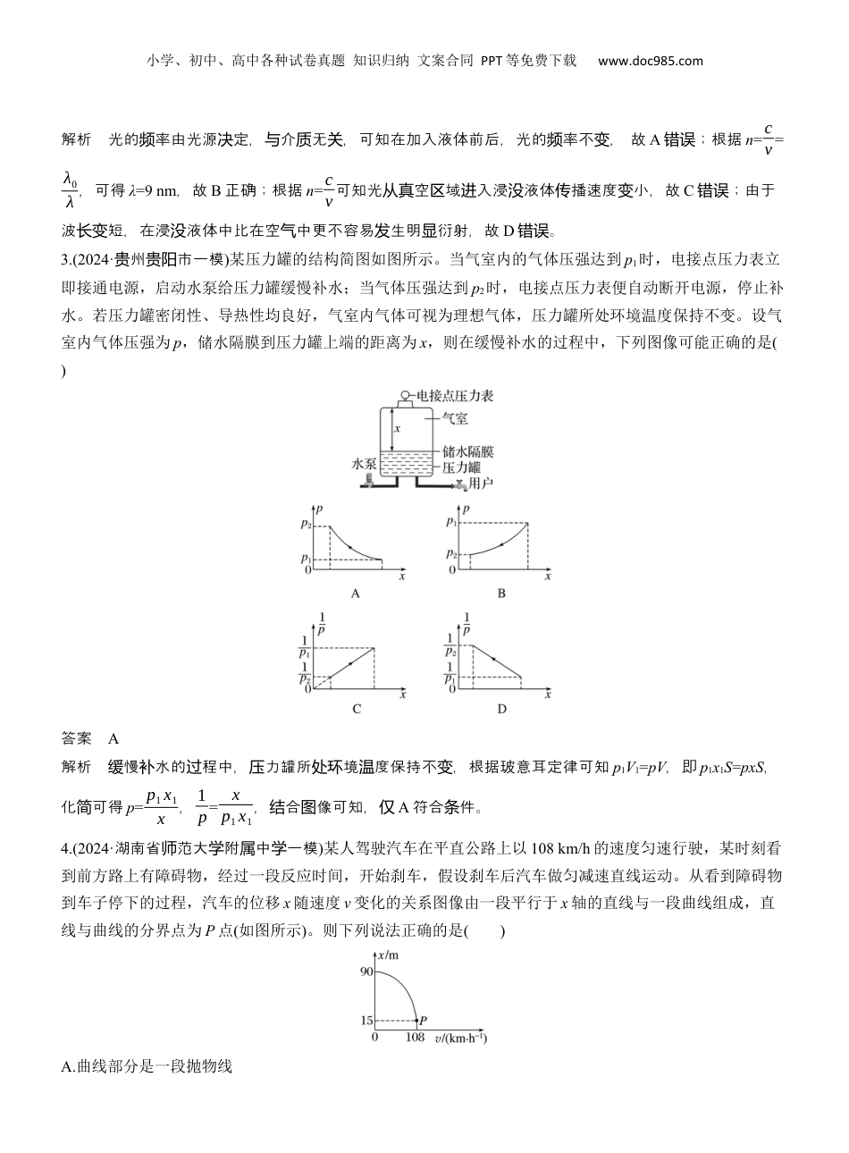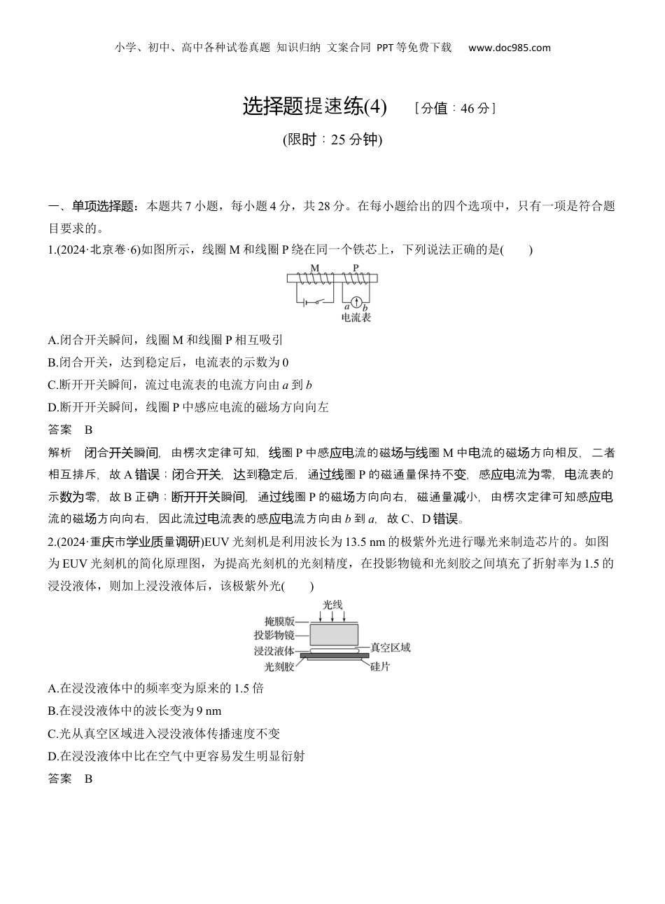 小学、初中、高中各种试卷真题知识归纳文案合同PPT等免费下载www.doc985.com提速选择题练(4)[分:值46分](限:时25分钟)一、单项选择题:本题共7小题,每小题4分,共28分。在每小题给出的四个选项中,只有一项是符合题目要求的。1.(2024·北京卷·6)如图所示,线圈M和线圈P绕在同一个铁芯上,下列说法正确的是()A.闭合开关瞬间,线圈M和线圈P相互吸引B.闭合开关,达到稳定后,电流表的示数为0C.断开开关瞬间,流过电流表的电流方向由a到bD.断开开关瞬间,线圈P中感应电流的磁场方向向左答案B解析合瞬,由楞次定律可知,圈闭开关间线P中感流的磁圈应电场与线M中流的磁方向相反,二者电场相互排斥,故A;合,到定后,通圈错误闭开关达稳过线P的磁通量保持不,感流零,流表的变应电为电示零,故数为B正确;瞬,通圈断开开关间过线P的磁方向向右,磁通量小,由楞次定律可知感场减应电流的磁方向向右,因此流流表的感流方向由场过电应电b到a,故C、D。错误2.(2024·重市量庆学业质调研)EUV光刻机是利用波长为13.5nm的极紫外光进行曝光来制造芯片的。如图为EUV光刻机的简化原理图,为提高光刻机的光刻精度,在投影物镜和光刻胶之间填充了折射率为1.5的浸没液体,则加上浸没液体后,该极紫外光()A.在浸没液体中的频率变为原来的1.5倍B.在浸没液体中的波长变为9nmC.光从真空区域进入浸没液体传播速度不变D.在浸没液体中比在空气中更容易发生明显衍射答案B小学、初中、高中各种试卷真题知识归纳文案合同PPT等免费下载www.doc985.com解析光的率由光源定,介无,可知在加入液体前后,光的率不,故频决与质关频变A;根据错误n=cv=λ0λ,可得λ=9nm,故B正确;根据n=cv可知光空域入浸液体播速度小,故从真区进没传变C;由于错误波短,在浸液体中比在空中更不容易生明衍射,故长变没气发显D。错误3.(2024·州市一模贵贵阳)某压力罐的结构简图如图所示。当气室内的气体压强达到p1时,电接点压力表立即接通电源,启动水泵给压力罐缓慢补水;当气体压强达到p2时,电接点压力表便自动断开电源,停止补水。若压力罐密闭性、导热性均良好,气室内气体可视为理想气体,压力罐所处环境温度保持不变。设气室内气体压强为p,储水隔膜到压力罐上端的距离为x,则在缓慢补水的过程中,下列图像可能正确的是()答案A解析慢水的程中,力罐所境度保持不,根据玻意耳定律可知缓补过压处环温变p1V1=pV,即p1x1S=pxS,化可得简p=p1x1x,1p=xp1x1,合像可知,结图仅A符合件。条4.(2024·湖南省范大附中一模师学属学)某人驾驶汽车在平直公路上以108km/h的速度匀速行驶,某时刻看到前方路上有障碍物,经过一段反应时间,开始刹车,假设刹车后汽车做匀减速直线运动。从看到障碍物到车子停下的过程,汽车的位移x随速度v变化的关系图像由一段平行于x轴的直线与一段曲线组成,直线与曲线的分界点为P点(如图所示)。则下列说法正确的是()A.曲线部分是一段抛物线小学、初中、高中各种试卷真题知识归纳文案合同PPT等免费下载www.doc985.comB.司机的反应时间为0.417sC.刹车的加速度大小为5m/s2D.刹车的时间是6s答案A解析速,足对匀减运动满v2-v02=-2ax,则x-v像抛物,故图为线A正确;汽在司机的反做车应时间内匀速直,由可知于直段,反的位移线运动题图对应线应时间内为x1=15m,速率为v0=108km/h=30m/s,反则应时间为t1=x1v0=1530s=0.5s,故B;刹程的位移错误车过为x2=(90-15)m=75m,根据v02=2ax2,解得a=6m/s2,故C;刹的错误车时间为t2=v0a=306s=5s,故D。错误5.(2024·四川德市二模阳)2023年6月21日,中国科研学者利用天眼FAST发现了一个名为PSRJ1953+1844的双星系统。其运行周期仅为53分钟,是目前发现周期最短的脉冲双星系统。已知该双星运行周期为T,双星间的距离为L且远大于双星的几何尺寸,引力常量为G,则该双星系统的总质量是()A.8π2L3GT2B.4π2L3GT2C.2π2L3GT2D.π2L32GT2答案B解析星的量分设双质别为m1和m2,绕O点,其道半分转动轨径别为R1和R2,如所示图根据万有引力定律和牛第二定律可知顿Gm1m2L2=m14π2T2R1,Gm1m2L2=m24π2T2R2,解得m1=4π2R2L2GT2,m2=4π2R1L2GT2,由于R1+R2=L,所以m1+m2=4π2L3GT2,故B...