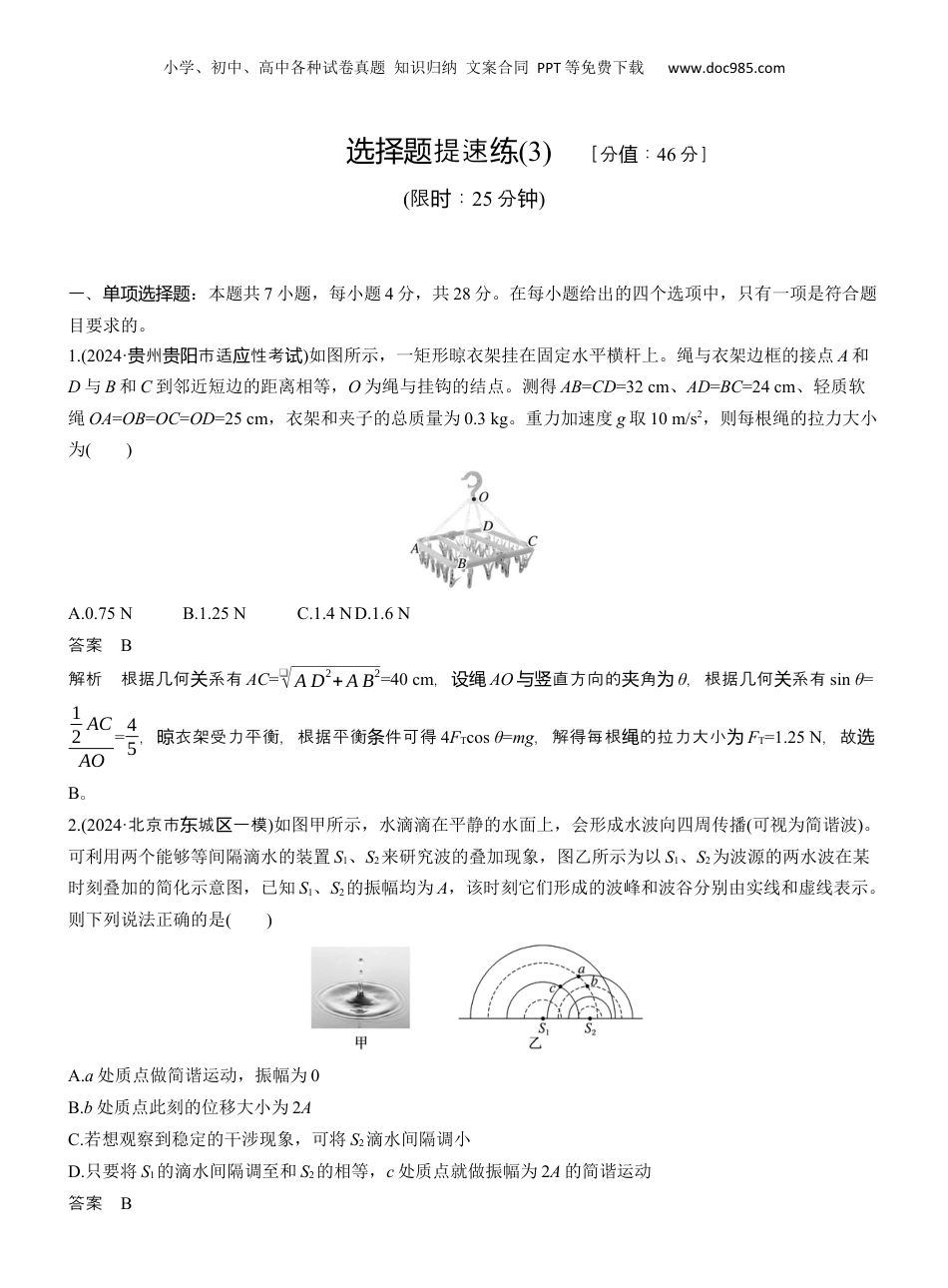 小学、初中、高中各种试卷真题知识归纳文案合同PPT等免费下载www.doc985.com提速选择题练(3)[分:值46分](限:时25分钟)一、单项选择题:本题共7小题,每小题4分,共28分。在每小题给出的四个选项中,只有一项是符合题目要求的。1.(2024·州市适性考贵贵阳应试)如图所示,一矩形晾衣架挂在固定水平横杆上。绳与衣架边框的接点A和D与B和C到邻近短边的距离相等,O为绳与挂钩的结点。测得AB=CD=32cm、AD=BC=24cm、轻质软绳OA=OB=OC=OD=25cm,衣架和夹子的总质量为0.3kg。重力加速度g取10m/s2,则每根绳的拉力大小为()A.0.75NB.1.25NC.1.4ND.1.6N答案B解析根据几何系有关AC=❑√AD2+AB2=40cm,设绳AO直方向的角与竖夹为θ,根据几何系有关sinθ=12ACAO=45,衣架受力平衡,根据平衡件可得晾条4FTcosθ=mg,解得每根的拉力大小绳为FT=1.25N,故选B。2.(2024·北京市城一模东区)如图甲所示,水滴滴在平静的水面上,会形成水波向四周传播(可视为简谐波)。可利用两个能够等间隔滴水的装置S1、S2来研究波的叠加现象,图乙所示为以S1、S2为波源的两水波在某时刻叠加的简化示意图,已知S1、S2的振幅均为A,该时刻它们形成的波峰和波谷分别由实线和虚线表示。则下列说法正确的是()A.a处质点做简谐运动,振幅为0B.b处质点此刻的位移大小为2AC.若想观察到稳定的干涉现象,可将S2滴水间隔调小D.只要将S1的滴水间隔调至和S2的相等,c处质点就做振幅为2A的简谐运动答案B小学、初中、高中各种试卷真题知识归纳文案合同PPT等免费下载www.doc985.com解析由乙可知,题图a的点此刻于列波的波峰波谷相遇的点,由波的加知可知,此处质时处两与叠识时刻a速度零。在同一介中,不同的机械波的波速相等,根据处为质v=λf,由乙知波源题图S2的波小,所长以波源S2的率大,即列波的率不同,列波无法生定的干涉象,所以频较两频两发稳现a的点不是一处质并直于止,即处静状态a点的振幅不零,故处质为A;由可知,项错误题图b的点此刻于列波的处质时处两波谷波谷相遇的点,由波的加知可知,此刻点的位移大小与叠识时该处质为2A,故B正确;在同一介项质中,不同的机械波的波速相等,根据v=λf,由乙知波源题图S2的波小,所以波源长S2的率大,察频较为观到定的干涉,可稳图样将S2的率小,即频调将S2滴水隔大,故间调C;装置的滴水隔至相项错误将两间调等,此列波的率相同,生定的干涉象,但是时两频会产稳现c的点其不一定于振加强点,即处质处动c处的点不一定做振幅质为2A的,故简谐运动D。项错误3.(2024·河北保定市一模)如图甲所示,一辆小轿车从服务区匝道驶入平直高速行车道时速率为20m/s,想要加速驶入内车道,由于行车道前方匀速运动的大货车速度较小,影响超车。小轿车加速8s后放弃超车,立即减速,再经过3s,与大货车同速跟随,再伺机超车。该过程小轿车的速度与时间的关系如图乙所示,下列说法中正确的是()A.该过程小轿车的平均加速度大小为1.25m/s2B.该过程小轿车的平均加速度大小为211m/s2C.该过程小轿车与大货车之间的距离先减小后增大D.该过程小轿车与大货车之间的距离先增大后减小答案B解析程小的平均加速度大小该过轿车为a=|ΔvΔt|=|18−2011|m/s2=211m/s2,故A,错误B正确;程小该过的速度一直大于大的速度,所以程小大之的距离一直小,故轿车货车该过轿车与货车间减C、D。错误4.(2024·广卷东·1)将阻值为50Ω的电阻接在正弦式交流电源上。电阻两端电压随时间的变化规律如图所示。下列说法正确的是()A.该交流电的频率为100HzB.通过电阻电流的峰值为0.2AC.电阻在1秒内消耗的电能为1J小学、初中、高中各种试卷真题知识归纳文案合同PPT等免费下载www.doc985.comD.电阻两端电压表达式为u=10❑√2sin(100πt)V答案D解析由可知交流的周期题图电为0.02s,率则频为f=1T=50Hz,故A;错误根据可知的峰题图电压值为10❑√2V,根据姆定律,流的峰欧电值Im=UmR=10❑√2V50Ω=0.2❑√2A,故B;错误流的有效电值为I=Im❑√2=0.2A所以阻在电1秒消耗的能内电W=I2Rt=0.22×50×1J=2J,故C;错误根据可知阻端表式题图电两电压达为u=Umsinωt=Umsin(2πTt)=10❑√2sin(100πt)V,故D正确。5.(2024·浙江省域盟一模县教研联...