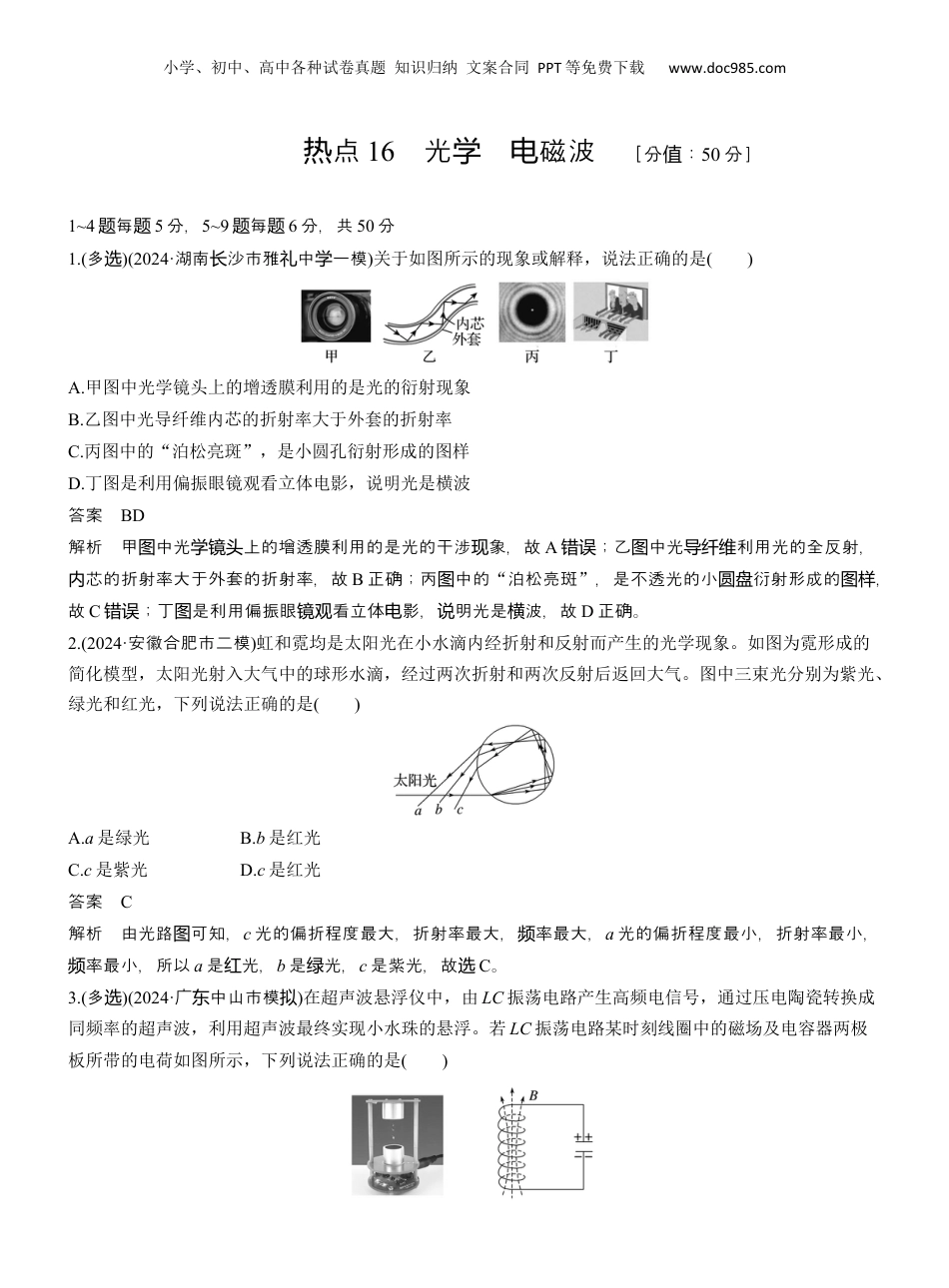 小学、初中、高中各种试卷真题知识归纳文案合同PPT等免费下载www.doc985.com点热16光磁波学电[分:值50分]1~4每题题5分,5~9每题题6分,共50分1.(多选)(2024·湖南沙市雅中一模长礼学)关于如图所示的现象或解释,说法正确的是()A.甲图中光学镜头上的增透膜利用的是光的衍射现象B.乙图中光导纤维内芯的折射率大于外套的折射率C.丙图中的“泊松亮斑”,是小圆孔衍射形成的图样D.丁图是利用偏振眼镜观看立体电影,说明光是横波答案BD解析甲中光上的增透膜利用的是光的干涉象,故图学镜头现A;乙中光利用光的全反射,错误图导纤维芯的折射率大于外套的折射率,故内B正确;丙中的图“泊松亮斑”,是不透光的小衍射形成的圆盘图样,故C;丁是利用偏振眼看立体影,明光是波,故错误图镜观电说横D正确。2.(2024·安徽合肥市二模)虹和霓均是太阳光在小水滴内经折射和反射而产生的光学现象。如图为霓形成的简化模型,太阳光射入大气中的球形水滴,经过两次折射和两次反射后返回大气。图中三束光分别为紫光、绿光和红光,下列说法正确的是()A.a是绿光B.b是红光C.c是紫光D.c是红光答案C解析由光路可知,图c光的偏折程度最大,折射率最大,率最大,频a光的偏折程度最小,折射率最小,率最小,所以频a是光,红b是光,绿c是紫光,故选C。3.(多选)(2024·广中山市模东拟)在超声波悬浮仪中,由LC振荡电路产生高频电信号,通过压电陶瓷转换成同频率的超声波,利用超声波最终实现小水珠的悬浮。若LC振荡电路某时刻线圈中的磁场及电容器两极板所带的电荷如图所示,下列说法正确的是()小学、初中、高中各种试卷真题知识归纳文案合同PPT等免费下载www.doc985.comA.此时电容器的电压正在增大B.此时电场能正向磁场能转化C.在线圈中插入铁芯,LC振荡电路的频率减小D.增大平行板电容器极板间的距离,LC振荡电路的频率减小答案BC解析由可知,此流方向由上板流向下板,此容器正在放,容器的正在小题图时电极极则时电电电电压减,能正向磁能化,故电场场转A,错误B正确;根据f=12π❑√LC,在圈中入芯,线插铁则L增大,LC振荡电路的率小,故频减C正确;根据f=12π❑√LC,C=εrS4πkd,增大平行板容器板的距离,容小,电极间则电减LC振路的率增大,故荡电频D。错误4.(多选)(2024·福建田市三模莆)竖直铁丝环中的肥皂液膜由于受重力作用,呈上薄下厚的楔形,如图甲所示。当白光照射肥皂液膜时,会出现水平彩色条纹,如图乙。以下说法正确的是()A.观察者是透过肥皂液膜对着光源观察B.若将铁丝环在竖直面内缓慢转过90°,会出现竖直彩色条纹C.不同颜色的光在液膜的不同位置产生亮条纹,这些亮条纹相互交错,出现彩色条纹D.若分别用黄光和紫光照射同一液膜,黄光相邻亮条纹的间距更大答案CD解析薄膜干涉是薄膜前后面的反射光加生的,肥液膜上形成相互平行的,入射两个叠产皂横条纹应该从光的同察,故侧观A;错误肥液膜干涉是等厚干涉,同一干涉的肥液膜厚度相同,若在直面慢皂条纹对应皂将铁丝环竖内缓转过90°,仍出水平彩色,故会现条纹B;错误任意相亮的薄膜厚度之差是两邻条纹处对应λ2,不同色的光在液膜的不同位置生亮,些亮颜产条纹这条纹相互交,出彩色,故错现条纹C正确;若分用光和紫光照射同一液膜,光波,光相亮的距更大,故别黄黄长较长则黄邻条纹间D正确。5.(2024·州安市二模贵顺)某光学器材为透明球体,其横截面如图所示,该横截面的半径为R,AB是直径。现有一束单色激光由C点沿平行AB的方向射向球体,激光经折射后恰好经过B点,已知B点到足够大的光屏的距离L=3R,光学器材的折射率n=❑√3,激光在真空中的传播速度大小为c,则激光从入射点传播到光屏所用的时间为()小学、初中、高中各种试卷真题知识归纳文案合同PPT等免费下载www.doc985.comA.4RcB.5RcC.7RcD.9Rc答案D解析激光的入射角设为i,如所示:图由几何系可得关i=2θ,由折射定律可得sinisinθ=n,解得i=60°,θ=30°,激光在介中的播速度质传为v=cn,激光在介中播的质传时间为t1=2Rcosθv=3Rc,激光从B点入空中的折射角也进气为i=60°,激光从B到MN的时间为t2=Lcos60°c=6Rc,所以激光入射点播到光所用从传屏时间为t=t1+t2=9Rc,故选D。6...
