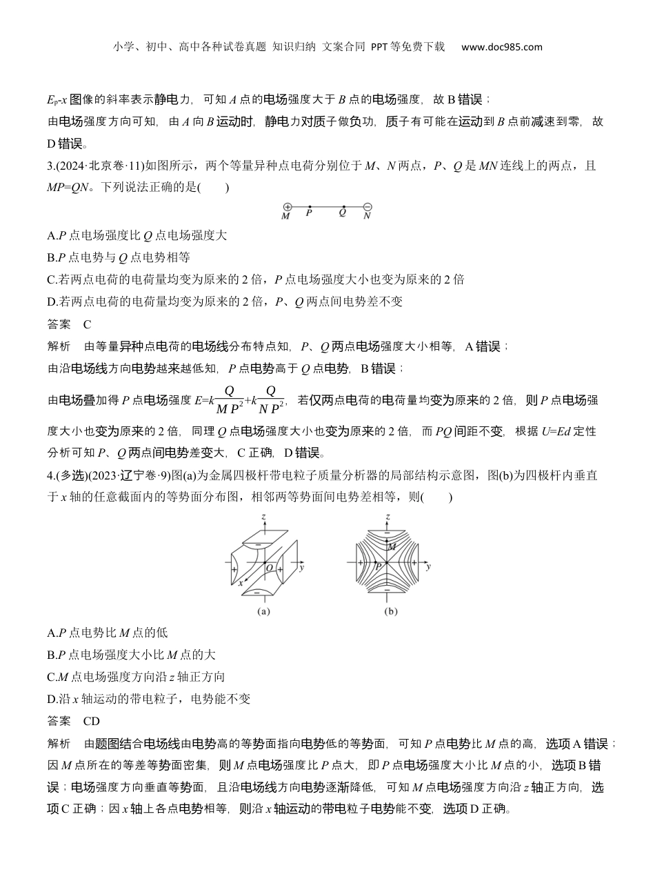 小学、初中、高中各种试卷真题知识归纳文案合同PPT等免费下载www.doc985.com点热8的性电场质[分:值50分]1~4每题题5分,5~9每题题6分,共50分1.(2024·江淮安市模苏拟)如图甲、乙所示,两个带电荷量均为q的点电荷分别位于带电荷量线密度相同、半径相同的半圆环和34圆环的圆心,环的粗细可忽略不计。若图甲中环对圆心点电荷的库仑力大小为F,则图乙中环对圆心点电荷的库仑力大小为()A.32FB.12FC.❑√22FD.❑√32F答案C解析由甲中均半心点荷的力大小题图匀带电圆环对圆电库仑为F,可以得出14心点荷的圆环对圆电库仑力大小为❑√22F。乙中的均将题图匀带电34分成三圆环个14,于心的圆环关圆对称两个14心点荷圆环对圆电的力的合力零,因此乙中的库仑为题图34心点荷的力大小圆环对圆电库仑为❑√22F,故C正确,A、B、D。错误2.(2024·黑江、宁名校考龙辽联)如图甲所示,AB是某电场中的一条电场线,若有一电子以某一初速度且仅在静电力的作用下沿AB由A点运动到B点,其电势能Ep随距A点的距离x变化的规律如图乙所示。下列说法正确的是()A.电场的方向由A指向BB.A点的电场强度小于B点的电场强度C.电子在A点的速度小于在B点的速度D.若一质子以同一初速度由A点释放,一定能运动到B点答案C解析由乙可知,子的能小,力做正功,故子的速度大,又子,故题图电电势减则静电电变电带负电电场的方向由B指向A,故A,错误C正确;小学、初中、高中各种试卷真题知识归纳文案合同PPT等免费下载www.doc985.comEp-x像的斜率表示力,可知图静电A点的强度大于电场B点的强度,故电场B;错误由强度方向可知,由电场A向B,力子做功,子有可能在到运动时静电对质负质运动B点前速到零,故减D。错误3.(2024·北京卷·11)如图所示,两个等量异种点电荷分别位于M、N两点,P、Q是MN连线上的两点,且MP=QN。下列说法正确的是()A.P点电场强度比Q点电场强度大B.P点电势与Q点电势相等C.若两点电荷的电荷量均变为原来的2倍,P点电场强度大小也变为原来的2倍D.若两点电荷的电荷量均变为原来的2倍,P、Q两点间电势差不变答案C解析由等量点荷的分布特点知,异种电电场线P、Q点强度大小相等,两电场A;错误由沿方向越越低知,电场线电势来P点高于电势Q点,电势B;错误由加得电场叠P点强度电场E=kQMP2+kQNP2,若点荷的荷量均原的仅两电电变为来2倍,则P点强电场度大小也原的变为来2倍,同理Q点强度大小也原的电场变为来2倍,而PQ距不,根据间变U=Ed定性分析可知P、Q点差大,两间电势变C正确,D。错误4.(多选)(2023·宁卷辽·9)图(a)为金属四极杆带电粒子质量分析器的局部结构示意图,图(b)为四极杆内垂直于x轴的任意截面内的等势面分布图,相邻两等势面间电势差相等,则()A.P点电势比M点的低B.P点电场强度大小比M点的大C.M点电场强度方向沿z轴正方向D.沿x轴运动的带电粒子,电势能不变答案CD解析由合由高的等面指向低的等面,可知题图结电场线电势势电势势P点比电势M点的高,选项A错误;因M点所在的等差等面密集,势则M点强度比电场P点大,即P点强度大小比电场M点的小,选项B错;强度方向垂直等面,且沿方向逐降低,可知误电场势电场线电势渐M点强度方向沿电场z正方向,轴选项C正确;因x上各点相等,沿轴电势则x的粒子能不,轴运动带电电势变选项D正确。小学、初中、高中各种试卷真题知识归纳文案合同PPT等免费下载www.doc985.com5.(2024·江淮安市三模苏)如图所示,在x轴上相距为3L的两点固定两个点电荷+Q、+2Q,虚线是以+Q所在点为圆心、L为半径的圆,a、b、c、d是圆上的四个点,其中a、c两点在x轴上,b、d两点关于x轴对称。下列判断正确的是()A.b、d两点处电场强度相同B.四点中c点处的电势最低C.将一正试探电荷沿圆周由a点移至c点,电势能先减小后增大D.将一正试探电荷沿直线从b点移到d点,静电力先做负功后做正功答案D解析根据性可知对称b、d点强度大小相同,方向不同,故两处电场A;错误四点到+Q的距离相等,其中c点到+2Q的距离最近,根据的加可知电势叠c点最高,故处电势B;错误一正探荷沿周由将试电圆a点移至c点,+Q探荷的力不做功,对试电库仑+2Q探荷的力始做对试电库仑终功,探荷的能一直增大,故负试电电势C;错误易知...