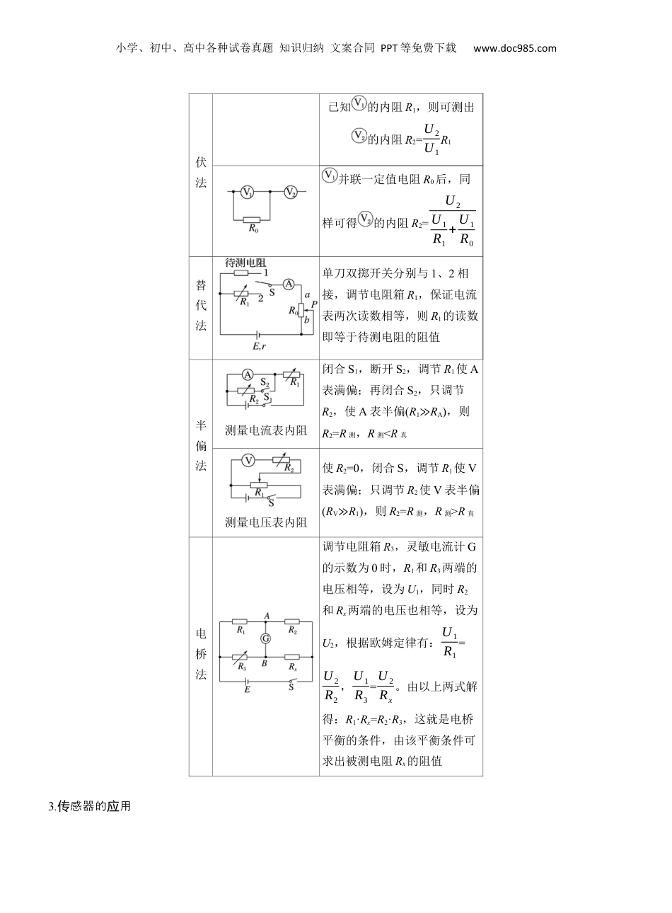 小学、初中、高中各种试卷真题知识归纳文案合同PPT等免费下载www.doc985.com第17讲电学实验目要求标1.熟掌握的基本原理和方法,借助基本分析拓展新。练电学实验并实验创实验2.掌握感器的性传质,能利用感器制作的自控制装置。传简单动考点一以阻核心的测电为实验1.伏安法阻测电金阻率的量属丝电测伏安法测电阻R测=U测I测=Rx+RA>Rx,适合测量大电阻R测=U测I测=RxRVRx+RV<Rx,适合测量小电阻金属丝电阻率的测量1.测电阻Rx=UI2.测电阻率ρ,Rx=ρLS,而S=πD24,Rx=UI,联立得ρ=πUD24IL2.量阻新方案比测电创对安安法如果已知的内阻R1,则可测得的内阻R2=I1R1I2串联一定值电阻R0后,同样可测得的内阻R2=I1(R1+R0)I2伏两电表的满偏电流接近时,若小学、初中、高中各种试卷真题知识归纳文案合同PPT等免费下载www.doc985.com伏法已知的内阻R1,则可测出的内阻R2=U2U1R1并联一定值电阻R0后,同样可得的内阻R2=U2U1R1+U1R0替代法单刀双掷开关分别与1、2相接,调节电阻箱R1,保证电流表两次读数相等,则R1的读数即等于待测电阻的阻值半偏法测量电流表内阻闭合S1,断开S2,调节R1使A表满偏;再闭合S2,只调节R2,使A表半偏(R1≫RA),则R2=R测,R测<R真测量电压表内阻使R2=0,闭合S,调节R1使V表满偏;只调节R2使V表半偏(RV≫R1),则R2=R测,R测>R真电桥法调节电阻箱R3,灵敏电流计G的示数为0时,R1和R3两端的电压相等,设为U1,同时R2和Rx两端的电压也相等,设为U2,根据欧姆定律有:U1R1=U2R2,U1R3=U2Rx。由以上两式解得:R1·Rx=R2·R3,这就是电桥平衡的条件,由该平衡条件可求出被测电阻Rx的阻值3.感器的用传应小学、初中、高中各种试卷真题知识归纳文案合同PPT等免费下载www.doc985.com例1(2024·山卷东·14)某学习小组对两种型号铅笔芯的电阻率进行测量。实验器材如下:学生电源(输出电压0~16V)滑动变阻器(最大阻值10Ω,额定电流2A);电压表V(量程3V,内阻未知);电流表A(量程3A,内阻未知);待测铅笔芯R(X型号、Y型号);游标卡尺,螺旋测微器,开关S,单刀双掷开关K,导线若干。回答以下问题:(1)使用螺旋测微器测量铅笔芯直径,某次测量结果如图甲所示,该读数为mm;(2)把待测铅笔芯接入图乙所示电路,闭合开关S后,将滑动变阻器滑片由最右端向左调节到合适位置,将单刀双掷开关K分别掷到1、2端,观察到电压表示数变化比电流表示数变化更明显,则测量铅笔芯电阻时应将K掷到(填“1”或“2”)端;小学、初中、高中各种试卷真题知识归纳文案合同PPT等免费下载www.doc985.com(3)正确连接电路,得到Y型号铅笔芯I-U图像如图丙所示,求得电阻RY=Ω(保留3位有效数字);采用同样方法得到X型号铅笔芯的电阻为1.70Ω;(4)使用游标卡尺测得X、Y型号铅笔芯的长度分别为40.68mm、60.78mm,使用螺旋测微器测得X、Y型号铅笔芯直径近似相等,则X型号铅笔芯的电阻率(填“大于”或“小于”)Y型号铅笔芯的电阻率。答案(1)2.450(2)1(3)1.91(4)大于解析(1)根据螺旋微器的可知,其测读数规则读数为d=2mm+0.01×45.0mm=2.450mm(2)由于表示化更明,明流表分多,因此流表采用外接法,即量芯阻电压数变显说电压较电应测铅笔电时应将K到掷1端;(3)根据丙的题图I-U像,合姆定律有图结欧RY=2.50V1.31A≈1.91Ω(4)根据阻定律电R=ρlS,可得ρ=RSl因材料的截面近似相等,分代入据可知两种横积别数ρX>ρY。例2(2024·四川雅安市三模)某实验小组为了测量某电压表V的内阻,他们找到如下实验器材:学生直流电源E电阻箱R(最大阻值9999Ω)标准电压表V0滑动变阻器R1(最大阻值50Ω)滑动变阻器R2(最大阻值500Ω)开关、导线若干(1)他们设计了如图甲所示实验电路图,滑动变阻器应选择(填“R1”或“R2”)。(2)正确连接电路后,调节滑动变阻器滑片至最端(填“左”或“右”),电阻箱阻值调为(填“零”或“最大值”);闭合开关,调节滑动变阻器使电压表满偏;保持滑动变阻器滑片位置不动,调节电阻箱阻值,使电压表半偏,此时电阻箱示数如图乙所示,则可认为电压表内阻为Ω。小学、初中、高中各种试卷真题知识归纳文案合同PPT等免费下载www.doc985.com(3)该实验存在系统误差,电压表实际内阻应此时电阻箱阻值(填“大于”“小于”...