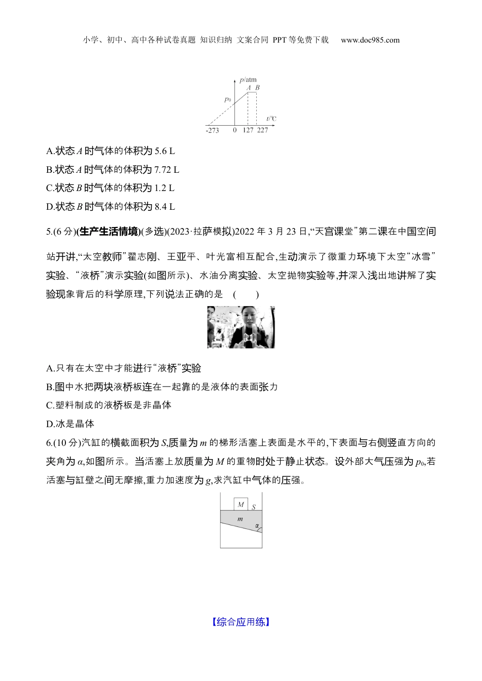 小学、初中、高中各种试卷真题知识归纳文案合同PPT等免费下载www.doc985.com四十二固体、液体和气体(40分钟80分)【基固】础巩练1.(6分)于体强的法关气压说,下列法不正确的是说()A.一定量的理想体度不升高质气温断,其强一定不增大压断B.体器壁生的强等于作用在器壁位面上的平均作用力气对产压单积C.大量体分子容器壁的持性作用形成体的强气对续气压D.体强跟体分子的平均能和体分子的密集程度有气压气动气关2.(6分)(2023·金模华拟)型防水是在市上广泛售的特殊防水。其原理是在喷雾剂现场销剂喷剂玻璃上形成一薄薄的保膜层护,形成似于荷叶外表的效果。水滴以球形分布在表面类椭,故无法停留在玻璃上。而在遇到雨水的候从时,雨水自然流走会,保持野晰视清,如所示。下列图说法正确的是()A.水滴呈球形是液体表面力作用的果椭张结,重力无与关B.照片中的玻璃和水滴生了浸象发润现C.水滴玻璃表面接的那水分子距比水滴部的水分子距大与触层间内间D.照片中水滴表面分子比水滴的部密集内3.(6分)口向上开,性能良好的汽缸导热,用活塞封了一定量的理想体闭质气,如所示。汽缸图与活塞的摩擦忽略不。向活塞上倒上沙间计现缓缓细,下列密封体的像中可能正确的是则气图()4.(6分)0.3mol的某体的强和度的系像种气压温关图(p-t像图)如所示。图p0表示1准大个标气压,准标状态(0℃,1准大个标气压)下体的摩尔体气积为22.4L∙mol-1。下列法正确的是说()小学、初中、高中各种试卷真题知识归纳文案合同PPT等免费下载www.doc985.comA.状态A体的体时气积为5.6LB.状态A体的体时气积为7.72LC.状态B体的体时气积为1.2LD.状态B体的体时气积为8.4L5.(6分)(生产生活情境)(多选)(2023·拉模萨拟)2022年3月23日,“天堂”第二在中空宫课课国间站开讲,“太空”翟志、王平、叶光富相互配合教师刚亚,生演示了微重力境下太空“冰雪”动环、“液”演示实验桥实验(如所示图)、水油分离、太空抛物等实验实验,深入出地解了并浅讲实象背后的科原理验现学,下列法正确的是说()A.只有在太空中才能行“液”进桥实验B.中水把液板在一起靠的是液体的表面力图两块桥连张C.塑料制成的液板是非晶体桥D.冰是晶体6.(10分)汽缸的截面横积为S,量质为m的梯形活塞上表面是水平的,下表面右直方向的与侧竖角夹为α,如所示。活塞上放量图当质为M的重物于止。外部大强时处静状态设气压为p0,若活塞缸壁之无摩擦与间,重力加速度为g,求汽缸中体的强。气压【合用】综应练小学、初中、高中各种试卷真题知识归纳文案合同PPT等免费下载www.doc985.com7.(6分)(2023·江考苏选择)如所示图,密容器一定量的理想体由闭内质气状态A化到变状态B。程中该过()A.体分子的密度增大气数B.体分子的平均能增大气动C.位体分子位面器壁的作用力小单时间内气对单积减D.位位面器壁撞的体分子小单时间内与单积碰气数减8.(6分)(2023·沈模阳拟)如所示图,一定量的理想体质气,由状态a经状态b化到变状态c,则选中一化程相符合的是项与这变过()9.(6分)(多选)(2024·封模开拟)土法爆米花已成一代人童年的美好回。如所示一土为忆图为个法爆米花容器铁质,把玉米倒入容器后盖盖将紧,然后一加一容器边热边转动,同察容器上时观强的示化压计数变,强到一定当压达值时,便可打容器开,就在打容器的瞬开间,爆米花便爆成了。已知容器的体积为V0,外界大强气压为p0,境的度环温为T0,容器的体可理想体内气视为气,玉米需要容器体强到内气压达5p0打容器才可爆成花时开,容器玉米的体忽略不内积计,下列法正说确的是()小学、初中、高中各种试卷真题知识归纳文案合同PPT等免费下载www.doc985.comA.在整加程中个热过,容器的体强氏度成正比内气压与摄温B.在加程中热过,度升高温,位、位面上体分子器壁的撞器壁的作用力单时间内单积气与碰对增大C.打容器当开时,体迅速膨气胀,玉米粒、外强差大内压变,瞬爆米花生成间D.要使玉米正常爆成花,打容器开时,容器体的度需到内气温达5T010.(6分)(2024·宁德模拟)一定量的理想体质气,在强不的情下压变况,度由温5℃升高到10℃,体的增量积为ΔV1;度由温283K升高到288K,体的增量积为ΔV2,则()A.ΔV1=ΔV2B.ΔV1>ΔV2C.ΔV1<ΔV2D.无法确定11.(6分)(多选)(2023·全乙卷改国编)于一定量...
