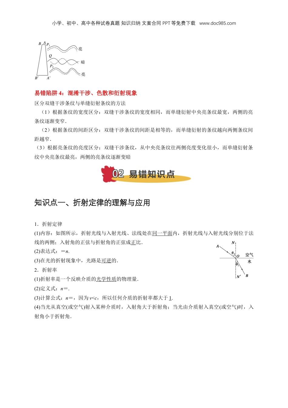 小学、初中、高中各种试卷真题知识归纳文案合同PPT等免费下载www.doc985.com易错点14不能明确光的传播路径确定折射率目录01易错陷阱易错陷阱1:混淆折射率的影响因素易错陷阱2:忽略全反射现象,肓目套用折射定律。易错陷阱3:不理解薄膜干涉形成原理,误认为是入射光和折射光叠加形成的易错陷阱4:混淆干涉、色散和衍射现象02易错知识点知识点一、折射定律的理解与应用知识点二、全反射现象的理解与应用知识点三、光路控制问题分析知识点四、光的干涉衍射和偏振03举一反三——易错题型题型一:折射率的计算题型二:全反射的计算题型三:光路控制问题题型四:光的干涉04易错题通关易错陷阱1:混淆折射率的影响因素(1)折射率由介质本身性质和光的频率决定,与入射角的大小无关。(2)折射率与介质的密度没有关系,光密介质不是指密度大的介质。(3)同一种介质中,频率越大的色光折射率越大,传播速度越小。易错陷阱2:忽略全反射现象,肓目套用折射定律。解光的折射现象的题目时,首先应做出判断:光线是从光疏媒质进入光密媒质,还是光线是从光密媒质进入光疏媒质。其次,如果是从光密媒质进入光疏媒质中,还有可能发生全反射现象,应再判断入射角是否大于临界角,明确有无折射现象。易错陷阱3:不理解薄膜干涉形成原理,误认为是入射光和折射光叠加形成的如图所示,竖直的肥皂薄膜,由于重力的作用,形成上薄下厚的楔形.光照射到薄膜上时,在膜的前表面AA′和后表面BB′分别反射回来,形成两列频率相同的光波,并且叠加.小学、初中、高中各种试卷真题知识归纳文案合同PPT等免费下载www.doc985.com易错陷阱4:混淆干涉、色散和衍射现象区分双缝干涉条纹与单缝衍射条纹的方法(1)根据条纹的宽度区分:双缝干涉条纹的宽度相同,而单缝衍射中央亮条纹最宽,两侧的亮条纹逐渐变窄.(2)根据条纹的间距区分:双缝干涉条纹的间距是相等的,而单缝衍射的条纹越向两侧条纹间距越窄.(3)根据亮条纹的亮度区分:双缝干涉条纹,从中央亮条纹往两侧亮度变化很小,而单缝衍射条纹中央亮条纹最亮,两侧的亮条纹逐渐变暗知识点一、折射定律的理解与应用1.折射定律(1)内容:如图所示,折射光线与入射光线、法线处在同一平面内,折射光线与入射光线分别位于法线的两侧;入射角的正弦与折射角的正弦成正比.(2)表达式:=n.(3)在光的折射现象中,光路是可逆的.2.折射率(1)折射率是一个反映介质的光学性质的物理量.(2)定义式:n=.(3)计算公式:n=,因为v<c,所以任何介质的折射率都大于1.(4)当光从真空(或空气)射入某种介质时,入射角大于折射角;当光由介质射入真空(或空气)时,入射角小于折射角.小学、初中、高中各种试卷真题知识归纳文案合同PPT等免费下载www.doc985.com知识点二、全反射现象的理解与应用1.定义:光从光密介质射入光疏介质,当入射角增大到某一角度时,折射光线将消失,只剩下反射光线的现象.2.条件:(1)光从光密介质射入光疏介质.(2)入射角大于或等于临界角.3.临界角:折射角等于90°时的入射角,若光从光密介质(折射率为n)射向真空或空气时,发生全反射的临界角为C,则sinC=.介质的折射率越大,发生全反射的临界角越小.知识点三、光路控制问题分析平行玻璃砖、三棱镜和圆柱体(球)对光路的控制类别项目平行玻璃砖三棱镜圆柱体(球)结构玻璃砖上下表面是平行的横截面为三角形横截面是圆对光线的作用通过平行玻璃砖的光线不改变传播方向,但要发生侧移通过三棱镜的光线经两次折射后,出射光线向棱镜底边偏折圆界面的法线是过圆心的直线,经过两次折射后向圆心偏折应用测定玻璃的折射率全反射棱镜,改变光的传播方向改变光的传播方向知识点四、光的干涉衍射和偏振1.双缝干涉(1)光能够发生干涉的条件:两光的频率相同,振动步调相同。(2)双缝干涉形成的条纹是等间距的,两相邻亮条纹或相邻暗条纹间距离与波长成正比,即Δx=λ。(3)用白光照射双缝时,形成的干涉条纹的特点:中央为白条纹,两侧为彩色条纹。(4)亮暗条纹的判断方法①如图所示,光源S1、S2发出的光到屏上某点的路程差r2-r1=kλ(k=0,1,2…)时,光屏上出现亮条纹。小学、初中、高中各种试卷真题知识...
