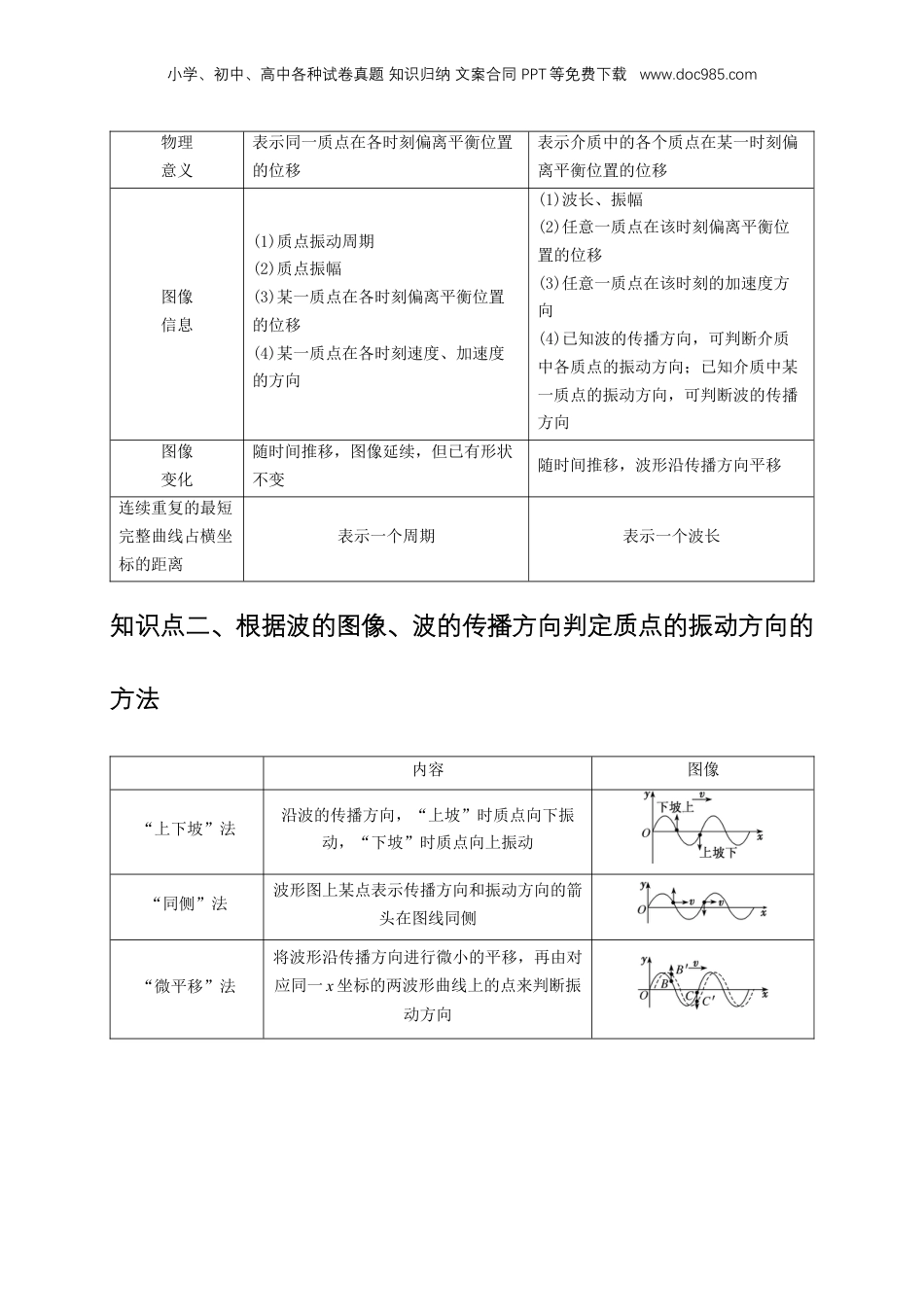 小学、初中、高中各种试卷真题知识归纳文案合同PPT等免费下载www.doc985.com易错点13不会利用波的图像计算波速波长目录01易错陷阱易错点一:不够明确简谐运动的基本描述易错点二:不够明确机械波的基本性质易错点三:理解波的传播,图像问题时出现错误易错点四:混淆波的稳定干涉条件02易错知识点知识点一、波动图像和振动图像的比较知识点二、根据波的图像、波的传播方向判定质点的振动方向的方法知识点三、求解波的图像与振动图像综合类问题知识点四、波的多解问题知识点五、波的干涉03举一反三——易错题型题型一:机械波的传播方向题型二:机械波的图像分析题型三:波的干涉问题题型四:非常规波的传播与干涉问题04易错题通关易错点一:不够明确简谐运动的基本描述1.简谐运动的回复力不可以是恒力.2.简谐运动的平衡位置不一定是质点所受合力为零的位置,例如单摆的最低点合力不为零.3,做简谐运动的质点先后通过同一点,回复力、加速度、位移都是相同的,速度大小相同,方向不同。4.做简谐运动的质点,速度增大时,其加速度一定减小.5.简谐运动的图像描述的不是振动质点的轨迹.6.简谐运动的振动图像一定是正弦曲线.7.单摆在任何情况下的运动不一定都是简谐运动.8.单摆的振动周期由摆球的质量和摆长和重力加速度共同决定.9.当单摆的摆球运动到最低点时,回复力为零,所受合力不为零.小学、初中、高中各种试卷真题知识归纳文案合同PPT等免费下载www.doc985.com易错点二:不够明确机械波的基本性质1.在机械波传播过程中,介质中的质点不沿着波的传播而移动.2.机械波在一个周期内传播的距离不是振幅的4倍.3.一切波都能发生衍射现象.4.发生多普勒效应时,波源的真实频率没有发生变化.易错点三:理解波的传播,图像问题时出现错误1、波传到任意一点,该点的起振方向都和波源的起振方向相同。2、介质中每个质点都做受迫振动,因此,任一质点的振动频率和周期都和波源的振动频率和周期相同。3、波从一种介质进入另一种介质,由于介质不同,波长和波速可以改变,但频率和周期都不会改变。4、波源经过一个周期T完成一次全振动,波恰好向前传播一个波长的距离。易错点四:混淆波的稳定干涉条件波的干涉现象中振动加强点、减弱点的两种判断方法1.公式法某质点的振动是加强还是减弱,取决于该点到两相干波源的距离之差Δr。①当两波源振动步调一致时若Δr=nλ(n=0,1,2,…),则振动加强;若Δr=(2n+1)(n=0,1,2,…),则振动减弱。②当两波源振动步调相反时若Δr=(2n+1)(n=0,1,2,…),则振动加强;若Δr=nλ(n=0,1,2,…),则振动减弱。知识点一、波动图像和振动图像的比较振动图像波的图像研究对象一振动质点沿波传播方向的所有质点研究内容一质点的位移随时间的变化规律某时刻介质中所有质点的空间分布规律图像小学、初中、高中各种试卷真题知识归纳文案合同PPT等免费下载www.doc985.com物理意义表示同一质点在各时刻偏离平衡位置的位移表示介质中的各个质点在某一时刻偏离平衡位置的位移图像信息(1)质点振动周期(2)质点振幅(3)某一质点在各时刻偏离平衡位置的位移(4)某一质点在各时刻速度、加速度的方向(1)波长、振幅(2)任意一质点在该时刻偏离平衡位置的位移(3)任意一质点在该时刻的加速度方向(4)已知波的传播方向,可判断介质中各质点的振动方向;已知介质中某一质点的振动方向,可判断波的传播方向图像变化随时间推移,图像延续,但已有形状不变随时间推移,波形沿传播方向平移连续重复的最短完整曲线占横坐标的距离表示一个周期表示一个波长知识点二、根据波的图像、波的传播方向判定质点的振动方向的方法内容图像“上下坡”法沿波的传播方向,“上坡”时质点向下振动,“下坡”时质点向上振动“同侧”法波形图上某点表示传播方向和振动方向的箭头在图线同侧“微平移”法将波形沿传播方向进行微小的平移,再由对应同一x坐标的两波形曲线上的点来判断振动方向小学、初中、高中各种试卷真题知识归纳文案合同PPT等免费下载www.doc985.com知识点三、求解波的图像与振动图像综合类问题知识点四、波的多解问题1.造成波动问题多解的主要因素(1)周期性①时间周期性:时间间隔Δt与周...