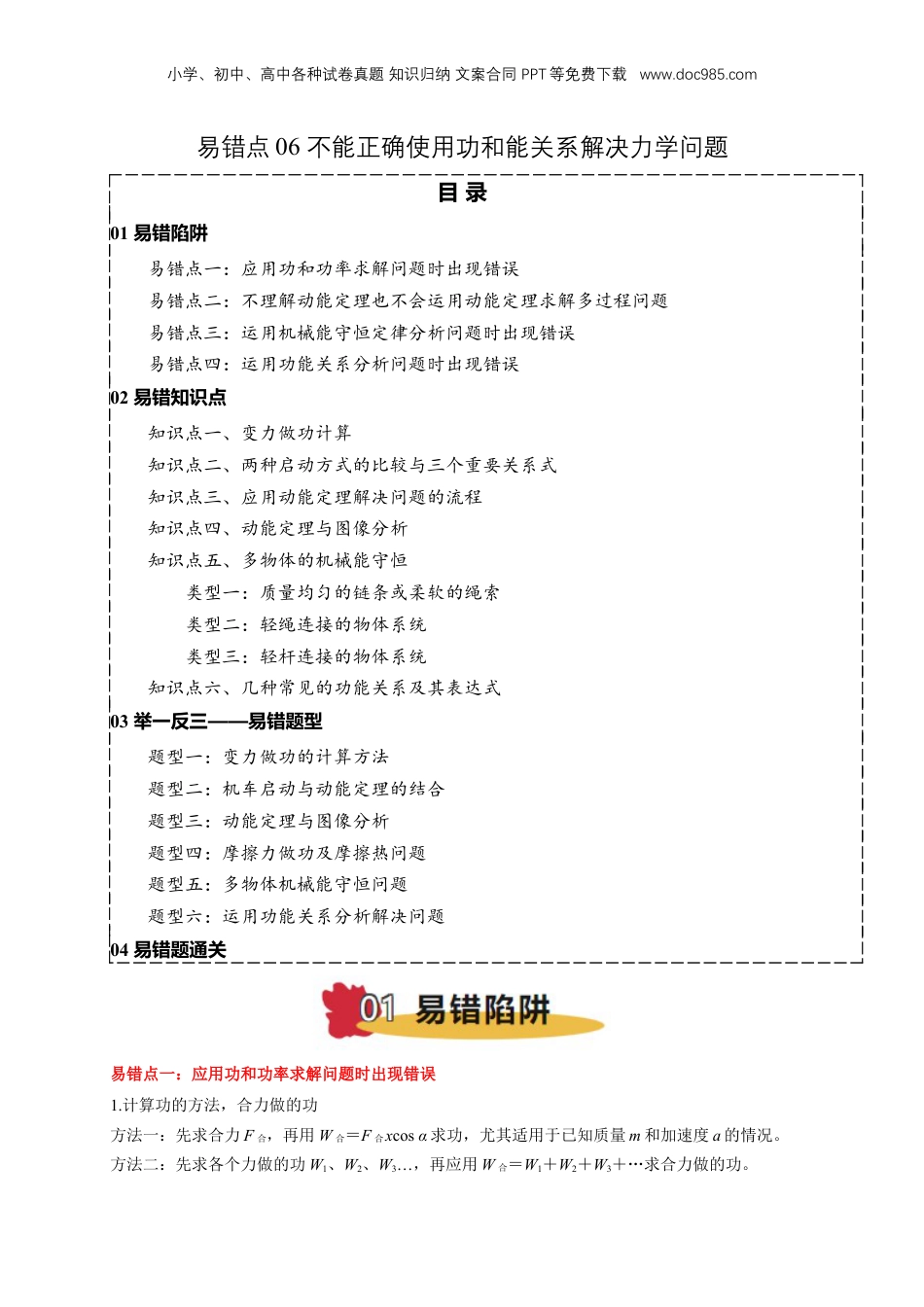 小学、初中、高中各种试卷真题知识归纳文案合同PPT等免费下载www.doc985.com易错点06不能正确使用功和能关系解决力学问题目录01易错陷阱易错点一:应用功和功率求解问题时出现错误易错点二:不理解动能定理也不会运用动能定理求解多过程问题易错点三:运用机械能守恒定律分析问题时出现错误易错点四:运用功能关系分析问题时出现错误02易错知识点知识点一、变力做功计算知识点二、两种启动方式的比较与三个重要关系式知识点三、应用动能定理解决问题的流程知识点四、动能定理与图像分析知识点五、多物体的机械能守恒类型一:质量均匀的链条或柔软的绳索类型二:轻绳连接的物体系统类型三:轻杆连接的物体系统知识点六、几种常见的功能关系及其表达式03举一反三——易错题型题型一:变力做功的计算方法题型二:机车启动与动能定理的结合题型三:动能定理与图像分析题型四:摩擦力做功及摩擦热问题题型五:多物体机械能守恒问题题型六:运用功能关系分析解决问题04易错题通关易错点一:应用功和功率求解问题时出现错误1.计算功的方法,合力做的功方法一:先求合力F合,再用W合=F合xcosα求功,尤其适用于已知质量m和加速度a的情况。方法二:先求各个力做的功W1、W2、W3…,再应用W合=W1+W2+W3+…求合力做的功。小学、初中、高中各种试卷真题知识归纳文案合同PPT等免费下载www.doc985.com方法三:利用动能定理,合力做的功等于物体动能的变化量。2.变力做的功①应用动能定理求解。②用W=Pt求解,其中变力的功率P不变。③当力的大小不变,而方向始终与运动方向相同或相反时,这类力的功的绝对值等于力和路程(不是位移)的乘积。如滑动摩擦力做功、空气阻力做功等。④转换研究对象法。有些变力做功问题可转换为恒力做功,用W=Fxcosα求解。此法常用于轻绳通过定滑轮拉物体做功问题。⑤图像法。在F-x图像中,图线与x轴所围“面积”的代数和就表示力F在这段位移内所做的功,且位于x轴上方的“面积”为正功,位于x轴下方的“面积”为负功。3.瞬时功率的计算方法(1)利用公式P=Fvcosα,其中v为t时刻的瞬时速度。(2)P=FvF,其中vF为物体的速度v在力F方向上的分速度(3)P=Fvv,其中Fv为物体受到的外力F在速度v方向上的分力易错点二:不理解动能定理也不会运用动能定理求解多过程问题(1)动能定理中的位移和速度必须是相对于同一个参考系的,一般以地面或相对地面静止的物体为参考系.(2)当物体的运动包含多个不同过程时,可分段应用动能定理求解;也可以全过程应用动能定理求解.(3)动能是标量,动能定理是标量式,解题时不能分解动能.(4)在一个有变力做功的过程中,当变力做功无法直接通过功的公式求解时,可用动能定理,W变+W恒=12mv22-12mv12,物体初、末速度己知,恒力做功W但可根据功的公式求出,这样就可以得到W变=12mv22-12mv12-W恒,就可以求变力做的功了.易错点三:运用机械能守恒定律分析问题时出现错误1.机械能守恒定律的成立条件不是合外力为零,而是除重力和系统内弹力外,其他力做功为零。2.机械能守恒定律是对系统而言的,单个物体没有所谓的机械能守恒,正常所说的某物体的机械能守恒只是一种习惯说法,实为该物体与地球间机械能守恒。3.用机械能守恒定律列方程时始、末态的重力势能要选同一个零势能面。4虽然我们常用始、末态机械能相等列方程解题,但始、末态机械能相等与变化过程中机械能守恒含义不尽相同。整个过程中机械能一直保持不变才叫机械能守恒,始、末态只是其中的两个时刻。5.机械能守恒定律是能量转换与守恒定律的一个特例,当有除重力和系统内弹力以外的力对系统做功时,机械能不再守恒,但系统的总能量仍守恒。6.若从守恒的角度到关系式,要选取恰当的参考面,确定初末状态的机械能。7若从转化的角度到关系式,要考虑动能和势能的变化量,与参考面无关。8.用做功判断机械能守恒,只有重力做功或系统内弹力做功。小学、初中、高中各种试卷真题知识归纳文案合同PPT等免费下载www.doc985.com9.研究多个物体机械能守恒时,除能量关系外,请找速度关系,根据物体沿绳(杆)方向的分速度相等,建立两个连接体的速度关系式。易错点四:运用功能关系分析问题时出...