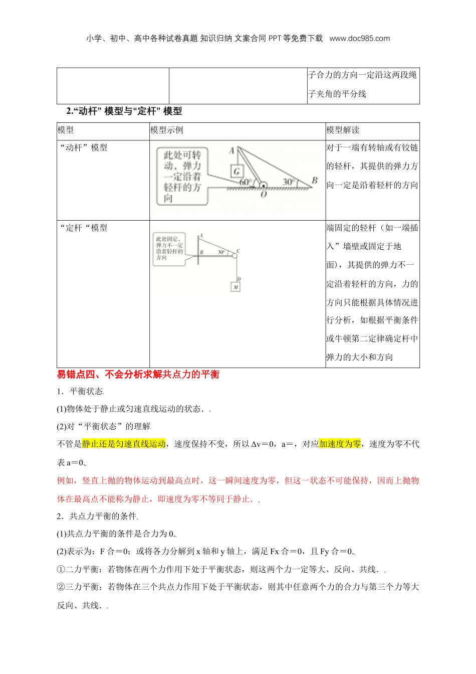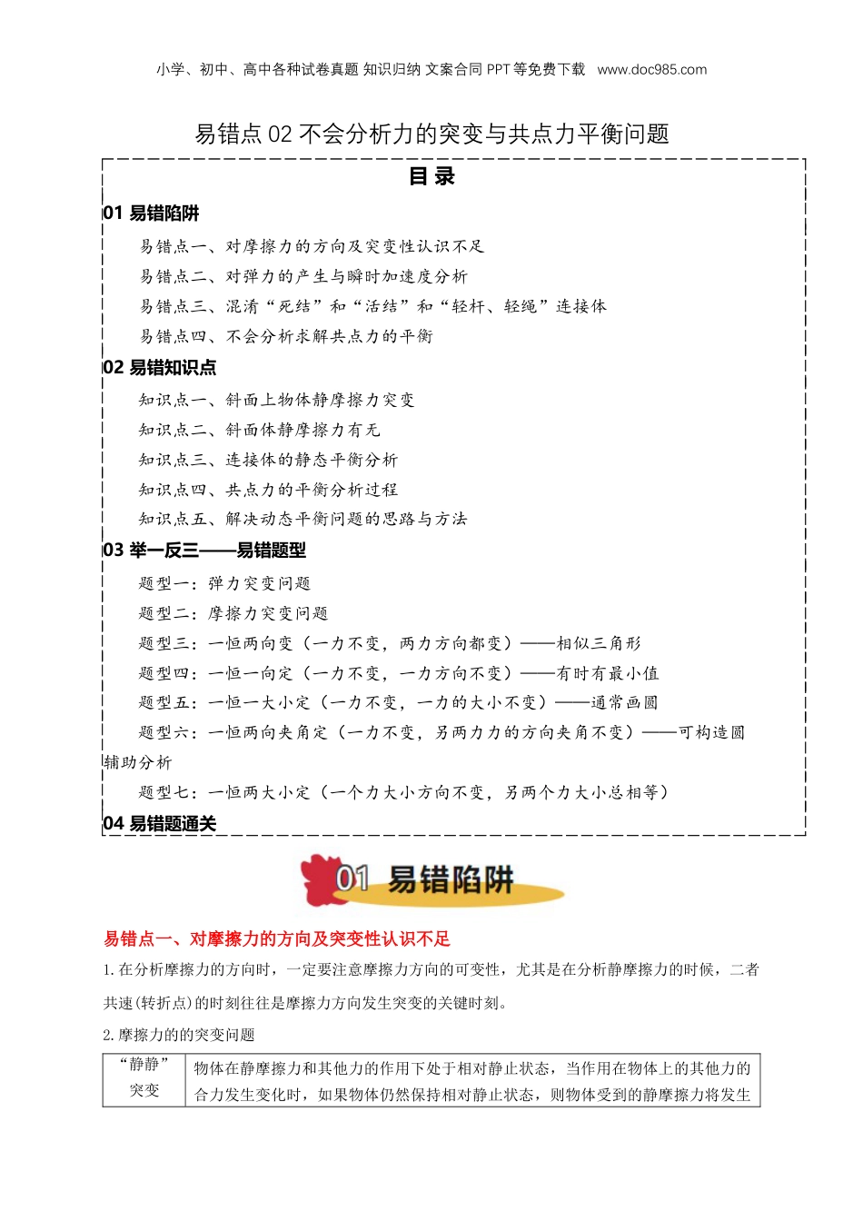 小学、初中、高中各种试卷真题知识归纳文案合同PPT等免费下载www.doc985.com易错点02不会分析力的突变与共点力平衡问题目录01易错陷阱易错点一、对摩擦力的方向及突变性认识不足易错点二、对弹力的产生与瞬时加速度分析易错点三、混淆“死结”和“活结”和“轻杆、轻绳”连接体易错点四、不会分析求解共点力的平衡02易错知识点知识点一、斜面上物体静摩擦力突变知识点二、斜面体静摩擦力有无知识点三、连接体的静态平衡分析知识点四、共点力的平衡分析过程知识点五、解决动态平衡问题的思路与方法03举一反三——易错题型题型一:弹力突变问题题型二:摩擦力突变问题题型三:一恒两向变(一力不变,两力方向都变)——相似三角形题型四:一恒一向定(一力不变,一力方向不变)——有时有最小值题型五:一恒一大小定(一力不变,一力的大小不变)——通常画圆题型六:一恒两向夹角定(一力不变,另两力力的方向夹角不变)——可构造圆辅助分析题型七:一恒两大小定(一个力大小方向不变,另两个力大小总相等)04易错题通关易错点一、对摩擦力的方向及突变性认识不足1.在分析摩擦力的方向时,一定要注意摩擦力方向的可变性,尤其是在分析静摩擦力的时候,二者共速(转折点)的时刻往往是摩擦力方向发生突变的关键时刻。2.摩擦力的的突变问题“静静”突变物体在静摩擦力和其他力的作用下处于相对静止状态,当作用在物体上的其他力的合力发生变化时,如果物体仍然保持相对静止状态,则物体受到的静摩擦力将发生小学、初中、高中各种试卷真题知识归纳文案合同PPT等免费下载www.doc985.com突变“动静”突变在滑动摩擦力和其他力作用下,物体突然停止相对滑动时,物体将不受滑动摩擦力作用,或滑动摩擦力“突变”成静摩擦力“静动”突变物体在静摩擦力和其他力作用下处于相对静止状态,当其他力变化时,如果物体不再保持相对静止状态,则物体受到的静摩擦力将“突变”成滑动摩擦力“动动”突变物体受到滑动摩擦力和其他力的共同作用,当两物体间的压力发生变化时,滑动摩擦力的大小随之而变;或者两物体达到共同速度时相对滑动方向发生变化,滑动摩擦力的方向也会随之而变易错点二、对弹力的产生与瞬时加速度分析1.绳产生的拉力、物体产生的支持力、杆产生的支持力或拉力本质都是因形变而产生弹力。2.加速度可发生突变,速度的变化需要一个过程的积累,不会发生突变。3.处理加速度突变的理论依据是牛顿第二定律。根据牛顿第二定律,F=ma,加速度a与物体受到的合力F对应同一时刻,即a为某时刻的加速度时,F为该时刻物体所受的合力;加速度与合力具有瞬时对应关系,二者总是同时产生、同时变化、同时消失。易错点三、混淆“死结”和“活结”和“轻杆、轻绳”连接体1.“死结”模型与“活结”模型模型模型示例模型解读“死结”模型“死结”可理解为把绳子分成两段,且不可以沿绳子移动的结点。“死结”两侧的绳因结而变成了两根独立的绳,因此由“死结”分开的两段绳子上的弹力不一定相等“活结“模型“活结可理解为把绳子分成两段,且可以沿绳子移动的结点。活结一般是由绳跨过滑轮或者绳上挂一光滑挂钩而形成的。绳子虽然因“活结而弯曲,但实际上是同一根绳,所以由活结”分开的两段绳子上弹力的大小一定相等,两段绳小学、初中、高中各种试卷真题知识归纳文案合同PPT等免费下载www.doc985.com子合力的方向一定沿这两段绳子夹角的平分线2.“动杆”模型与“定杆”模型模型模型示例模型解读“动杆”模型对于一端有转轴或有铰链的轻杆,其提供的弹力方向一定是沿着轻杆的方向“定杆“模型端固定的轻杆(如一端插入”墙壁或固定于地面),其提供的弹力不一定沿着轻杆的方向,力的方向只能根据具体情况进行分析,如根据平衡条件或牛顿第二定律确定杆中弹力的大小和方向易错点四、不会分析求解共点力的平衡1.平衡状态(1)物体处于静止或匀速直线运动的状态.(2)对“平衡状态”的理解不管是静止还是匀速直线运动,速度保持不变,所以Δv=0,a=,对应加速度为零,速度为零不代表a=0.例如,竖直上抛的物体运动到最高点时,这一瞬间速度为零,但这一状态不可能保持,因而上抛物体在最高点不能称为静止...