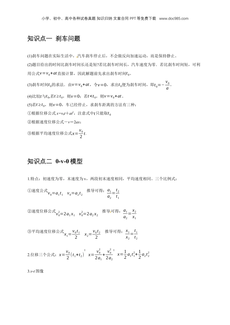 小学、初中、高中各种试卷真题知识归纳文案合同PPT等免费下载www.doc985.com易错点01不会分析直线运动中的匀变速与变速问题目录01易错陷阱易错点一、忽略运动公式中、速度和加速度的矢量性易错点二、两种匀减速直线运动的比较易错点三、对追及相遇问题挖掘隐含条件、临界条件不够易错点四、对运动学图像理解不准确02易错知识点知识点一刹车问题知识点二0-v-0模型知识点三反应时间与限速问题知识点四蹦极类问题03举一反三——易错题型题型一:刹车类问题题型二:运动学图像问题题型三:追及、相遇问题题型四:0-v-0运动模型题型五:反应时间与限速问题题型六:非匀变速直线运动问题04易错题通关易错点一、忽略运动公式中、速度和加速度的矢量性1.对于匀变带直线运动公式运用时一定要注意矢量的方向,如果题中没有给出,则需要考生考虑多方向的可能性,然后规定正方向(或建立x轴或y轴),将矢量转化为标量进行运算求解。运动存在往返情况:一定要先选定一个正方向,在使用匀变速直线运动的公式进行计算时要注意矢量(如速度、加速度、位移等)的正负。比较矢量情况:矢量相同必须是大小、方向都相同;若只比较大小,不需要考虑方向。易错点二、两种匀减速直线运动的比较1.刹车类问题(1)其特点为匀减速到速度为零后停止运动,加速度α突然消失.(2)求解时要注意确定实际运动时间.小学、初中、高中各种试卷真题知识归纳文案合同PPT等免费下载www.doc985.com(3)如果问题涉及最后阶段(到停止)的运动,可把该阶段看成反向的初速度为零的匀加速直线运动.2.双向可逆类问题0-v-0模型(1)示例:如沿光滑固定斜面上滑的小球,到最高点后仍能以原加速度匀加速下滑,全过程加速度大小、方向均不变,(2)注意:求解时可分过程列式也可对全过程列式,但必须注意x、v、α等矢量的正负号及物理意义.易错点三、对追及相遇问题挖掘隐含条件、临界条件不够可概括为“一个临界条件”“两个关系”。(1)一个临界条件:速度相等。它往往是物体间能否追上或(两者)距离最大、最小的临界条件,也是分析判断问题的切入点。(2)两个关系:时间关系和位移关系,通过画草图找出两物体运动的时间关系和位移关系是解题的突破口。易错点四、对运动学图像理解不准确1.不理解直线运动x-t图像①匀速直线运动的x-t图象是一条倾斜的直线,如图中图线甲;②匀变速直线运动的x-t图象是一条抛物线,如图线乙。③若x-t图象是一条平行于时间轴的直线,则表示物体处于静止状态,如图线丙。2不理解直线运动v-t图像①匀速直线运动的v-t图象是与横轴平行的直线,如图中图线甲。②匀变速直线运动的v-t图象是一条倾斜的直线,如图线乙。若v-t图象是曲线,不同点切线的斜率不同,表示物体做变加速运动。图线丙表示物体的加速度逐渐变大,图线丁表示物体的加速度逐渐减小。小学、初中、高中各种试卷真题知识归纳文案合同PPT等免费下载www.doc985.com知识点一刹车问题(1)刹车问题在实际生活中,汽车刹车停止后,不会做反向加速运动,而是保持静止。(2)题目给出的时间比刹车时间长还是短?若比刹车时间长,汽车速度为零.若比刹车时间短,可利用公式v=v0+at直接计算,因此解题前先求出刹车时间t0。(3)刹车时间t0的求法.由v=v0+at,令v=0,求出t0便为刹车时间,即t0=−v0a。(4)比较t与t0,若t≥t0,则v=0;若t<t0,则v=v0+at。(5)若t≥t0,则v=0,车已经停止,求刹车距离的方法有三种:①根据位移公式x=v0t+at2,注意式中t只能取t0②根据速度位移公式-v=2ax;[来源:学*科*网Z*X*X*K]③根据平均速度位移公式x=v02t.知识点二0-v-0模型1.特点:初速度为零,末速度为v,两段初末速度相同,平均速度相同。三个比例式:①速度公式v0=a1t1v0=a2t2推导可得:a1a2=t2t1②速度位移公式v02=2a1x1v02=2a2x2推导可得:a1a2=x2x1③平均速度位移公式x1=v0t12x2=v0t22推导可得:x1x2=t1t22.位移三个公式:x=v02(t1+t2);x=v022a1+v022a2;x=12a1t12+12a2t223.v-t图像小学、初中、高中各种试卷真题知识归纳文案合同PPT等免费下载www.doc985.com知识点三反应时间与限速问题1.先匀速,后减速运动模型---反应时间问题总位移x=v0t1+v022a2.先加速后匀速运动模型----...