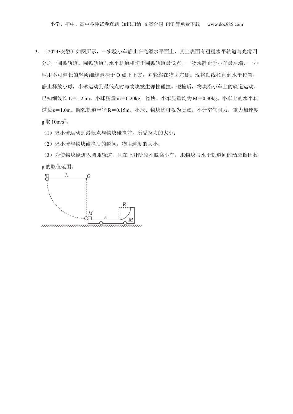 小学、初中、高中各种试卷真题知识归纳文案合同PPT等免费下载www.doc985.com疑难压轴2能量与动量的综合分析与应用1.(2024•福建)如图,木板A放置在光滑水平桌面上,通过两根相同的水平轻弹簧M、N与桌面上的两个固定挡板相连。小物块B放在A的最左端,通过一条跨过轻质定滑轮的轻绳与带正电的小球C相连,轻绳绝缘且不可伸长,B与滑轮间的绳子与桌面平行。桌面右侧存在一竖直向上的匀强电场,A、B、C均静止,M、N处于原长状态,轻绳处于自然伸直状态。t=0时撤去电场,C向下加速运动,下降0.2m后开始匀速运动,C开始做匀速运动瞬间弹簧N的弹性势能为0.1J。已知A、B、C的质量分别为0.3kg、0.4kg、0.2kg,小球C的带电量为1×106﹣C,重力加速度大小取10m/s2,最大静摩擦力等于滑动摩擦力,弹簧始终处在弹性限度内,轻绳与滑轮间的摩擦力不计。(1)求匀强电场的场强大小;(2)求A与B间的动摩擦因数及C做匀速运动时的速度大小;(3)若t=0时电场方向改为竖直向下,当B与A即将发生相对滑动瞬间撤去电场,A、B继续向右运动,一段时间后,A从右向左运动。求A第一次从右向左运动过程中最大速度的大小。(整个过程B未与A脱离,C未与地面相碰)小学、初中、高中各种试卷真题知识归纳文案合同PPT等免费下载www.doc985.com2.(2024•甘肃)如图,质量为2kg的小球A(视为质点)在细绳O′P和OP作用下处于平衡状态,细绳O'P=OP=1.6m,与竖直方向的夹角均为60°。质量为6kg的木板B静止在光滑水平面上,质量为2kg的物块C静止在B的左端。剪断细绳O′P,小球A开始运动。(重力加速度g取10m/s2)(1)求A运动到最低点时细绳OP所受的拉力。(2)A在最低点时,细绳OP断裂。A飞出后恰好与C左侧碰撞(时间极短),碰后A竖直下落,C水平向右运动。求碰后C的速度大小。(3)A、C碰后,C相对B滑行4m后与B共速。求C和B之间的动摩擦因数。小学、初中、高中各种试卷真题知识归纳文案合同PPT等免费下载www.doc985.com3.(2024•安徽)如图所示,一实验小车静止在光滑水平面上,其上表面有粗糙水平轨道与光滑四分之一圆弧轨道。圆弧轨道与水平轨道相切于圆弧轨道最低点。一物块静止于小车最左端,一小球用不可伸长的轻质细线悬挂于O点正下方,并轻靠在物块左侧。现将细线拉直到水平位置,静止释放小球,小球运动到最低点时与物块发生弹性碰撞。碰撞后,物块沿小车上的轨道运动。已知细线长L=1.25m。小球质量m=0.20kg。物块、小车质量均为M=0.30kg。小车上的水平轨道长s=1.0m。圆弧轨道半径R=0.15m。小球、物块均可视为质点。不计空气阻力,重力加速度g取10m/s2。(1)求小球运动到最低点与物块碰撞前,所受拉力的大小;(2)求小球与物块碰撞后的瞬间,物块速度的大小;(3)为使物块能进入圆弧轨道,且在上升阶段不脱离小车,求物块与水平轨道间的动摩擦因数μ的取值范围。小学、初中、高中各种试卷真题知识归纳文案合同PPT等免费下载www.doc985.com4.(2024•浙江)某固定装置的竖直截面如图所示,由倾角θ=37°的直轨道AB,半径R=1m的圆弧轨道BCD,长度L=1.25m、倾角为θ的直轨道DE,半径为R、圆心角为θ的圆弧管道EF组成,轨道间平滑连接。在轨道末端F的右侧,光滑水平面上紧靠着质量m=0.5kg滑块b,其上表面与轨道末端F所在的水平面平齐。质量m=0.5kg的小物块a从轨道AB上高度为h静止释放经圆弧轨道BCD滑上轨道DE,轨道DE由特殊材料制成,小物块a向上运动时动摩擦因数μ1=0.25,向下运动时动摩擦因数μ2=0.5,且最大静摩擦力等于滑动摩擦力。当小物块a在滑块b上滑动时动摩擦因数恒为μ1,小物块a运动到滑块右侧的竖直挡板能发生完全弹性碰撞。(其它轨道均光滑,小物块视为质点,不计空气阻力,sin37°=0.6,cos37°=0.8,g取10m/s2)(1)若h=0.8m,求小物块:①第一次经过C点的向心加速度大小;②在DE上经过的总路程;③在DE上向上运动时间t上和向下运动时间t下之比;(2)若h=1.6m,滑块至少多长才能使小物块不脱离滑块。小学、初中、高中各种试卷真题知识归纳文案合同PPT等免费下载www.doc985.com5.(2024•浙江一模)如图所示,一弹射游戏装置由安装在水平台面上的固定弹射器、水...