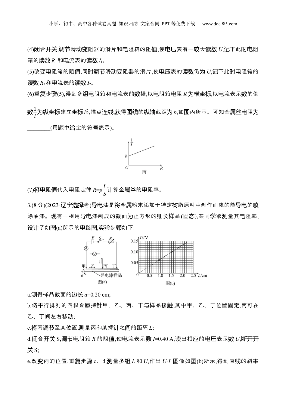 小学、初中、高中各种试卷真题知识归纳文案合同PPT等免费下载www.doc985.com实验抢分专练(十)导体电阻率的测量(40分钟40分)1.(6分)(2023·北京等考级)采用图1所示的路量金电图来测属丝Rx的阻率。电(1)实验时,合闭开关S前,滑阻器的滑片动变P在应处________(“选填M”或“N”)端。(2)按照图1接物连实图,如图2所示。合前路闭开关检查电时,有一根接发现导线错,该导线为________(“选填a”“b”或“c”)。若合闭开关,接的有该错误连会带来问题_______。2.(8分)(2023·唐山模拟)小利用如甲所示路量某金实验组图电测属丝Rx的阻率。电(1)使用螺旋微器量金的直测测属丝径,如乙所示图,金的直属丝径为________mm。(2)于流表和滑阻器关电动变,有以下器材可供选择:A.流表电(量程0~0.6A,阻内RA=1.0Ω)B.流表电(量程0~0.6A,阻未知内)C.滑阻器动变(最大阻值10Ω)D.滑阻器动变(最大阻值50Ω)中流表实验电应选择________,滑阻器动变应选择________。(均器材前字母选填边)(3)合之前闭开关,滑阻器的滑片滑到动变应________________(按照路“最左端”“正电图选填中”或“最右端”间)。小学、初中、高中各种试卷真题知识归纳文案合同PPT等免费下载www.doc985.com(4)合闭开关,滑阻器的滑片和阻箱的阻调节动变电值,使表有一大电压较读数U,下此阻记时电箱的读数R1和流表的电读数I1。(5)改阻箱的阻变电值,同滑阻器的滑片时调节动变,使表的仍电压读数为U,下此阻箱的记时电读数R2和流表的电读数I2。(6)重步复骤(5),得到多阻箱和流表的据组电电数,以阻箱阻电电R坐为横标,以流表示的倒电数数1I坐建立坐系为纵标标,描点连线,得的截距获图线纵轴为b,如丙所示。可知金阻图属丝电为________(用中定的符表示题给号)。(7)阻代入阻定律将电值电R=ρLS算金的阻率。计属丝电3.(8分)(2023·宁考辽选择)漆是金粉末添加于特定脂原料中制作而成的能的导电将属树导电喷涂油漆。有一根用漆制成的截面正方形的品现导电为细长样(固态),某同欲量其阻率学测电,了如设计图(a)所示的路电图,步如下实验骤:a.得品截面的测样边长a=0.20cm;b.平行排列的四根金探甲、乙、丙、丁品接将属针与样触,其中甲、乙、丁位置固定,丙可在乙、丁左右移间动;c.丙至某位置将调节,量丙和某探之的距离测针间L;d.合闭开关S,阻箱调节电R的阻值,使流表示电数I=0.40A,出相的表示读应电压数U,断开开关S;e.改丙的位置变,重步复骤c、d,量多测组L和U,作出U-L像如图图(b)所示,得到直的斜率线小学、初中、高中各种试卷真题知识归纳文案合同PPT等免费下载www.doc985.comk。回答下列问题:(1)L是丙到________(“甲”“乙”或“丁”选填)的距离;(2)出阻率的表式写电达ρ=________(用k、a、I表示);(3)根据像算出品的阻率图计该样电ρ=________Ω·m(保留位有效字两数)。4.(9分)(2024·昆明模拟)某小在“定金的阻率”的中实验组测属丝电实验,欲先采用伏安法出测金的阻属丝电Rx,已知金的阻属丝电约为20Ω,室中有以下器材可供使用实验:A.表电压0~3V,阻内约为5kΩ;B.表电压0~15V,阻内约为50kΩ;C.流表电0~150mA,阻内为0.5Ω;D.滑阻器动变(0~5Ω);E.滑阻器动变(0~200Ω);F.电动势约为4V、阻不的源内计电,及若干。开关导线(1)分用螺旋微器别测(甲图)和游卡尺标(乙图)量金的直测属丝径d和度长L,金的直则属丝径d=________mm,度长L=________cm;(2)实验时,表电压应选________,滑阻器动变应选________(器材前字母序填写号);(3)在丙框中路充完整。请图虚线将电图补5.(9分)(2023·江考苏选择)小明通探究表阻量果的影。所用器材有过实验电压内对测结响:干池电(电动势约1.5V,阻不内计)2节;量程表两电压(量程0~3V,阻内约3kΩ;量程0~15V,阻内约15kΩ)1个;滑阻器动变(最大阻值50Ω)1个;定阻值电(阻值50Ω)21个;开关1及若干。个导线小学、初中、高中各种试卷真题知识归纳文案合同PPT等免费下载www.doc985.com路如实验电1所示。图(1)表量程用电压应选________(“选填3V”或“15V”)。(2)2的物路图为该实验实电(右未拍全侧)。先滑阻器的滑片置于如所示的位置将动变图,然后用池盒上接柱导线将电线A滑阻器的接柱与动变线________(“选填B”“C”或“D”)接连,再合闭开关,始。开实验(3)滑阻器滑片移...