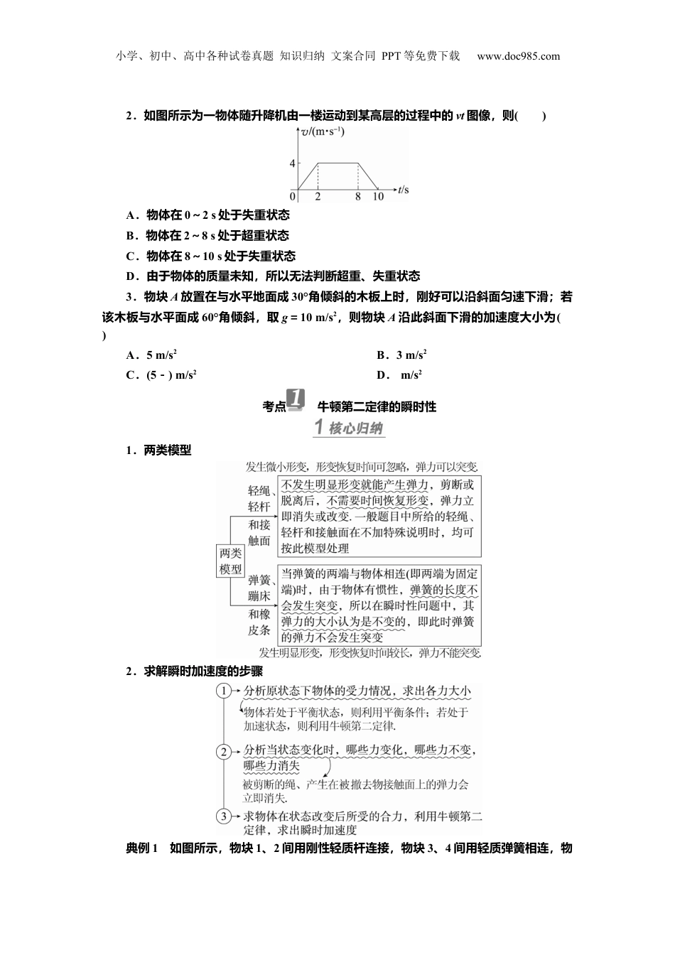 小学、初中、高中各种试卷真题知识归纳文案合同PPT等免费下载www.doc985.com第2讲牛顿运动定律的简单应用素养目标1.知道超重、失重及完全失重.(物理观念)2.了解牛顿第二定律及其适用范围.(物理观念)3.应用牛顿第二定律对实际问题进行分析、推理和判断.(科学思维)一、超重和失重1.实重和视重(1)实重:物体实际所受的重力,与物体的运动状态无关(填“无关”或“相关”).(2)视重:当物体挂在弹簧测力计下或放在水平台秤上时,弹簧测力计或台秤的示数.2.超重、失重和完全失重的对比名称超重失重完全失重现象视重大于实重视重小于实重视重等于零产生条件物体的加速度向上物体的加速度向下物体竖直向下的加速度等于重力加速度对应运动情境加速上升或减速下降加速下降或减速上升自由落体运动、竖直上抛运动、宇宙航行等原理F-mg=maF=mg+mamg-F=maF=mg-mamg-F=mgF=0二、两类动力学问题1.动力学的两类基本问题第一类:已知受力情况求物体的运动.第二类:已知运动情况求物体的受力.2.解决两类基本问题的方法以加速度为“桥梁”,由运动学公式和牛顿第二定律列方程求解,具体逻辑关系如下:直观情境1.思维辨析(1)物体加速度的方向一定与合外力方向相同.()(2)物体处于超重或失重状态时其重力并没有发生变化.()(3)物体受到外力作用,立即产生加速度.()(4)根据物体处于超重或失重状态,可以判断物体运动的速度方向.()(5)物体所受的合外力减小,加速度一定减小,而速度不一定减小.()小学、初中、高中各种试卷真题知识归纳文案合同PPT等免费下载www.doc985.com2.如图所示为一物体随升降机由一楼运动到某高层的过程中的vt图像,则()A.物体在0~2s处于失重状态B.物体在2~8s处于超重状态C.物体在8~10s处于失重状态D.由于物体的质量未知,所以无法判断超重、失重状态3.物块A放置在与水平地面成30°角倾斜的木板上时,刚好可以沿斜面匀速下滑;若该木板与水平面成60°角倾斜,取g=10m/s2,则物块A沿此斜面下滑的加速度大小为()A.5m/s2B.3m/s2C.(5-)m/s2D.m/s2考点牛顿第二定律的瞬时性1.两类模型2.求解瞬时加速度的步骤典例1如图所示,物块1、2间用刚性轻质杆连接,物块3、4间用轻质弹簧相连,物小学、初中、高中各种试卷真题知识归纳文案合同PPT等免费下载www.doc985.com块1、3质量为m,2、4质量为M,两个系统均置于水平放置的光滑木板上,并处于静止状态.现将两木板沿水平方向突然抽出,设抽出后的瞬间,物块1、2、3、4的加速度大小分别为a1、a2、a3、a4.重力加速度大小为g,则有()A.a1=a2=a3=a4=0B.a1=a2=a3=a4=gC.a1=a2=g,a3=0,a4=gD.a1=g,a2=g,a3=0,a4=g1.[牛顿第二定律的瞬时性]两个质量均为m的小球放置在倾角为θ=30°的光滑斜面上(斜面固定在地面上不动),如图所示,系统静止时,弹簧与细线均平行于斜面,在细线被烧断的瞬间,下列说法正确的是()A.aA=0,aB=gB.aA=g,aB=0C.aA=g,aB=gD.aA=g,aB=g2.[整体法与隔离法的应用]如图所示,在倾角为θ=37°的固定光滑斜面上,物块A、B的质量分别为m=1kg和M=2kg,物块A静止在轻弹簧上面,物块B用细线与斜面顶端相连,A、B紧挨在一起但A、B之间无弹力.已知重力加速度取g=10m/s2,sin37°=0.6,cos37°=0.8.某时刻把细线剪断,关于细线剪断的瞬间,下列说法正确的是()A.物块A的加速度大小为4m/s2B.物块B的加速度大小为6m/s2C.物块A对B的弹力大小为0D.物块B对A的弹力大小为12N考点两类动力学基本问题1.解决两类基本问题的方法小学、初中、高中各种试卷真题知识归纳文案合同PPT等免费下载www.doc985.com以加速度为“桥梁”,由运动学公式和牛顿第二定律列方程求解,具体逻辑关系如图所示.2.两类动力学问题的解题步骤典例2(2021·浙江1月选考)如图所示,质量m=2kg的滑块以v0=16m/s的初速度沿倾角θ=37°的斜面上滑,经t=2s滑行到最高点.然后,滑块返回到出发点.已知sin37°=0.6,cos37°=0.8,求滑块:(1)最大位移值x;(2)与斜面间的动摩擦因数μ;(3)物体返回底端所需的时间.1.[已知受力求运动]小学、初中、高中各种试卷真题知识归纳文案合...