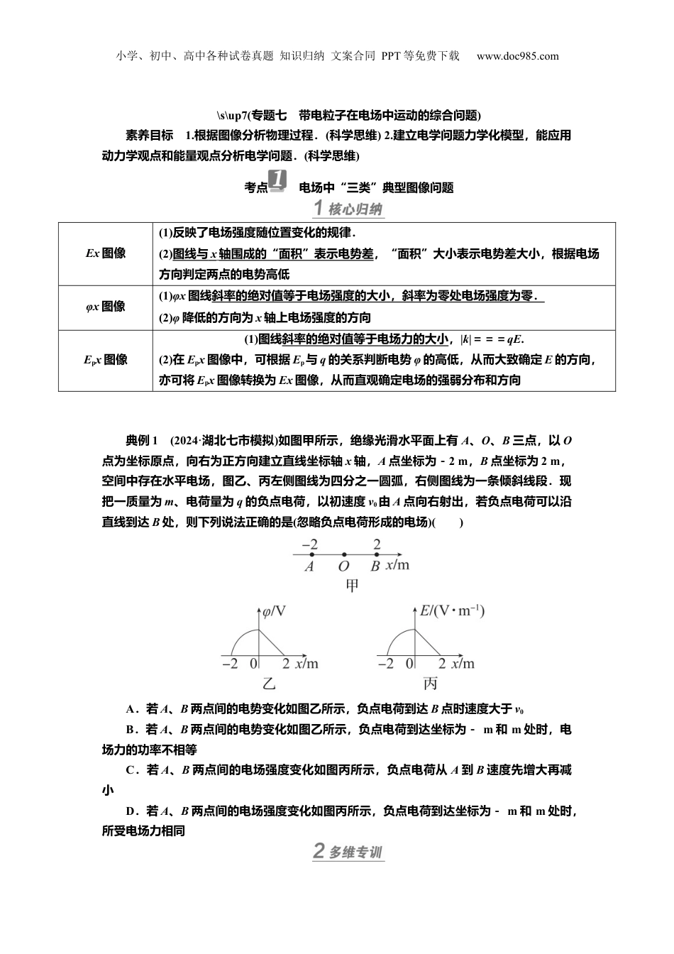 小学、初中、高中各种试卷真题知识归纳文案合同PPT等免费下载www.doc985.com\s\up7(专题七带电粒子在电场中运动的综合问题)素养目标1.根据图像分析物理过程.(科学思维)2.建立电学问题力学化模型,能应用动力学观点和能量观点分析电学问题.(科学思维)考点电场中“三类”典型图像问题Ex图像(1)反映了电场强度随位置变化的规律.(2)图线与x轴围成的“面积”表示电势差,“面积”大小表示电势差大小,根据电场方向判定两点的电势高低φx图像(1)φx图线斜率的绝对值等于电场强度的大小,斜率为零处电场强度为零.(2)φ降低的方向为x轴上电场强度的方向Epx图像(1)图线斜率的绝对值等于电场力的大小,|k|===qE.(2)在Epx图像中,可根据Ep与q的关系判断电势φ的高低,从而大致确定E的方向,亦可将Epx图像转换为Ex图像,从而直观确定电场的强弱分布和方向典例1(2024·湖北七市模拟)如图甲所示,绝缘光滑水平面上有A、O、B三点,以O点为坐标原点,向右为正方向建立直线坐标轴x轴,A点坐标为-2m,B点坐标为2m,空间中存在水平电场,图乙、丙左侧图线为四分之一圆弧,右侧图线为一条倾斜线段.现把一质量为m、电荷量为q的负点电荷,以初速度v0由A点向右射出,若负点电荷可以沿直线到达B处,则下列说法正确的是(忽略负点电荷形成的电场)()A.若A、B两点间的电势变化如图乙所示,负点电荷到达B点时速度大于v0B.若A、B两点间的电势变化如图乙所示,负点电荷到达坐标为-m和m处时,电场力的功率不相等C.若A、B两点间的电场强度变化如图丙所示,负点电荷从A到B速度先增大再减小D.若A、B两点间的电场强度变化如图丙所示,负点电荷到达坐标为-m和m处时,所受电场力相同小学、初中、高中各种试卷真题知识归纳文案合同PPT等免费下载www.doc985.com1.[φx图像的分析]如图甲所示,空间存在着平行于纸面的匀强电场,但方向未知,现用仪器在纸面内沿互成90°角的x、y两个方向探测各点的电势情况,设O点的电势为零,得到各点电势φ与到O点距离的函数关系图像,分别如图乙、图丙所示.下列关于该电场的电场强度E的说法,正确的是()A.E=100V/m,与x轴负方向成45°角斜向左上B.E=100V/m,与x轴负方向成45°角斜向左下C.E=100V/m,与y轴正方向成30°角斜向右上D.E=200V/m,与y轴负方向成30°角斜向左下2.[Epx图像的分析]在x轴上O、P两点分别放置电荷量为q1、q2的点电荷,一带负电的试探电荷在两电荷连线上的电势能Ep随x变化的关系如图所示,其中A、B两点电势能为零,BD段中C点电势能最大,则()A.q1是负电荷,q2是正电荷,且q1>q2B.B、C间场强方向沿x轴负方向C.C点的电场强度大于A点的电场强度D.将一正点电荷从B点移到D点,电场力先做负功后做正功考点电场中的力、电综合问题1.用动力学的观点分析带电粒子的运动(1)由于匀强电场中带电粒子所受静电力和重力都是恒力,这两个力的合力为一恒力.(2)类似于处理偏转问题,将复杂的运动分解为正交的简单直线运动,化繁为简.(3)综合运用牛顿运动定律和匀变速直线运动公式,注意受力分析要全面,特别注意重力是否需要考虑,以及运动学公式里的物理量的正、负号及矢量性.2.用能量的观点来分析带电粒子的运动(1)运用能量守恒定律分析,注意题中有哪些形式的能量出现.小学、初中、高中各种试卷真题知识归纳文案合同PPT等免费下载www.doc985.com(2)运用动能定理分析,注意过程分析要全面,准确求出过程中的所有功,判断是分阶段还是全过程使用动能定理.典例2(2023·新课标卷)密立根油滴实验的示意图如图所示.两水平金属平板上下放置,间距固定,可从上板中央的小孔向两板间喷入大小不同、带电量不同、密度相同的小油滴.两板间不加电压时,油滴a、b在重力和空气阻力的作用下竖直向下匀速运动,速率分别为v0、;两板间加上电压后(上板为正极),这两个油滴很快达到相同的速率,均竖直向下匀速运动.油滴可视为球形,所受空气阻力大小与油滴半径、运动速率成正比,比例系数视为常数.不计空气浮力和油滴间的相互作用.(1)求油滴a和油滴b的质量之比;(2)判断油滴a和油滴b所带电荷的正负,并求a、b所带电荷量的绝对值之比.1.[应用能量观点分析带电...