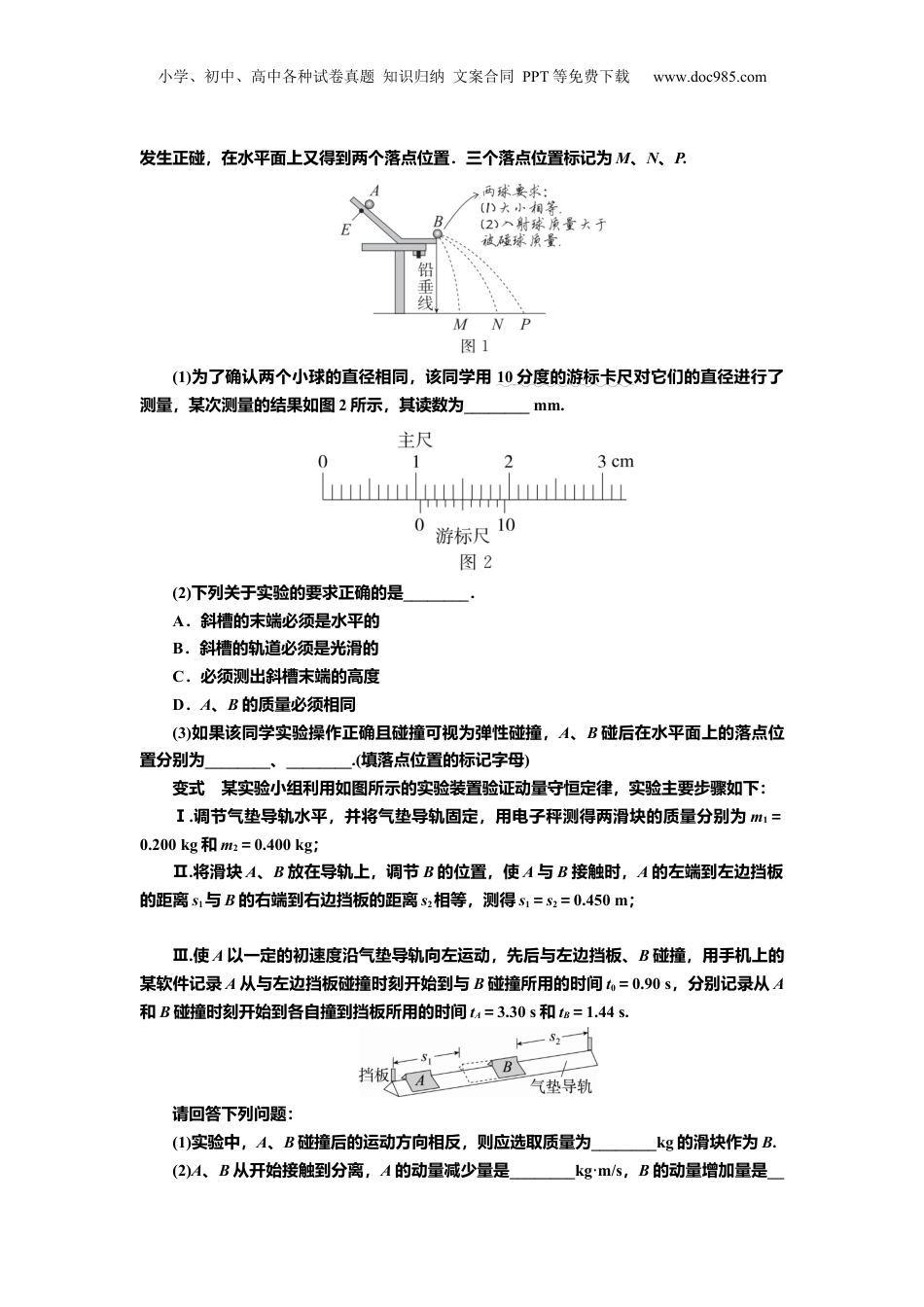 小学、初中、高中各种试卷真题知识归纳文案合同PPT等免费下载www.doc985.com实验八验证动量守恒定律方案一利用两辆小车完成一维碰撞实验[实验器材]光滑长木板、打点计时器、纸带、小车(两辆)、天平、撞针、橡皮泥、刻度尺等.[实验步骤]1.测质量:用天平测出两小车的质量.2.安装:将打点计时器固定在光滑长木板的一端,把纸带穿过打点计时器,连在小车的后面,在两小车的碰撞端分别装上撞针和橡皮泥.3.实验:小车B静止,接通电源,让小车A运动,碰撞时撞针插入橡皮泥中,两小车连接成一个整体运动.4.改变条件重复实验(1)改变小车A的初速度.(2)改变两小车的质量.[数据处理]1.小车速度的测量:通过纸带上两计数点间的距离及时间,由v=计算.2.验证的表达式:m1v1=(m1+m2)v2.方案二研究气垫导轨上滑块碰撞时的动量守恒[实验器材]气垫导轨、光电计时器、天平、滑块(两个)、重物、弹簧片、细绳、弹性碰撞架、胶布、撞针、橡皮泥、游标卡尺等.[实验步骤]1.测质量:用天平测出滑块质量.2.安装:正确安装好气垫导轨.3.实验:接通电源,利用配套的光电计时装置测出两滑块各种情况下碰撞前后的速度(①改变滑块的质量;②改变滑块的初速度大小和方向).[数据处理]1.滑块速度的测量:v=,式中Δx为滑块挡光片的宽度(仪器说明书上给出,也可直接测量),Δt为光电计时器显示的滑块(挡光片)经过光电门的时间.2.验证的表达式m1v1+m2v2=m1v′1+m2v′2.小学、初中、高中各种试卷真题知识归纳文案合同PPT等免费下载www.doc985.com方案三利用斜槽滚球验证动量守恒定律[实验器材]斜槽、小球(两个)、天平、复写纸、白纸、圆规、刻度尺等.[实验步骤]1.测质量:用天平测出两小球的质量,并选定质量大的小球为入射小球.2.安装:按照如图所示安装实验装置.调整固定斜槽使斜槽底端水平.3.铺纸:白纸在下,复写纸在上且在适当位置铺放好.记下重垂线所指的位置O.4.单球找点:不放被撞小球,每次让入射小球从斜槽上某固定高度处自由滚下,重复10次.用圆规画尽量小的圆把所有的小球落点圈在里面.圆心P就是小球落点的平均位置.5.碰撞找点:把被撞小球放在斜槽末端,每次让入射小球从斜槽同一高度自由滚下,使它们发生碰撞,重复实验10次.用步骤4的方法,标出碰后入射小球落点的平均位置M和被撞小球落点的平均位置N,如图所示.改变入射小球的释放高度,重复实验.[数据处理]1.小球水平射程的测量:连接ON,测量线段OP、OM、ON的长度.2.验证的表达式:m1·OP=m1·OM+m2·ON.[注意事项]1.前提条件:碰撞的两物体应保证“水平”和“正碰”.2.方案提醒(1)若利用气垫导轨进行验证,给滑块的初速度应沿着导轨的方向.(2)若利用两小车相碰进行验证,要注意平衡摩擦力.(3)若利用平抛运动规律进行验证,安装实验装置时,应注意调整斜槽,使斜槽末端水平,且选质量较大的小球为入射小球.考点教材原型实验典例某同学验证两个小球在斜槽末端碰撞时的动量守恒,实验装置如图1所示.A、B为两个直径相同的小球.实验时,不放B,让A从固定的斜槽上E点自由滚下,在水平面上得到一个落点位置;将B放置在斜槽末端,让A再次从斜槽上E点自由滚下,与B小学、初中、高中各种试卷真题知识归纳文案合同PPT等免费下载www.doc985.com发生正碰,在水平面上又得到两个落点位置.三个落点位置标记为M、N、P.(1)为了确认两个小球的直径相同,该同学用10分度的游标卡尺对它们的直径进行了测量,某次测量的结果如图2所示,其读数为________mm.(2)下列关于实验的要求正确的是________.A.斜槽的末端必须是水平的B.斜槽的轨道必须是光滑的C.必须测出斜槽末端的高度D.A、B的质量必须相同(3)如果该同学实验操作正确且碰撞可视为弹性碰撞,A、B碰后在水平面上的落点位置分别为________、________.(填落点位置的标记字母)变式某实验小组利用如图所示的实验装置验证动量守恒定律,实验主要步骤如下:Ⅰ.调节气垫导轨水平,并将气垫导轨固定,用电子秤测得两滑块的质量分别为m1=0.200kg和m2=0.400kg;Ⅱ.将滑块A、B放在导轨上,调节B的位置,使A与B接触时,A的左端到左边挡板的距离s1与B的右端到右...