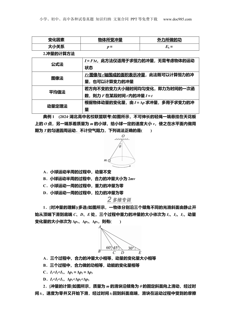 小学、初中、高中各种试卷真题知识归纳文案合同PPT等免费下载www.doc985.com第1讲动量、动量定理素养目标1.知道动量、动量变化量、冲量的概念.(物理观念)2.知道动量定理的内容及表达式.(物理观念)3.能够应用动量定理解释日常生活现象.(科学思维)一、动量1.定义:物体的质量与速度的乘积.2.表达式:p=mv.3.方向:动量的方向与速度的方向相同.4.动量的变化(也叫动量的变化量、动量的改变量、动量的增量等)(1)定义:动量的变化等于末动量与初动量之差.(2)表达式:Δp=p′-p,Δp也是矢量,Δp的方向与速度的变化量Δv的方向相同.直观情境同一直线上不在同一直线上二、冲量1.定义:力与力的作用时间的乘积叫作力的冲量.直观情境恒力的冲量变力的冲量2.公式:I=F·t.3.单位:牛顿·秒,符号是N·s.4.标矢性:冲量是矢量,方向是由力的方向决定的.5.物理意义:表示力的作用对时间的积累效果.三、动量定理1.内容:物体在一个过程始末的动量变化量等于它在这个过程中所受力的冲量.2.表达式:F(t′-t)=mv′-mv或I=p′-p.3.对动量定理的理解(1)动量定理反映了力的冲量与动量变化量之间的因果关系,即合力的冲量是原因,物体的动量变化量是结果.(2)动量定理中的冲量是合力的冲量,而不是某一个力的冲量,它可以是合力的冲量,可以是各力冲量的矢量和,也可以是外力在不同阶段冲量的矢量和.(3)动量定理表达式是矢量式,等号包含了大小相等、方向相同两方面的含义.小学、初中、高中各种试卷真题知识归纳文案合同PPT等免费下载www.doc985.com1.思维辨析(1)动量越大的物体,其速度越大.()(2)物体的动量越大,其惯性也越大.()(3)物体所受合力不变,则动量也不改变.()(4)物体沿水平面运动时,重力不做功,其冲量为零.()(5)物体所受合外力的冲量方向与物体动量变化的方向是一致的.()2.如图所示,两个质量相同的物体在同一高度沿倾角不同的两个光滑斜面由静止自由滑下,在到达斜面底端的过程中()A.重力的冲量相同B.弹力的冲量相同C.合力的冲量相同D.合力的冲量大小相同3.颠球是足球运动基本技术之一,若质量为400g的足球用脚颠起后,竖直向下以4m/s的速度落至水平地面上,再以3m/s的速度反向弹回,取竖直向上为正方向,在足球与地面接触的时间内,关于足球动量变化量Δp和合外力对足球做的功W,下列判断正确的是()A.Δp=1.4kg·m/s,W=-1.4JB.Δp=-1.4kg·m/s,W=1.4JC.Δp=2.8kg·m/s,W=-1.4JD.Δp=-2.8kg·m/s,W=1.4J考点动量和冲量1.动量与动能的比较比较项目动量动能物理意义描述机械运动状态的物理量定义式p=mvEk=mv2标矢性矢量标量小学、初中、高中各种试卷真题知识归纳文案合同PPT等免费下载www.doc985.com变化因素物体所受冲量外力所做的功大小关系p=Ek=2.冲量的计算方法公式法I=FΔt,此方法仅适用于求恒力的冲量,无需考虑物体的运动状态图像法Ft图像与t轴围成的面积表示冲量,此法既可以计算恒力的冲量,也可以计算变力的冲量平均值法若方向不变的变力大小随时间均匀变化,即力为时间的一次函数,则力F在某段时间t内的冲量I=t动量定理法根据物体动量的变化量,由I=Δp求冲量,多用于求变力的冲量典例1(2024·湖北高中名校联盟联考)如图所示,不可伸长的轻绳一端悬挂在天花板上的O点,另一端系着质量为m的小球,给小球一定的速度大小v,使之在水平面内做周期为T的匀速圆周运动.不计空气阻力,下列说法正确的是()A.小球运动半周的过程中,动量不变B.小球运动半周的过程中,合力的冲量大小为2mvC.小球运动一周的过程中,重力的冲量为零D.小球运动一周的过程中,拉力的冲量为零1.[对冲量的理解](多选)如图所示,一物体分别沿三个倾角不同的光滑斜面由静止开始从顶端下滑到底端C、D、E处,三个过程中重力的冲量的大小依次为I1、I2、I3,动量变化量的大小依次为Δp1、Δp2、Δp3,则有()A.三个过程中,合力的冲量大小相等,动量的变化量大小相等B.三个过程中,合力做的功相等,动能的变化量相等C.I1<I2<I3,Δp1=Δp2=Δp3D.I1<I2<I3,Δp1<Δp2<Δp32.[冲量的计算]如图所示,质量为m的滑块沿倾角为θ的固定...
