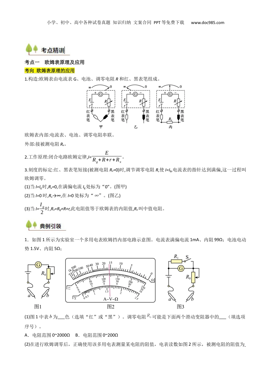 小学、初中、高中各种试卷真题知识归纳文案合同PPT等免费下载www.doc985.com考点41用多用电表测量电学中的物理量1.高考真题考点分布题型考点考查考题统计实验题多用电表测量二极管电阻2024年浙江卷实验题多用电表使用2024年河北卷2.命题规律及备考策略【命题规律】各地高考对用多用电表测量电学中的物理量这个实验的考查近几年频度不是太高,以考查多用电表读数居多,复习过程要特别注意欧姆表的使用。【备考策略】1.清楚多用电表构造及原理。2.理解和掌握用多用电表测量电学中的物理量方法。【命题预测】重点关键欧姆表的原理应用。1.多用电表可以用来测量电流、电压、电阻等,并且每一种测量都有几个量程。2.外形如图所示:上半部为表盘,表盘上有电流、电压、电阻等多种量程的刻度;下半部为选择开关,它的四周刻有各种测量项目和量程。3.多用电表面板上还有:欧姆表的欧姆调零旋钮(使电表指针指在右端零欧姆处)、指针定位螺丝(使电表指针指在左端的“0”位置)、表笔的正、负插孔(红表笔插入“+”插孔,黑表笔插入“-”插孔)。4.原理图:小学、初中、高中各种试卷真题知识归纳文案合同PPT等免费下载www.doc985.com考点一欧姆表原理及应用考向欧姆表原理的应用1.构造:欧姆表由电流表G、电池、调零电阻R和红、黑表笔组成。欧姆表内部:电流表、电池、调零电阻串联。外部:接被测电阻Rx。2.工作原理:闭合电路欧姆定律,I=ERg+R+r+Rx。3.刻度的标定:红、黑表笔短接(被测电阻Rx=0)时,调节调零电阻R,使I=Ig,电流表的指针达到满偏,这一过程叫欧姆调零。(1)当I=Ig时,Rx=0,在满偏电流Ig处标为“0”。(图甲)(2)当I=0时,Rx→∞,在I=0处标为“∞”。(图乙)(3)当I=Ig2时,Rx=Rg+R+r,此电阻值等于欧姆表的内阻值,Rx叫中值电阻。1.如图1所示为实验室一个多用电表欧姆挡内部电路示意图。电流表满偏电流1mA、内阻99Ω;电池电动势1.5V、内阻5Ω;(1)图1中表b为色(选填“红”或“黑”)。调零电阻可能是下面两个滑动变阻器中的(填选项序号)。A.电阻范围0~2000ΩB.电阻范围0~200Ω(2)在进行欧姆调零后,正确使用该多用电表测量某电阻的阻值,电表读数如图2所示,被测电阻的阻值为小学、初中、高中各种试卷真题知识归纳文案合同PPT等免费下载www.doc985.comΩ;(3)若该欧姆表使用一段时间后,电池电动势变为1.4V,内阻变为10Ω,但此表仍能进行欧姆调零,用此表测量电阻为1500Ω,则该电阻真实值为Ω(4)如图3所示,某同学利用定值电阻给欧姆表增加一挡位“×1”,则定值电阻。(结果保留1位小数)【答案】(1)黑A(2)1600(3)1400(4)1.0【详解】(1)多用电表红黑表笔的特点是“红进黑出”,所以b为黑色;欧姆表在调零时,电路中总电阻为所以滑动变阻器应该选A。(2)可以先求欧姆表的中值电阻,当表针指在表盘的正中央时对应的电流为满偏电流的一半,对应的电阻为中值电阻,即表盘刻度为15时代表1500,倍率为,所以被测电阻为。(3)若电源电动势为1.4V,满偏电流不变,所以调零后中值电阻为,所以半偏时电阻为。(4)倍率为×1时,中值电阻为15,即内阻为15,由此可知,满偏电流变为原来的100倍,即0.1A,。2.其欧姆表的内部示意图如图甲所示,该表有“”“”两个挡位。已知电源电动势,表头允许通过的电流最大值,内阻。现用该表测量一个阻值小于的定值电阻。(1)图甲中表笔为(选填“红表笔”或“黑表笔”),要测量,开头应与(选填“”或“”)相连,然后进行,测量时指针位置如图乙所示,欧姆表的读数为。(2)若与相连,图乙中欧姆表盘的中间示数为“15”,则图甲中(结果保留三位有效数字)。(3)欧姆表电源经久末换,测量后发现其电动势小于,在正确的操作下,的测量值(选填“大于”、“小于”或“等于”)真实值。小学、初中、高中各种试卷真题知识归纳文案合同PPT等免费下载www.doc985.com【答案】(1)黑表笔欧姆调零32(2)2.73(3)大于【详解】(1)[1]表笔与电源正极相连,故其为黑表笔。[2]由图甲可知接时干路电流的最大值大于接时干路电流的最大值,结合欧姆表的内阻可知,接时为“”挡位,接时为“”挡位,结合图乙可知应选用“”挡位,故应该接。[3]换挡后要进行欧姆调零。[4]图乙中的读数为(2...