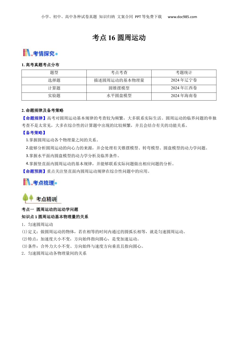 小学、初中、高中各种试卷真题知识归纳文案合同PPT等免费下载www.doc985.com考点16圆周运动1.高考真题考点分布题型考点考查考题统计选择题描述圆周运动的基本物理量2024年辽宁卷计算题圆锥摆模型2024年江西卷实验题水平圆盘模型2024年海南卷2.命题规律及备考策略【命题规律】高考对圆周运动基本规律的考查较为频繁,大多联系实际生活。圆周运动的临界问题的单独考查不是太常见,大多在综合性的计算题中出现的比较频繁,并且会结合有关的功能关系。【备考策略】1.掌握圆周运动各个物理量之间的关系。2.能够分析圆周运动的向心力的来源,并会处理有关锥摆模型、转弯模型、圆盘模型的动力学问题。3.掌握水平面内圆盘模型的动力学分析及临界条件。4.掌握竖直面内圆周运动的基本规律,并能够联系实际问题做出相应问题的分析。【命题预测】重点关注竖直面内圆周运动规律在综合性问题中的应用。考点一圆周运动的运动学问题知识点1圆周运动基本物理量的关系1.匀速圆周运动(1)定义:做圆周运动的物体,若在相等的时间内通过的圆弧长相等,就是匀速圆周运动。(2)特点:加速度大小不变,方向始终指向圆心,是变加速运动。(3)条件:合外力大小不变、方向始终与速度方向垂直且指向圆心。2.匀速圆周运动各物理量间的关系小学、初中、高中各种试卷真题知识归纳文案合同PPT等免费下载www.doc985.com知识点2三种传动方式及特点1.皮带传动(甲乙):皮带与两轮之间无相对滑动时,两轮边缘线速度大小相等。2.齿轮传动(丙):两轮边缘接触,接触点无打滑现象时,两轮边缘线速度大小相等。3.同轴传动(丁):两轮固定在同一转轴上转动时,两轮转动的角速度大小相等。考向1圆周运动基本物理量的关系1.走时准确的时钟如图所示,A、B分别为时针和分针上到轴心距离相等的点,关于A、B两点下列说法正确的是()A.A点线速度大B.B点角速度大C.周期相同D.加速度相同2.运球转身是篮球运动中重要的技术动作。如图甲所示为运动员运球转身的瞬间,此时运动员和篮球保持相对静止绕OO′轴转动,手臂上的A点与篮球边缘的B点到转轴的距离之比,下列说法正确的是()小学、初中、高中各种试卷真题知识归纳文案合同PPT等免费下载www.doc985.comA.A、B两点角速度大小之比B.A、B两点的线速度大小之比C.A、B两点的周期之比D.A、B两点的向心加速度大小之比考向2三种传动方式及特点3.如图所示是一皮带传动装置示意图,右轮半径为r,A是它边缘上的一点;左侧是一轮轴,大轮半径为4r,小轮半径为2r,B点在小轮上,到轮轴的距离为r。C点和D点分别位于小轮和大轮的边缘上。如果传动过程中皮带不打滑,则关于A、B、C、D四点的比较,下列说法正确的是()A.B.C.D.4.明代出版的《天工开物》一书中记载:“其湖池不流水,或以牛力转盘,或聚数人踏转。”并附有牛力齿轮翻车的图画如图所示,翻车通过齿轮传动,将湖水翻入农田。已知A、B齿轮啮合且齿轮之间不打滑,B、C齿轮同轴,若A、B、C三齿轮半径的大小关系为,则()小学、初中、高中各种试卷真题知识归纳文案合同PPT等免费下载www.doc985.comA.齿轮A的角速度比齿轮B的角速度大B.齿轮A、B的角速度大小相等C.齿轮B、C边缘的点的线速度大小相等D.齿轮A边缘的点的线速度与齿轮B边缘的点的线速度大小相等考点二圆周运动的动力学问题知识点1向心力的来源及运动模型1.向心力:(1)来源:向心力是按力的作用效果命名的,可以是重力、弹力、摩擦力等各种力,也可以是几个力的合力或某个力的分力,在受力分析中要避免再另外添加一个向心力。(2)公式:Fn=man=m=mω2r=mr·=mr·4π2f2=mωv。2.运动模型运动模型向心力的来源示意图运动模型向心力的来源示意图飞机水平转弯飞车走壁圆锥摆火车转弯汽车在水平路面转弯水平转台(光滑)知识点2圆周运动动力学分析过程小学、初中、高中各种试卷真题知识归纳文案合同PPT等免费下载www.doc985.com考向1锥摆模型5.如图所示为游乐场“丛林飞椅”游戏的简化模型,A小球绕轴在水平面内做匀速圆周运动,则关于A小球受力分析正确的是()A.受到的合力方向指向B.受到重力、拉力和向心力的作用C.细绳对小球的拉力大于小球受...