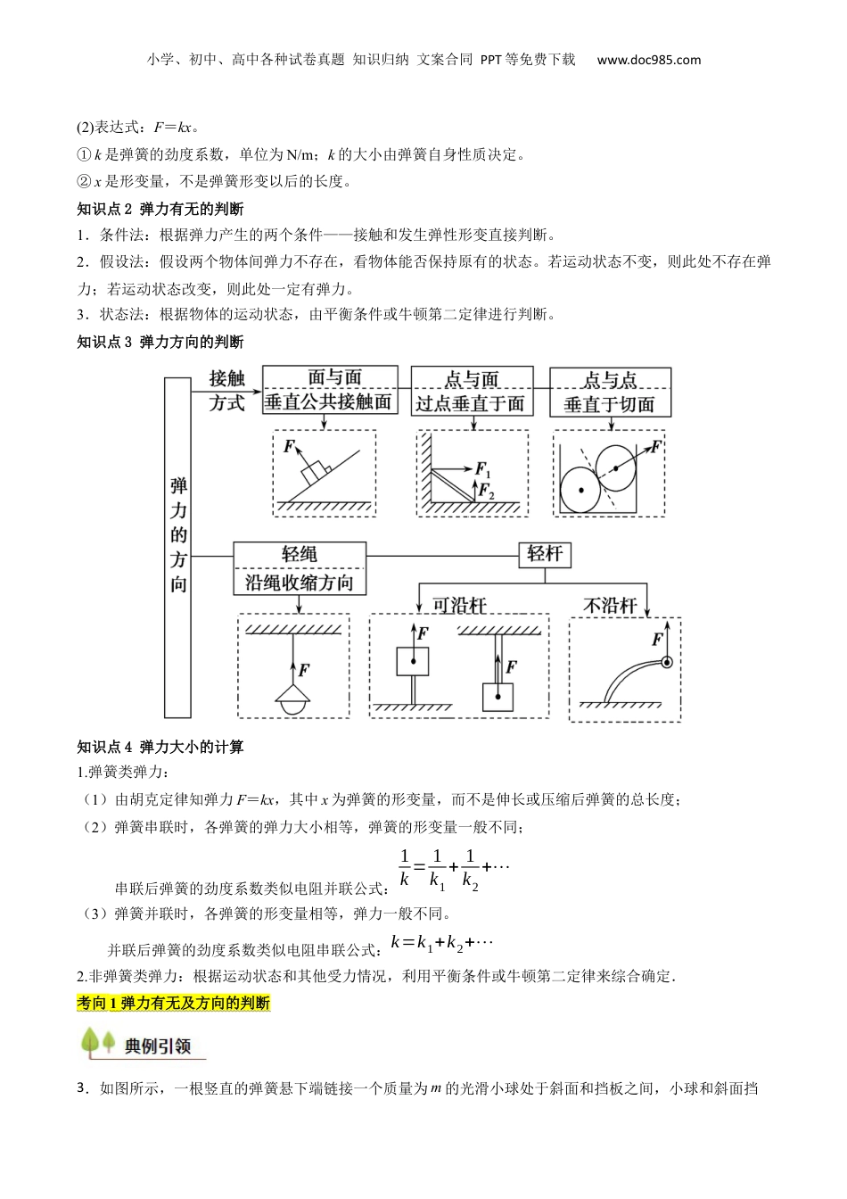 小学、初中、高中各种试卷真题知识归纳文案合同PPT等免费下载www.doc985.com考点06重力弹力摩擦力1.高考真题考点分布题型考点考查考题统计选择题重力和重心2022年1月浙江卷选择题弹力2023年山东卷选择题摩擦力2024年辽宁卷、广西卷2.命题规律及备考策略【命题规律】高考对这部分的考查频率不是特别的高,对于这三种力的考查大多贯穿在整个高中物理的所有力学问题中。【备考策略】1.理解重力及重心的概念。2.会判断弹力的方向和求其大小。3.掌握和理解摩擦力方向的判断和大小的求解【命题预测】重点关注三种性质力在重力场、电场、磁场中平衡和非平衡状态的分析,特别要注意摩擦力。考点一重力知识点重力和重心1.产生:由于地球的吸引而使物体受到的力.2.大小:G=mg.3.方向:总是竖直向下.4.重心:因为物体各部分都受重力的作用,从效果上看,可以认为各部分受到的重力作用集中于一点,这一点叫做物体的重心,其位置与物体的质量分布和形状有关。特别提醒:(1)重力的方向不一定指向地心.(2)并不是只有重心处才受到重力的作用.考向重力和重心的理解1.下列关于重力和重心的说法正确的是()A.形状规则的物体的重心在几何中心上小学、初中、高中各种试卷真题知识归纳文案合同PPT等免费下载www.doc985.comB.物体的重心不一定在物体上C.地球表面所有物体受到的重力方向都相同D.只有物体的重心才受到重力的作用【答案】B【详解】A.形状规则且质量分布均匀的物体的重心在几何中心上,选项A错误;B.物体的重心不一定在物体上,也可能在物体的外部,例如圆环,选项B正确;C.重力的方向是竖直向下,所以在地球上不同的位置,重力的方向是不同的,故C错误;D.重心是重力的等效作用点,并不是只有物体的重心才受到重力的作用,选项D错误。故选B。2.如图所示,正方形网格框中有一个质量均匀分布的薄板。若用一细线穿过其边缘附近任意一点将它悬挂在空中,则细线的延长线一定通过图中的()A.B.C.D.【答案】D【详解】薄板质量分布均匀,由图可知当吊起B点时,沿着OB这条线,两边图形等底等高,面积相同,则质量相同,即中心在沿OB直线上;同理,当吊起C点时,沿着OC这条线两边图像面积相同,质量相同,重心在沿OC直线上;所以可知O点为该薄板的重心,细线的延长线一定通过图中的O点。故选D。考点二弹力知识点1弹力和胡克定律1.弹力(1)定义:发生形变的物体,要恢复原状,对与它接触的物体会产生力的作用,这种力叫作弹力。(2)产生条件:物体相互接触且发生弹性形变。(3)方向:弹力的方向总是与作用在物体上使物体发生形变的外力方向相反。2.胡克定律(1)内容:在弹性限度内,弹簧发生弹性形变时,弹力F的大小跟弹簧伸长(或缩短)的长度x成正比。小学、初中、高中各种试卷真题知识归纳文案合同PPT等免费下载www.doc985.com(2)表达式:F=kx。①k是弹簧的劲度系数,单位为N/m;k的大小由弹簧自身性质决定。②x是形变量,不是弹簧形变以后的长度。知识点2弹力有无的判断1.条件法:根据弹力产生的两个条件——接触和发生弹性形变直接判断。2.假设法:假设两个物体间弹力不存在,看物体能否保持原有的状态。若运动状态不变,则此处不存在弹力;若运动状态改变,则此处一定有弹力。3.状态法:根据物体的运动状态,由平衡条件或牛顿第二定律进行判断。知识点3弹力方向的判断知识点4弹力大小的计算1.弹簧类弹力:(1)由胡克定律知弹力F=kx,其中x为弹簧的形变量,而不是伸长或压缩后弹簧的总长度;(2)弹簧串联时,各弹簧的弹力大小相等,弹簧的形变量一般不同;串联后弹簧的劲度系数类似电阻并联公式:1k=1k1+1k2+⋯(3)弹簧并联时,各弹簧的形变量相等,弹力一般不同。并联后弹簧的劲度系数类似电阻串联公式:k=k1+k2+⋯2.非弹簧类弹力:根据运动状态和其他受力情况,利用平衡条件或牛顿第二定律来综合确定.考向1弹力有无及方向的判断3.如图所示,一根竖直的弹簧悬下端链接一个质量为m的光滑小球处于斜面和挡板之间,小球和斜面挡小学、初中、高中各种试卷真题知识归纳文案合同PPT等免费下载www.doc985.com板均接触,下列说法正确的是()A.若小球和斜面之间有弹力,则...