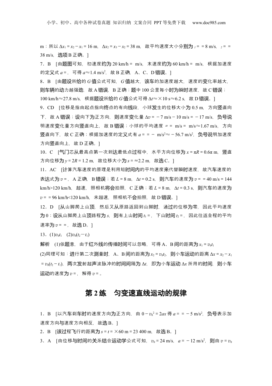 小学、初中、高中各种试卷真题知识归纳文案合同PPT等免费下载www.doc985.com一轮复习88练答案精析第一章运动的描述匀变速直线运动的研究第1练运动的描述1.B[究航天在外的姿,航天的体和形不能忽略,航天不可以研员舱态时员积状员视为质点,故A;究神舟十三船地球行的周期,神舟十三船的体和形错误研号飞绕运时号飞积状可以忽略,船可以点,故飞视为质B正确;神舟十三船天和核心完成自主接号飞与舱对过程,神舟十三船的体和形不可以忽略,不可以点,故号飞积状视为质C;王平在空错误亚站中冰墩墩抛出,相船冰墩墩做速直,因船相地面做速周,间将对飞匀线运动飞对匀圆运动以地面考系,冰墩墩不做速直,故则为参匀线运动D。错误]2.C[“神舟十五号”船和空站飞间“天和”核心成功接后,在地球做周舱对轨绕圆运动,地球考系,二者都是的,选为参运动A、B;错误“神舟十五号”船和空站飞间“天和”核心成功接后,二者相止,舱对对静C正确,D。错误]3.ABC[由a=可知,加速度是描述物体速度化快慢的物理量,所以高速行的运动变驶赛,加速度可能是零,也可能不是零,车A正确;汽的一瞬,汽由止始,车启动间车静开运动汽的速度一定生化,所以加速度一定不零,车发变为B正确;汽得越快,明汽的车启动说车速度化越快,加速度越大,变C正确;汽的加速度-车为5m/s2,加速度中的正、表示负号加速度方向,若汽方向加速度方向相同,汽做加速,若不同,汽做速车运动与车运动车减运,动D。错误]4.A[由于中据是手机步器的去周恩念的情,因此其中题图数计记录国庆节来纪馆运动况的8.52公里同迹的度,故中的为该学运动轨长题图8.52公里路程,故为B;根据意错误题可知,01:11:05手机步器的的,因此中的为计记录运动总时间题图01:11:05为时间间隔,故C;根据上述可知,错误7.19km/h指路程的比,即中总与总时间值题图7.19km/h为平均速率,故A正确;中消耗量题图热370.6的位焦耳,故单为D。错误]5.C[无人机在10s的路程内为s=40m+30m=70m,则10s的平均速率内为1==m/s=7m/s,A、B;由位移的定可知,无人机在错误义10s的位移内为x=m=50m,则10s的平均速度大小内为==m/s=5m/s,C正确,D。错误]6.B[由x=(5+2t3)m可知,t1=0,时x1=5m;t2=2s,时x2=21m;t3=3s,时x3=59小学、初中、高中各种试卷真题知识归纳文案合同PPT等免费下载www.doc985.comm;所以Δx1=x2-x1=16m,Δx2=x3-x2=38m,故平均速度大小分别为1==8m/s,2==38m/s,选项B正确。]7.B[由可知,初速度题图约为20km/h=m/s,末速度约为60km/h=m/s,根据加速度的定式义a=,可得a≈1.4m/s2,故B正确,A、C、D。错误]8.B[由所的题设给G公式可知,值G越大,的加速度越大,速度的化率越大,值该车变的力越强,故则车辆动劲A,错误B正确;中题100公里每小瞬速度,故时为时C;错误100km/h≈27.8m/s,根据所的题设给G公式可得值Δt≈×10s≈6.2s,故D。错误]9.CD[位移是指由起点指向点的有向段,小球生的位移大小终线发为0.5m,方向直向竖下,故A;向下正方向,速度化量错误设为则变Δv=-7m/s-10m/s=-17m/s,负号说明速度化量方向直向上,故变竖B;小球的平均速度错误==m/s=m/s≈1.67m/s,方向直向下,故竖C正确;根据加速度的定式有义a==-m/s2≈-56.7m/s2,明加速度负号说方向直向上,故竖D正确。]10.C[芯最高点第一次到最低点程中,水平方向位移气门从达过为x=πR=0.6πm,直竖方向位移为y=2R=1.2m,故位移大小为s=≈2.2m,故选C。]11.AC[算汽速度的原理是利用短的平均速度代替瞬速度,故汽速度的计车时间内来时车表式达为v=,A正确,B;若错误L=8m,Δt=0.2s,汽的速度则车为v==40m/s=144km/h>120km/h,超速,照相机拍照,将会C正确;若L=8m,Δt=0.3s,汽的速度则车为v==96km/h<120km/h,未超速,照相机不拍照,故会D。错误]12.D[山脚爬上山,然后又原路返回到山脚,通的位移零,因此平均速度从顶从时过为为0;山脚爬上山路程设从顶为s,有上山则时间t1=,下山时间t2=,因此往返全程的平均速率为v==,故选D。]13.(1)v0t1(2)v0(t2-t1)解析(1)依意,由于外的播可以忽略,可得...