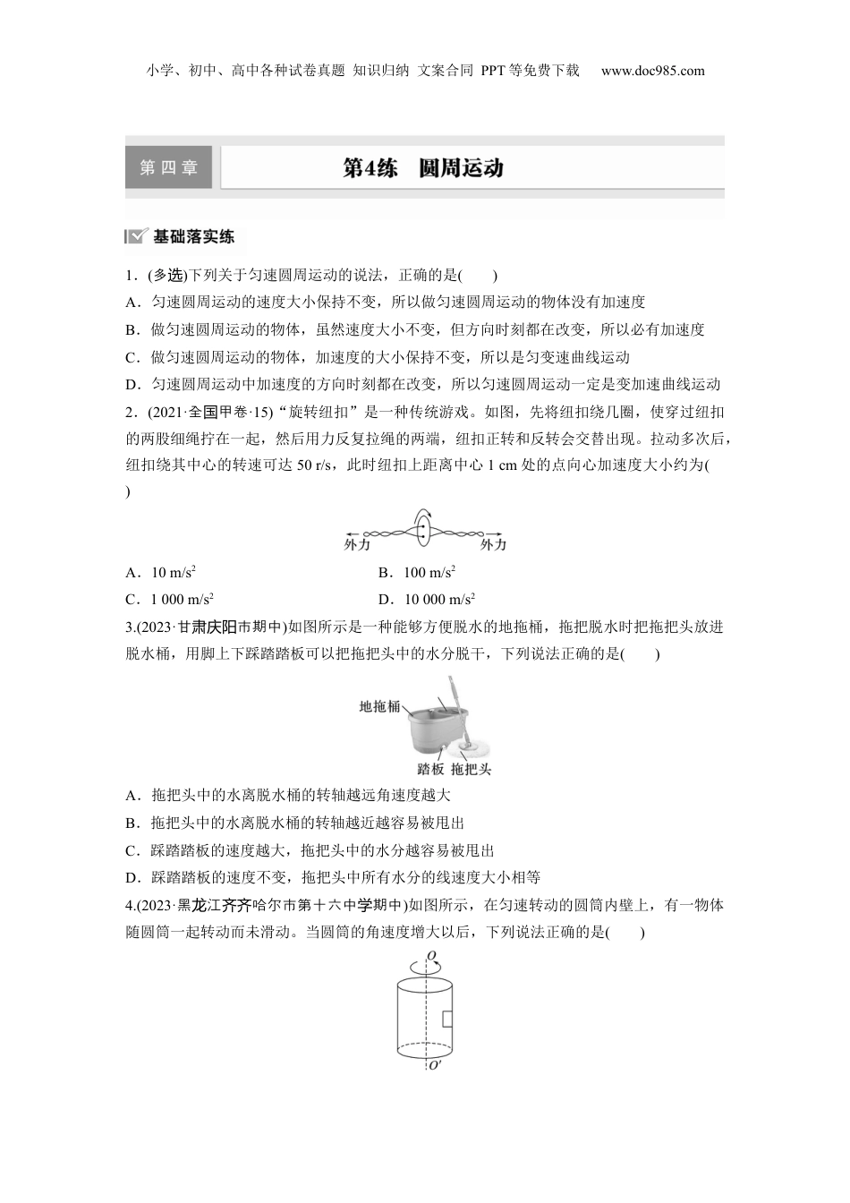 小学、初中、高中各种试卷真题知识归纳文案合同PPT等免费下载www.doc985.com1.(多选)下列关于匀速圆周运动的说法,正确的是()A.匀速圆周运动的速度大小保持不变,所以做匀速圆周运动的物体没有加速度B.做匀速圆周运动的物体,虽然速度大小不变,但方向时刻都在改变,所以必有加速度C.做匀速圆周运动的物体,加速度的大小保持不变,所以是匀变速曲线运动D.匀速圆周运动中加速度的方向时刻都在改变,所以匀速圆周运动一定是变加速曲线运动2.(2021·全甲卷国·15)“旋转纽扣”是一种传统游戏。如图,先将纽扣绕几圈,使穿过纽扣的两股细绳拧在一起,然后用力反复拉绳的两端,纽扣正转和反转会交替出现。拉动多次后,纽扣绕其中心的转速可达50r/s,此时纽扣上距离中心1cm处的点向心加速度大小约为()A.10m/s2B.100m/s2C.1000m/s2D.10000m/s23.(2023·甘市期中肃庆阳)如图所示是一种能够方便脱水的地拖桶,拖把脱水时把拖把头放进脱水桶,用脚上下踩踏踏板可以把拖把头中的水分脱干,下列说法正确的是()A.拖把头中的水离脱水桶的转轴越远角速度越大B.拖把头中的水离脱水桶的转轴越近越容易被甩出C.踩踏踏板的速度越大,拖把头中的水分越容易被甩出D.踩踏踏板的速度不变,拖把头中所有水分的线速度大小相等4.(2023·黑江哈尔市第十六中期中龙齐齐学)如图所示,在匀速转动的圆筒内壁上,有一物体随圆筒一起转动而未滑动。当圆筒的角速度增大以后,下列说法正确的是()小学、初中、高中各种试卷真题知识归纳文案合同PPT等免费下载www.doc985.comA.物体所受弹力增大,摩擦力不变B.物体所受弹力增大,摩擦力减小C.物体所受弹力和摩擦力都增大D.物体所受弹力和摩擦力都减小5.(2023·全甲卷国·17)一质点做匀速圆周运动,若其所受合力的大小与轨道半径的n次方成正比,运动周期与轨道半径成反比,则n等于()A.1B.2C.3D.46.(2021·北京卷·10)如图所示,圆盘在水平面内以角速度ω绕中心轴匀速转动,圆盘上距轴r处的P点有一质量为m的小物体随圆盘一起转动。某时刻圆盘突然停止转动,小物体由P点滑至圆盘上的某点停止。下列说法正确的是()A.圆盘停止转动前,小物体所受摩擦力的方向沿运动轨迹切线方向B.圆盘停止转动前,小物体运动一圈所受摩擦力的冲量大小为2mωrC.圆盘停止转动后,小物体沿圆盘半径方向运动D.圆盘停止转动后,小物体整个滑动过程所受摩擦力的冲量大小为mωr7.(2023·浙江杭州市期中)齿轮传动是现代各种设备中应用最广泛的一种机械传动方式。它具有传动效率高,结构紧凑,工作可靠,寿命长等优点。如图甲所示为某款机械手表内部的部分结构图,A、B、C三个传动轮通过齿轮咬合,C、D与轴承咬合,A、B、C、D为四个轮子,现将其简化成如图乙所示模型。a、b、c、d分别为A、B、C、D轮缘上的点,半径之比ra∶rb∶rc∶rd=2∶1∶2∶1。则()A.va∶vb=2∶1B.ωc∶ωd=2∶1C.aa∶ab=2∶1D.Tc∶Td=1∶18.(2023·四川市一绵阳诊)如图为带车牌自动识别系统的直杆道闸,离地面高为1m的细直杆可绕O在竖直面内匀速转动。汽车从自动识别线ab处到达直杆处的时间为2.3s,自动识别系统的反应时间为0.3s;汽车可看成高1.6m的长方体,其左侧面底边在aa′直线上,且O到汽车左侧面的距离为0.6m,要使汽车安全通过道闸,直杆转动的角速度至少为()小学、初中、高中各种试卷真题知识归纳文案合同PPT等免费下载www.doc985.comA.rad/sB.rad/sC.rad/sD.rad/s9.(多选)(2023·广汕市期中东头)如图所示,趣味飞镖游戏的镖盘以角速度ω绕过O点的水平轴匀速转动,某人将一枚飞镖正对盘边缘P点(O点正上方)以水平速度v0掷出,恰好击中P点。不计空气阻力,飞镖每次从同一位置正对P点水平掷出,下列说法正确的是()A.仅增大v0,飞镖仍可能击中P点B.仅减小v0,飞镖不可能击中镖盘C.仅增大ω,飞镖仍可能击中P点D.减小ω和v0,飞镖仍可能击中P点10.(2022·福建卷·13)清代乾隆的《冰嬉赋》用“躄躠”(可理解为低身斜体)二字揭示了滑冰的动作要领。500m短道速滑世界纪录由我国运动员武大靖创造并保持。在其创造纪录的比赛中,(1)武大靖从静止出发,先沿直道加速滑行,前8m用时2s。该过程...