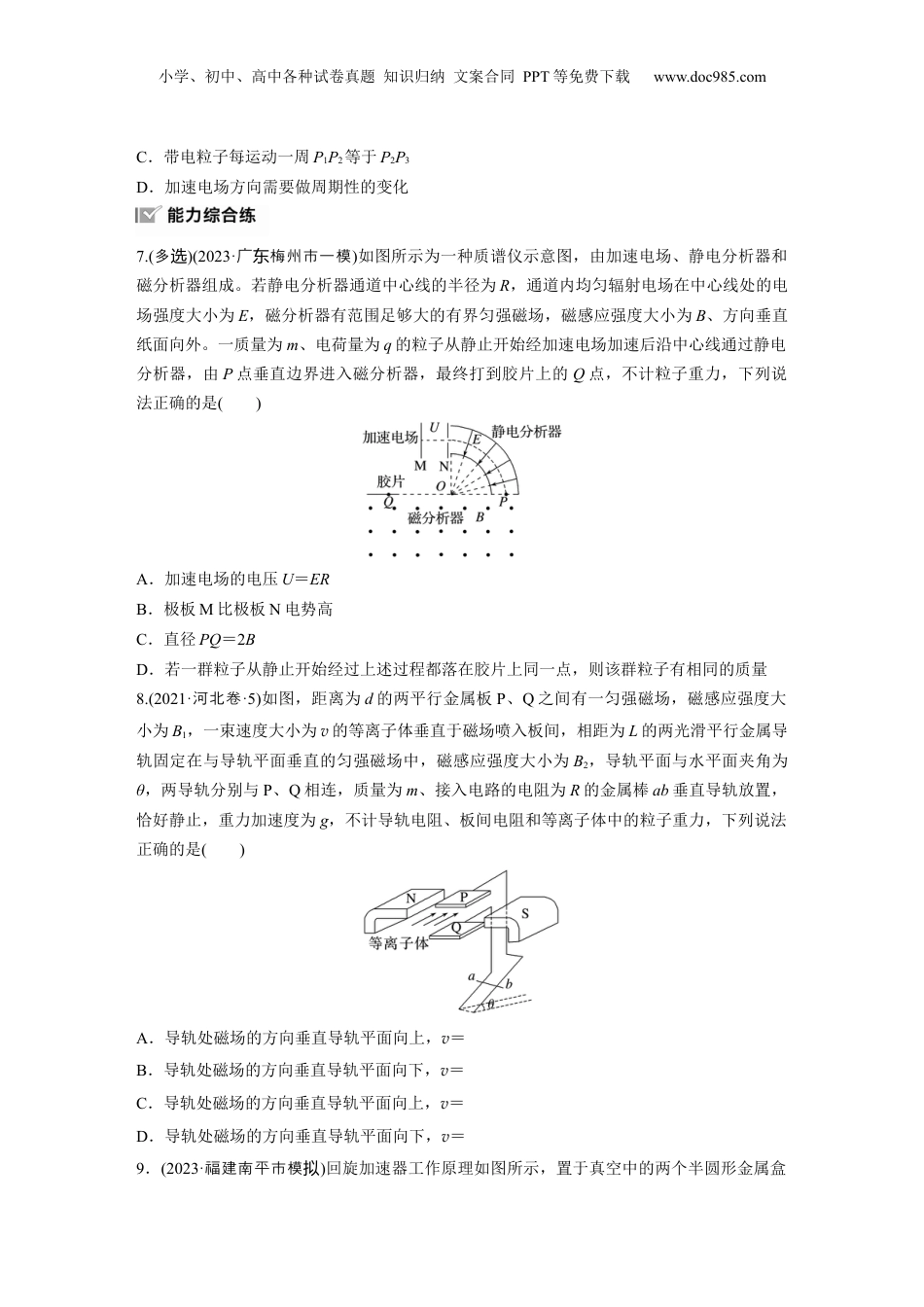 小学、初中、高中各种试卷真题知识归纳文案合同PPT等免费下载www.doc985.com1.(2023·广卷东·5)某小型医用回旋加速器,最大回旋半径为0.5m,磁感应强度大小为1.12T,质子加速后获得的最大动能为1.5×107eV。根据给出的数据,可计算质子经该回旋加速器加速后的最大速率约为(忽略相对论效应,1eV=1.6×10-19J)()A.3.6×106m/sB.1.2×107m/sC.5.4×107m/sD.2.4×108m/s2.(2021·福建卷·2)一对平行金属板中存在匀强电场和匀强磁场,其中电场的方向与金属板垂直,磁场的方向与金属板平行且垂直纸面向里,如图所示。一质子(H)以速度v0自O点沿中轴线射入,恰沿中轴线做匀速直线运动。下列粒子分别自O点沿中轴线射入,能够做匀速直线运动的是(所有粒子均不考虑重力的影响)()A.以速度射入的正子电(e)B.以速度v0射入的电子(e)C.以速度2v0射入的氘核(H)D.以速度4v0射入的α粒子(He)3.(多选)(2023·天津市期末)调查组在某化工厂的排污管末端安装了流量计,其原理可以简化为如图所示模型:污水内含有大量正、负离子,从直径为d的圆柱形容器左侧流入,右侧流出,流量值Q等于单位时间通过横截面的液体体积。空间有垂直纸面向里、磁感应强度大小为B的匀强磁场,下列说法正确的是()A.若污水中正离子较多,则a侧电势比b侧电势高B.若污水中负离子较多,则a侧电势比b侧电势低C.污水中离子浓度越高,流量显示仪器的示数越大D.只需要再测出a、b两点电压就能够推算污水的流量值Q4.(2023·河北州市期末沧)自行车速度计可以利用霍尔效应传感器获知自行车车轮的运动速率。如图甲所示,一块磁体安装在前轮上,轮子每转一圈,磁体就靠近传感器一次,传感器就会输出一个脉冲电压。如图乙所示,电源输出电压为U1,当磁场靠近霍尔元件时,在导小学、初中、高中各种试卷真题知识归纳文案合同PPT等免费下载www.doc985.com体前后表面间出现电势差U2(前表面的电势低于后表面的电势)。下列说法中错误的是()A.图乙中霍尔元件的载流子带负电B.已知自行车车轮的半径,再根据单位时间内的脉冲数,即获得车速大小C.若传感器的电源输出电压U1变大,则U2变大D.若自行车的车速越大,则U2越大5.(2023·江常州市模苏拟)如图所示,电荷量相等的两种离子氖20和氖22先后从容器A下方的狭缝S1飘入(初速度为零)电场区,经电场加速后通过狭缝S2、S3垂直于磁场边界MN射入匀强磁场,磁场方向垂直纸面向里,离子经磁场偏转后轨迹发生分离,最终到达照相底片D上。不考虑离子重力及离子间的相互作用,则()A.静电力对每个氖20和氖22做的功不相等B.氖22进入磁场时的速度较大C.氖22在磁场中运动的半径较小D.若加速电压发生波动,两种离子打在照相底片上的位置可能重叠6.如图为一种改进后的回旋加速器示意图,其中盒缝间的加速电场电场强度大小恒定,且被限制在AC板间,虚线中间不需加电场,带电粒子从P0处以速度v0沿电场线方向射入加速电场,经加速后再进入D形盒中做匀速圆周运动,对这种改进后的回旋加速器,下列说法正确的是()A.加速粒子的最大速度与D形盒的尺寸无关B.带电粒子每运动一周被加速一次小学、初中、高中各种试卷真题知识归纳文案合同PPT等免费下载www.doc985.comC.带电粒子每运动一周P1P2等于P2P3D.加速电场方向需要做周期性的变化7.(多选)(2023·广梅州市一模东)如图所示为一种质谱仪示意图,由加速电场、静电分析器和磁分析器组成。若静电分析器通道中心线的半径为R,通道内均匀辐射电场在中心线处的电场强度大小为E,磁分析器有范围足够大的有界匀强磁场,磁感应强度大小为B、方向垂直纸面向外。一质量为m、电荷量为q的粒子从静止开始经加速电场加速后沿中心线通过静电分析器,由P点垂直边界进入磁分析器,最终打到胶片上的Q点,不计粒子重力,下列说法正确的是()A.加速电场的电压U=ERB.极板M比极板N电势高C.直径PQ=2BD.若一群粒子从静止开始经过上述过程都落在胶片上同一点,则该群粒子有相同的质量8.(2021·河北卷·5)如图,距离为d的两平行金属板P、Q之间有一匀强磁场,磁感应强度大小为B1,一束速度大小为v的等离子体垂直于磁场喷入板间,相距为L的两光滑平行金属导轨固定在与导轨平...