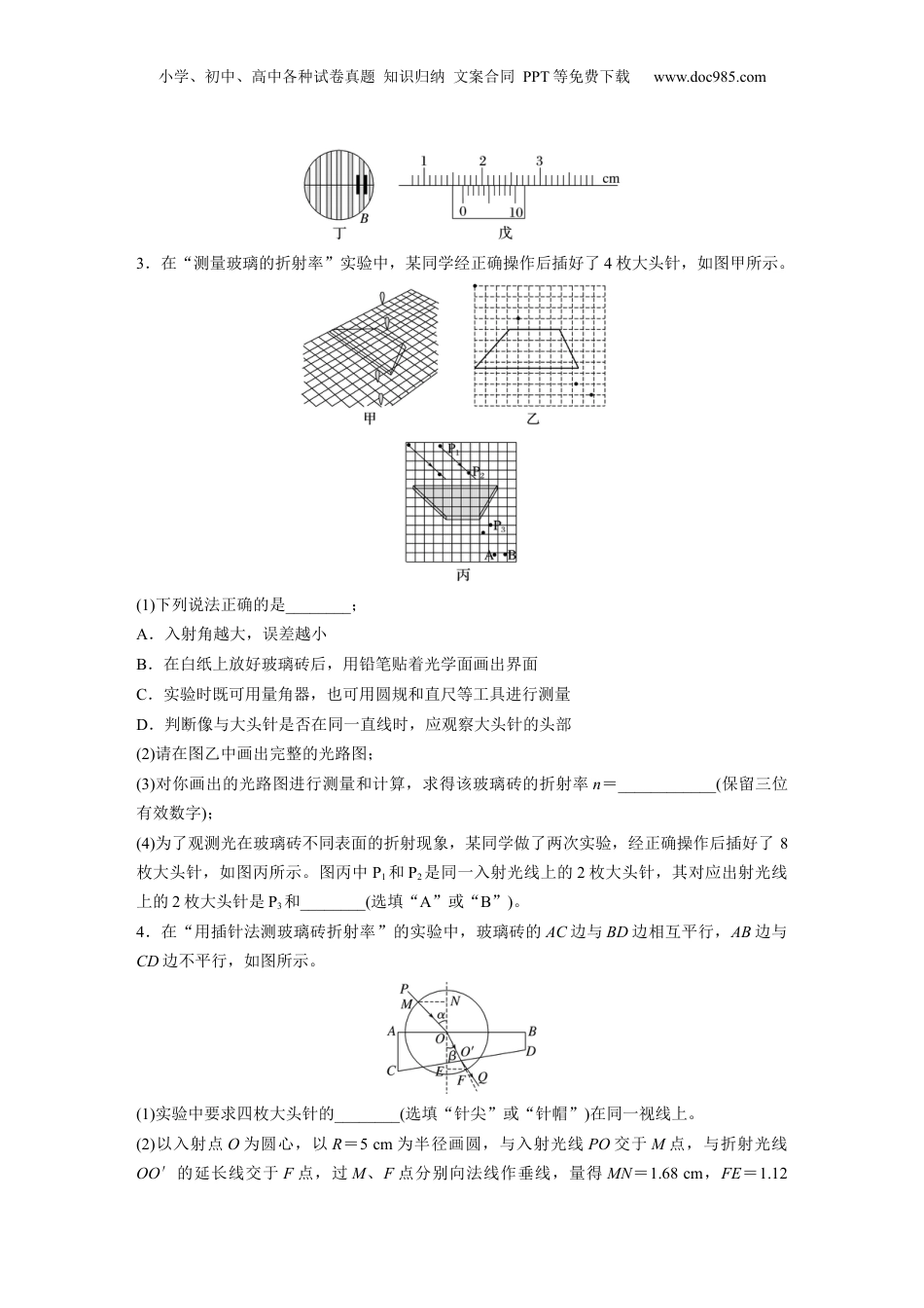 小学、初中、高中各种试卷真题知识归纳文案合同PPT等免费下载www.doc985.com1.(2023·山西仁市第一中二模怀学)如图甲所示的双缝干涉实验,用绿光照射单缝S时,在屏上观察到如图乙所示的条纹,仅改变一个实验条件后,观察到的条纹如图丙所示,则改变的实验条件可能是()A.减小双缝到光屏之间的距离B.增大双缝之间的距离C.将绿光换为红光D.减小光源到单缝的距离2.(2023·江西宜春市第一中期末学)在“用双缝干涉测光的波长”实验中,将实验仪器按要求安装在光具座上,如图甲所示。(1)关于该实验,下列说法正确的是________;A.单缝及双缝必须平行放置B.干涉条纹与双缝垂直C.干涉条纹疏密程度与单缝宽度有关D.若用绿色滤光片替换红色滤光片,干涉条纹间距会变小(2)某同学在做该实验时,在同一视野中选取了A、B两条纹,第一次分划板中心刻度对齐A条纹中心时(图乙),游标卡尺的示数如图丙所示;第二次分划板中心刻度对齐B条纹中心时(图丁),游标卡尺的示数如图戊所示。已知双缝间距为0.50mm,双缝到屏的距离为1.00m,则图丙游标卡尺的示数为________mm,两个相邻亮条纹(或暗条纹)间的距离为________mm。所测单色光波长为________m。小学、初中、高中各种试卷真题知识归纳文案合同PPT等免费下载www.doc985.com3.在“测量玻璃的折射率”实验中,某同学经正确操作后插好了4枚大头针,如图甲所示。(1)下列说法正确的是________;A.入射角越大,误差越小B.在白纸上放好玻璃砖后,用铅笔贴着光学面画出界面C.实验时既可用量角器,也可用圆规和直尺等工具进行测量D.判断像与大头针是否在同一直线时,应观察大头针的头部(2)请在图乙中画出完整的光路图;(3)对你画出的光路图进行测量和计算,求得该玻璃砖的折射率n=____________(保留三位有效数字);(4)为了观测光在玻璃砖不同表面的折射现象,某同学做了两次实验,经正确操作后插好了8枚大头针,如图丙所示。图丙中P1和P2是同一入射光线上的2枚大头针,其对应出射光线上的2枚大头针是P3和________(选填“A”或“B”)。4.在“用插针法测玻璃砖折射率”的实验中,玻璃砖的AC边与BD边相互平行,AB边与CD边不平行,如图所示。(1)实验中要求四枚大头针的________(选填“针尖”或“针帽”)在同一视线上。(2)以入射点O为圆心,以R=5cm为半径画圆,与入射光线PO交于M点,与折射光线OO′的延长线交于F点,过M、F点分别向法线作垂线,量得MN=1.68cm,FE=1.12小学、初中、高中各种试卷真题知识归纳文案合同PPT等免费下载www.doc985.comcm,则该玻璃砖的折射率n=________。(3)下列操作可以减小实验误差的是________。A.适当增大大头针P1、P2的间距B.选择玻璃砖相互平行的两边来测量C.选用尽可能细的笔画线D.使PO的入射角接近90°(4)某同学突发奇想用两块同样的玻璃直角三角形棱镜ABC来做实验,两者的AC面是平行放置的,插针P1、P2的连线垂直于AB面,若操作无误,则在图中右边的插针应该是________。A.P3、P6B.P3、P8C.P5、P6D.P7、P85.(2024·广广州市信中考东执学开学)某同学利用可伸缩万向支架、激光笔和长方体透明水槽测量水的折射率,如图所示,激光笔固定在万向支架上,调节高度和角度,使激光平行于水槽正立面(如图中所示的横截面),从水槽的左上角射入,用记号笔在水槽正立面记下激光在水槽底部的光点A。往水槽内缓慢注入清水,用记号笔在水槽正立面记下激光在水槽底部光点B(图中未画出)和水面CD的位置,在水槽正立面用记号笔画直线,连接水槽左上角和A点,相交CD于E点,用刻度尺分别测量EA的长度L1=20.0cm,EB的长度L2=15.0cm,水面CD距水槽底部高度h=12.0cm。由此可得:(1)B点处于A点的__________侧(选填“左”或“右”)。(2)激光入射角的正弦值sini=__________(结果保留两位有效数字)。(3)水的折射率n=__________(结果保留三位有效数字)。6.寒假期间小明利用图甲所示的物品,测量了某型号刀片的厚度。实验过程如下:(1)点燃蜡烛,用蜡烛火焰把玻璃片的一面熏黑;(2)并齐捏紧两片刀片,在玻璃片的熏黑面划出两条平直划痕;小学、初中、高中各种试卷真题知识归纳文案合同PPT等免费下载www.doc985.com(3)如图乙所...