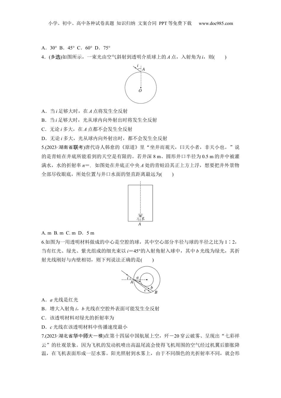 小学、初中、高中各种试卷真题知识归纳文案合同PPT等免费下载www.doc985.com训练1光的折射、全反射1.由两种不同单色光组成的一束复色光,沿图示方向从空气射向圆柱形玻璃砖,经过玻璃砖两次折射后射出,可能的光路是()2.(2023·江卷苏·5)地球表面附近空气的折射率随高度降低而增大,太阳光斜射向地面的过程中会发生弯曲。下列光路图中能描述该现象的是()3.(2023·山南市一模东济)如图甲所示,一细束白光通过某种特殊材料制成的三棱镜发生色散。图乙是其光路平面图,已知三棱镜的截面为等边三角形,白光由M点入射,入射角α=60°,其中红光对应的该材料的折射率为n=,则红光通过三棱镜后的出射光线与M点入射光线的夹角为()小学、初中、高中各种试卷真题知识归纳文案合同PPT等免费下载www.doc985.comA.30°B.45°C.60°D.75°4.(多选)如图所示,一束光由空气斜射到透明介质球上的A点,入射角为i,则()A.当i足够大时,在A点将发生全反射B.当i足够大时,光从球内向外射出时将发生全反射C.无论i多大,在A点都不会发生全反射D.无论i多大,光从球内向外射出时,都不会发生全反射5.(2023·湖南省考联)唐代诗人韩愈的《原道》里“坐井而观天,曰天小者,非天小也。”说的是青蛙在井底所能看到的天空是有限的。若井深8m、圆形井口半径为0.5m的井中被灌满水,水的折射率n=,如图处在井底正中央A处的青蛙沿其正上方上浮,想要把井外景物全部尽收眼底,所处位置与井口水面的竖直距离最远为()A.mB.mC.mD.5m6.如图为一用透明材料做成的中心是空腔的球,其中空心部分半径与球的半径之比为1∶2,当有红光、绿光、紫光组成的细光束以i=45°的入射角射入球中,其中b光线为绿光,其折射光线刚好与内壁相切,则下列说法正确的是()A.a光线是红光B.增大入射角i,b光线在空腔外表面可能发生全反射C.该透明材料对绿光的折射率为D.c光线在该透明材料中传播速度最小7.(2023·湖北省中大一模华师)在第十四届中国航展上空,歼-20穿云破雾、呈现出“七彩祥云”的壮观景象。因为飞机的发动机喷出高温尾流会使得飞机周围的空气经过机翼后膨胀降温,在飞机表面形成一层水雾。阳光照射到水雾上,由于不同颜色的光折射率不同,就会形小学、初中、高中各种试卷真题知识归纳文案合同PPT等免费下载www.doc985.com成七彩光芒。如图所示,将原理简化并作出光路图。已知a光与界面的夹角为30°,b光的折射率为,b光与法线的夹角为45°,光在空气中的传播速度为c,水雾半球的半径为R。a光在水雾半球中的传播时间为()A.B.C.D.8.光总是走时间最短的路径。我们在生活中如果也类比光的传播路径行动,会最快到达目的地。如图甲,你以恒定的速率从A点到B点过程中需要到河边取水,则类比光的反射路径时间最短。如图乙,小明在海滩上A处发现小张在海中B处呼救,已知小明在海滩上奔跑的速度为v1,在海水里游泳的速度为v2,v1>v2,那么小明应该沿图乙中哪条路线去救人用时最短()A.沿路线①,=,θ1、θ2分别为路线与海岸线的夹角B.沿路线②,沿AB连线方向直线前进,总路程最短C.沿路线③,=,α、β分别为路线与海岸线的夹角D.沿路线④,先到最接近B的海边,再垂直海岸到B,海水中路程最短9.(多选)(2023·湖南衡市三模阳)等腰三棱镜ABC的顶角为θ=30°,AB边的边长为L,光线DO射到AB边的中点O,当入射角i=45°时,光最后垂直AC边射出,已知光在真空中的传播速度为c,不考虑光的多次反射,则()A.三棱镜的折射率为B.光在三棱镜中的传播时间为C.换用频率更大的光仍以相同入射角照射到O点,则光在三棱镜中的传播时间一定变长D.换用频率更大的光仍以相同入射角照射到O点,则光在三棱镜中的传播时间可能不变小学、初中、高中各种试卷真题知识归纳文案合同PPT等免费下载www.doc985.com10.(2023·广广州市广中模东黄学拟)游轮上处于O点的人刚好看到潜艇在其正前方的水下缓慢通过,将人和潜艇均视为质点,如图所示,此时人到水面的高度h1=15m,潜艇的水下深度h2=23m。水的折射率为n=,sin53°=0.8,cos53°=0.6,求此时潜艇与人的水平距离。11.(2024·河南省模拟)如图所示,“水滴形”透明体其纵截面由...
