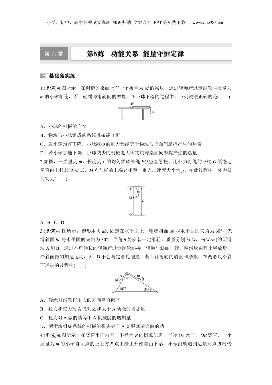 小学、初中、高中各种试卷真题知识归纳文案合同PPT等免费下载www.doc985.com1.(多选)如图所示,在粗糙的桌面上有一个质量为M的物块,通过轻绳跨过定滑轮与质量为m的小球相连,不计轻绳与滑轮间的摩擦,在小球下落的过程中,下列说法正确的是()A.小球的机械能守恒B.物块与小球组成的系统机械能守恒C.若小球匀速下降,小球减少的重力势能等于物块与桌面间摩擦产生的热量D.若小球加速下降,小球减少的机械能大于物块与桌面间摩擦产生的热量2.如图,一质量为m、长度为L的均匀柔软细绳PQ竖直悬挂。用外力将绳的下端Q缓慢地竖直向上拉起至M点,M点与绳的上端P相距,重力加速度大小为g。在此过程中,外力做的功为()A.B.C.D.3.(多选)如图所示,楔形木块abc固定在水平面上,粗糙斜面ab与水平面的夹角为60°,光滑斜面bc与水平面的夹角为30°,顶角b处安装一定滑轮。质量分别为M、m(M>m)的两滑块A和B,通过不可伸长的轻绳跨过定滑轮连接,轻绳与斜面平行。两滑块由静止释放后,沿斜面做匀加速运动,A、B不会与定滑轮碰撞。若不计滑轮的质量和摩擦,在两滑块沿斜面运动的过程中()A.轻绳对滑轮作用力的方向竖直向下B.拉力和重力对A做功之和大于A动能的增加量C.拉力对A做的功等于A机械能的增加量D.两滑块组成系统的机械能损失等于A克服摩擦力做的功4.(多选)如图所示,在竖直平面内有一半径为R的圆弧轨道,半径OA水平、OB竖直,一个质量为m的小球自A点的正上方P点由静止开始自由下落,小球沿轨道到达最高点B时恰小学、初中、高中各种试卷真题知识归纳文案合同PPT等免费下载www.doc985.com好对轨道没有压力。已知AP=2R,重力加速度为g,则小球从P点运动到B点的过程中()A.重力做功2mgRB.机械能减少mgRC.合外力做功mgRD.克服摩擦力做功mgR5.如图所示,平直木板AB倾斜放置,小物块与木板间的动摩擦因数由A到B均匀增大,小物块从A点由静止释放,恰好可以到达B点,小物块的加速度a、动能Ek、重力势能Ep和机械能E(取地面为零势能面)随下滑位移x变化的图像可能正确的是()6.(多选)(2024·福建漳州市第一次质检)为预防电梯缆绳断裂的安全事故,电梯井底和电梯上分别安装有缓冲弹簧和安全钳,装置简化如图所示。现质量为2000kg的电梯,因缆绳断裂而坠落,刚接触弹簧时的速度为4m/s,弹簧被压缩了2m时电梯停止运动,下落过程中安全钳提供给电梯17000N的滑动摩擦力。已知弹簧的弹性势能为Ep=kx2(k为弹簧的劲度系数,x为弹簧的形变量),不计空气阻力及弹簧自重,g取10m/s2。则()小学、初中、高中各种试卷真题知识归纳文案合同PPT等免费下载www.doc985.comA.整个运动过程中电梯一直处于失重状态B.整个运动过程电梯刚接触弹簧时速度最大C.该缓冲弹簧的劲度系数为11000N/mD.停止运动时安全钳提供给电梯的摩擦力为2000N7.(2024·浙江省第一次考联)某地区常年有风,风速基本保持在4m/s,该地区有一风力发电机,其叶片转动可形成半径为10m的圆面,若保持风垂直吹向叶片,空气密度为1.3kg/m3,风的动能转化为电能的效率为20%。现用这台风力发电机给一水泵供电,使水泵从地下10m深处抽水,水泵能将水抽到地面并以2m/s的速度射出,出水口的横截面积为0.1m2,水的密度为1×103kg/m3,水泵及电机组成的抽水系统效率为80%,π取3.14,则下列说法正确的是()A.该风力发电机的发电功率约为12.8kWB.每秒水流机械能增加400JC.风力发电机一天的发电量可供该水泵正常工作约2.4hD.若风速变为8m/s,则该风力发电机的发电功率变为原来的4倍8.(多选)(2023·州市三模贵贵阳)如图所示,倾斜成45°角的固定直杆上套有一质量为m的小球(可视为质点),小球可沿杆滑动,轻质弹性绳一端固定于O点,另一端连在小球上。将小球从弹性绳水平的位置M(此时弹性绳的长度为L)由静止释放,当小球运动到弹性绳与杆垂直的位置P时,弹性绳长度刚好为原长,小球沿杆下滑到弹性绳竖直的位置N时速度减为零。若弹性绳始终在弹性限度内且弹性绳弹力与其形变量成正比,重力加速度大小为g。下列说法正确的是()A.小球在P点时的加速度大小为gB.从M到P,小球克服摩擦力做的功为mgLC.小球在P点的动能等于从M到P弹性绳减小的弹性势能D.小球和...