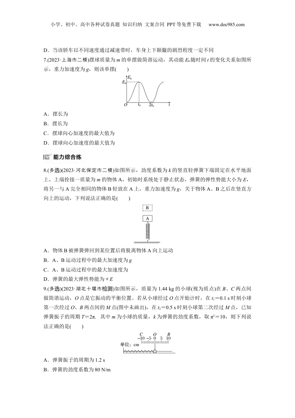 小学、初中、高中各种试卷真题知识归纳文案合同PPT等免费下载www.doc985.com1.如图所示,弹簧振子在A、B之间做简谐运动,O为平衡位置,测得A、B间距为6cm,小球完成30次全振动所用时间为60s,则()A.该振子振动周期是2s,振幅是6cmB.该振子振动频率是2HzC.小球完成一次全振动通过的路程是12cmD.小球过O点时开始计时,3s内通过的路程为24cm2.(2024·甘天水市期中肃)如图甲所示为以O点为平衡位置,在A、B两点间运动的弹簧振子,图乙为这个弹簧振子的振动图像,则下列说法正确的是()A.在t=0.2s时,弹簧振子的加速度为正向最大B.在t=0.1s与t=0.3s两个时刻,弹簧振子的速度相同C.从t=0到t=0.2s时间内,弹簧振子做加速度增大的减速运动D.在t=0.6s时,弹簧振子有最小的位移3.(2023·州遵市模贵义拟)如图所示,某小组同学用细线悬挂一个去掉柱塞的注射器,注射器内装满墨汁。注射器在小角度内摆动过程中,沿着垂直于注射器摆动的方向匀速拖动木板,注射器下端与木板距离很小。其中墨迹上A、B两点到OO′的距离均为注射器振幅的一半。不计空气阻力,则()A.在不同地方重复该实验,摆动周期一定相同B.注射器从A点上方摆到B点上方的时间小于周期摆动小学、初中、高中各种试卷真题知识归纳文案合同PPT等免费下载www.doc985.comC.注射器在A点上方与在B点上方时加速度相同D.在一个摆动周期内,形成墨迹的轨迹长度等于4倍振幅4.(2024·广西河池市考开学)如图甲所示,竖直悬挂弹簧振子在C、D两点之间做简谐运动,O点为平衡位置,振子到达D点开始计时,规定竖直向下为正方向。图乙是弹簧振子做简谐运动的x-t图像,则()A.弹簧振子从D点经过O点再运动到C点为一次全振动B.图乙中的P点时刻振子的速度方向与加速度方向都沿正方向C.弹簧振子的振动方程为x=0.1sin(2πt+)mD.弹簧振子在前2.5s内的路程为1m5.(2024·江江市苏镇检测)如图所示,固定在竖直平面内的光滑圆弧轨道对应的圆心角的度数很小,O是圆弧的最低点。两个完全相同的小球M、N(可视为质点)从圆弧左侧的不同位置同时释放。它们从释放到O点过程中都经过图中的P点。下列说法正确的是()A.M比N后到达O点B.M、N通过P点时所受的回复力相同C.M有可能在P点追上N并与之相碰D.从释放到O点过程中,重力对M的冲量比重力对N的冲量大6.(2023·广江市一模东门)轿车的“悬挂系统”是指由车身与轮胎间的弹簧及避震器组成的整个支持系统。已知某型号轿车“悬挂系统”的固有频率是2Hz。如图所示,这辆轿车正匀速通过某路口的条状减速带,已知相邻两条减速带间的距离为1.0m,该车经过该减速带过程中,下列说法正确的是()A.当该轿车通过减速带时,车身上下振动的频率均为2Hz,与车速无关B.该轿车通过减速带的速度越大,车身上下颠簸得越剧烈C.当该轿车以2m/s的速度通过减速带时,车身上下颠簸得最剧烈小学、初中、高中各种试卷真题知识归纳文案合同PPT等免费下载www.doc985.comD.当该轿车以不同速度通过减速带时,车身上下颠簸的剧烈程度一定不同7.(2023·上海市二模)摆球质量为m的单摆做简谐运动,其动能Ek随时间t的变化关系如图所示,重力加速度为g,则该单摆()A.摆长为B.摆长为C.摆球向心加速度的最大值为D.摆球向心加速度的最大值为8.(多选)(2023·河北保定市二模)如图所示,劲度系数为k的竖直轻弹簧下端固定在水平地面上,上端拴接一质量为m的物体A,初始时系统处于静止状态,弹簧的弹性势能大小为E,将另一与A完全相同的物体B轻放在A上,重力加速度为g,关于物体A、B之后在竖直方向上的运动,下列说法正确的是()A.物体B被弹簧弹回到某位置后将脱离物体A向上运动B.A、B运动过程中的最大加速度为gC.A、B运动过程中的最大加速度为D.弹簧的最大弹性势能为+E9.(多选)(2023·湖北十堰市检测)如图所示,质量为1.44kg的小球(视为质点)在B、C两点间做简谐运动,O点是它振动的平衡位置。若从小球经过O点开始计时,在t1=0.1s时刻小球第一次经过O、B两点间的M点(图中未画出),在t2=0.5s时刻小球第二次经过M点,已知弹簧振子的周期T=2π,其中m为小球的质量,k为弹簧的劲度系数,取π2=10,则下列说法正确的是()A.弹簧振子的...