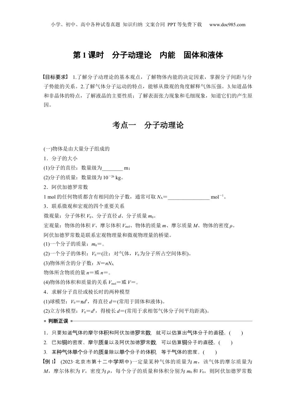 小学、初中、高中各种试卷真题知识归纳文案合同PPT等免费下载www.doc985.com考情分析试题情境生活实践类雾霾天气、高压锅、气压计、蛟龙号深海探测器、喷雾器、拔罐、保温杯、输液瓶、氧气分装等学习探究类分子动理论、固体和液体的性质、气体实验定律、热力学定律、用油膜法估测油酸分子的大小、探究等温情况下一定质量气体压强与体积的关系小学、初中、高中各种试卷真题知识归纳文案合同PPT等免费下载www.doc985.com第1课时分子动理论内能固体和液体目标要求1.了解分子动理论的基本观点,了解物体内能的决定因素,掌握分子间距与分子势能的关系。2.了解气体分子运动的特点,能够从微观的角度解释气体压强。3.知道晶体和非晶体的特点,了解液晶的主要性质;了解表面张力现象和毛细现象,知道它们的产生原因。考点一分子动理论(一)物体是由大量分子组成的1.分子的大小(1)分子的直径:数量级为________m;(2)分子的质量:数量级为10-26kg。2.阿伏加德罗常数1mol的任何物质都含有相同的分子数,通常可取NA=________________mol-1。3.联系微观和宏观的四个重要关系微观量:分子体积V0、分子直径d、分子质量m0。宏观量:物体的体积V、摩尔体积Vmol、物体的质量m、摩尔质量M、物体的密度ρ。阿伏加德罗常数是联系宏观物理量和微观物理量的桥梁。(1)一个分子的质量:m0=。(2)一个分子的体积:V0=(注:对气体,V0为分子所占空间体积)。(3)物体所含的分子数:N=nNA物体所含物质的量n=或n=。(4)物体的体积和质量的关系Vmol=或V=。4.求解分子直径或棱长时的两种模型(1)球模型:V0=πd3,得直径d=(常用于固体和液体)。(2)立方体模型:V0=d3,得棱长d=(常用于求相邻气体分子间平均距离)。1.只要知道体的摩尔体和阿伏加德常,就可以估算出体分子的直。气积罗数气径()2.已知的密度、摩尔量以及阿伏加德常,可以估算分子的直。铜质罗数铜径()3.某体分子的量除以分子的体,等于体的密度。种气单个质单个积气()例1(2023·北京市第十二中期中学)一定量某种气体的质量为m,该气体的摩尔质量为M,摩尔体积为V,密度为ρ,每个分子的质量和体积分别为m0和V0,则阿伏加德罗常数小学、初中、高中各种试卷真题知识归纳文案合同PPT等免费下载www.doc985.comNA可表示为()A.NA=B.NA=C.NA=D.NA=例2(2023·江云港市期中苏连)浙江大学高分子系制备出了一种超轻气凝胶——它刷新了目前世界上最轻固态材料的纪录。设该种气凝胶的密度为ρ(单位为kg/m3),摩尔质量为M(单位为kg/mol),阿伏加德罗常数为NA,求:(1)体积为V(单位为m3)的气凝胶中含有的分子数;(2)每个气凝胶分子的直径。________________________________________________________________________________________________________________________________________________________________________________________________________________________________________________________________________________________________________________________________________________________________________________________________________________________________________________________________________________________________________________________________________________________________________________________________________________________________________________________________________作宏量的摩尔量为观质Mmol、摩尔体积Vmol、密度ρ作微量的分子直与为观径d、分子量质m、每分子的体个积V0都可通阿伏加德常系起过罗数联来(如所示图)。(二)分子永不停息地做无规则运动1.扩散现象(1)定义:________种物质能够彼此进入对方的现象;(2)实质:扩散现象并不是外界作用引起的,也不是化学反应的结果,而是由物质分子的无规则运动产生的物质迁移现象,温度________,扩散得越快。2.布朗运动(1)定义:悬浮________的无规则运动;(2)实质:布朗运动反映了________________的无规则运动;(3)特点:微粒越________,运动越明显;温度越________,运动越明显。3.热运动(1)分子永不停息的____________...